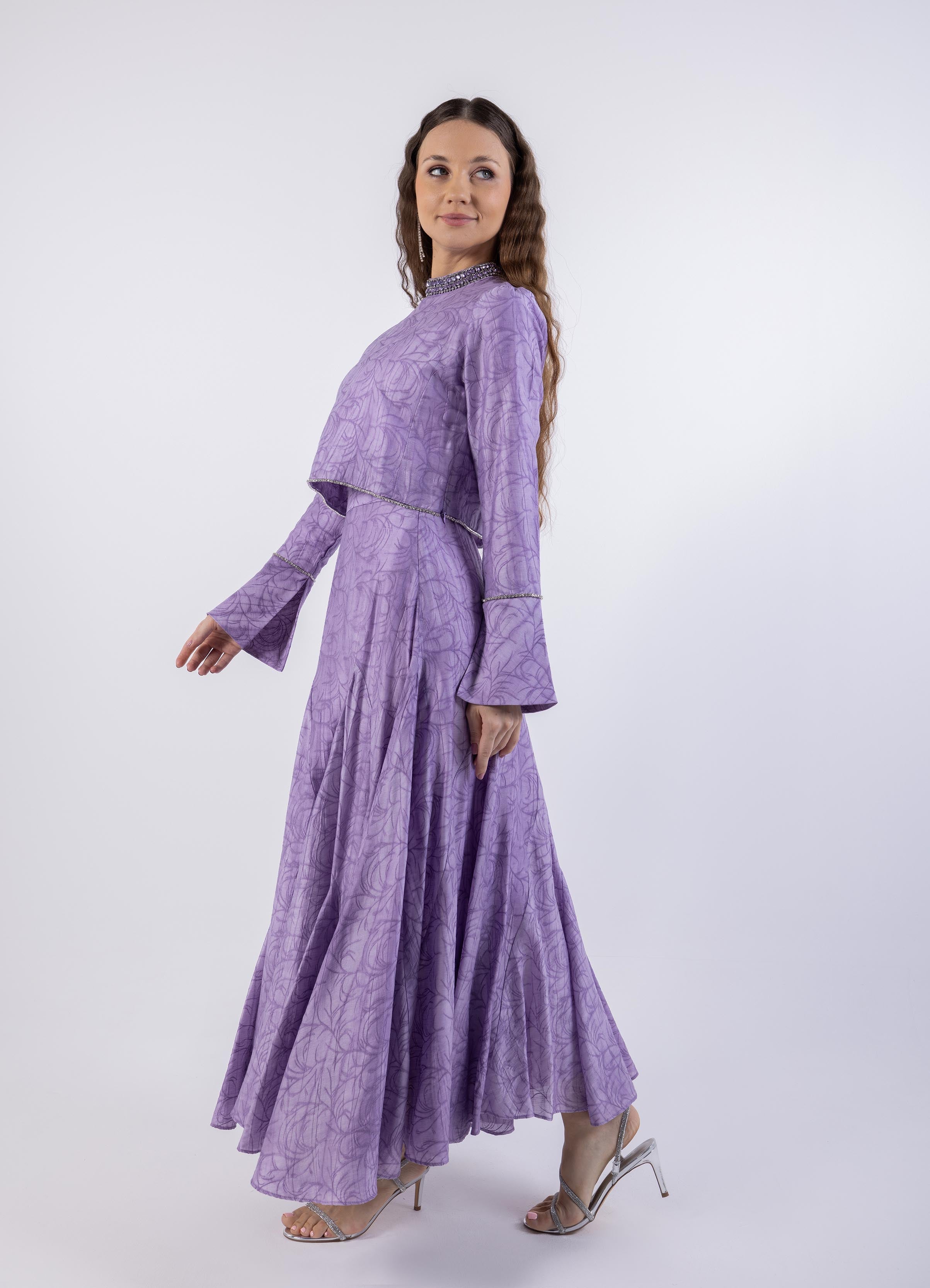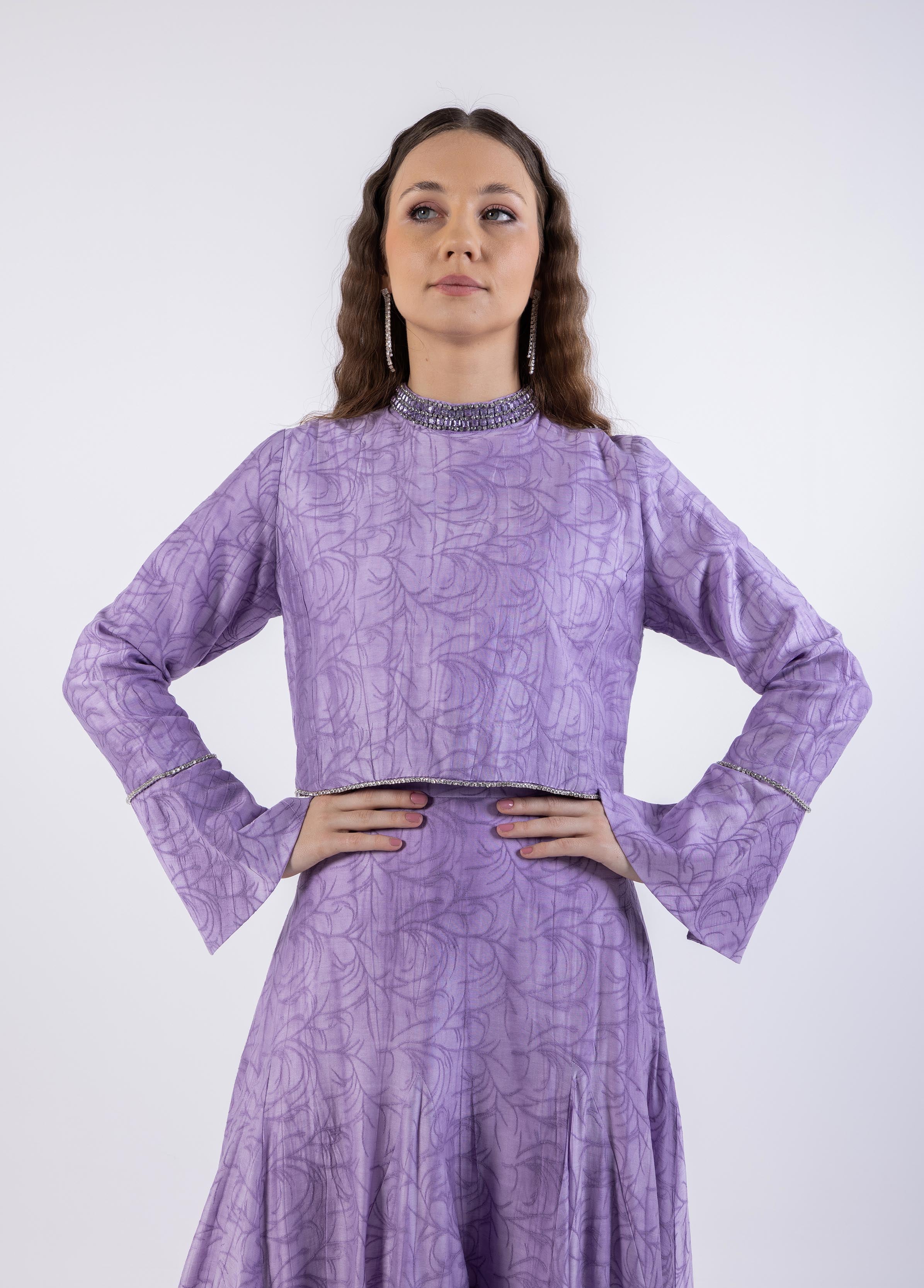 Make a refined statement with this cropped top, designed with a delicate abstract texture and accentuated by shimmering crystal trims along the neckline, sleeves, and hem. The top features a structured silhouette with a modest crew neckline, while the flared cuffs add a touch of elegance. Whether paired with its matching flared skirt or styled separately, this versatile piece brings understated luxury to your wardrobe. Pair it effortlessly with skirt code 2501007 for a coordinated look.