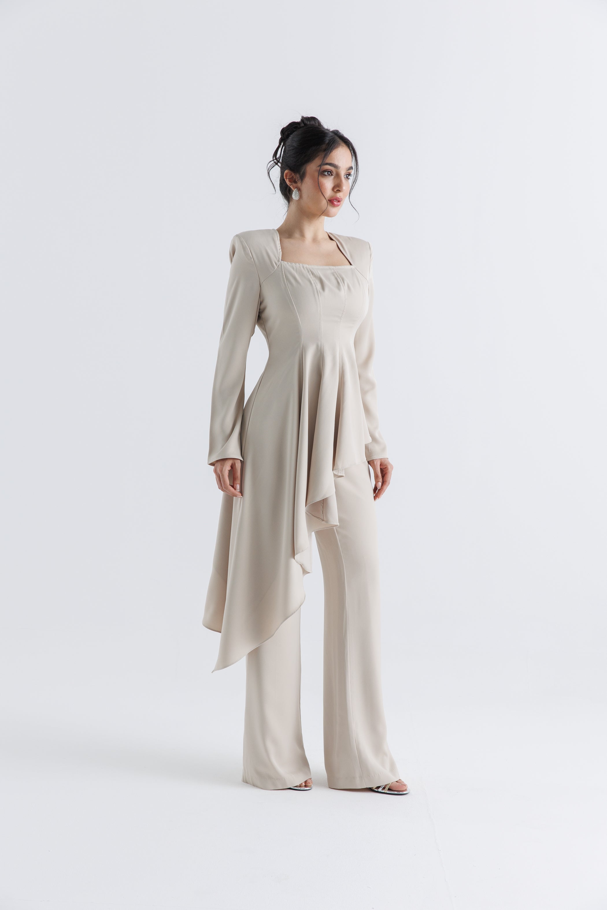 Make a statement with this elegant blouse, crafted from high-quality crepe fabric that offers both structure and fluidity. Designed with a square neckline and sculpted seam lines, the silhouette gently hugs the body before flowing into an eye-catching asymmetrical hem. The long sleeves and tailored fit add sophistication, while the draped front and back panels create graceful movement. Style it with our matching pants (style 2504006) for a polished, modern look.