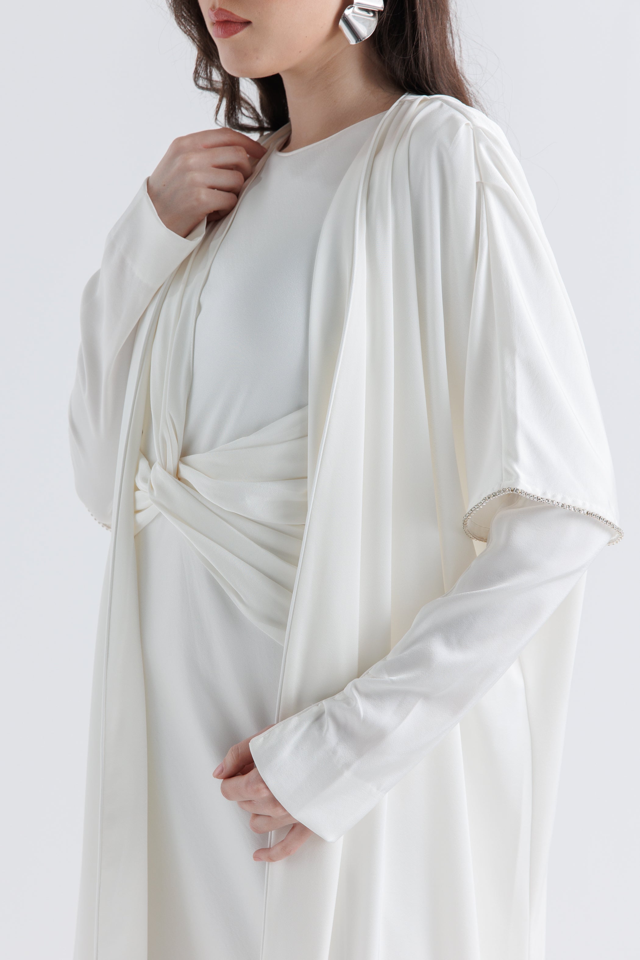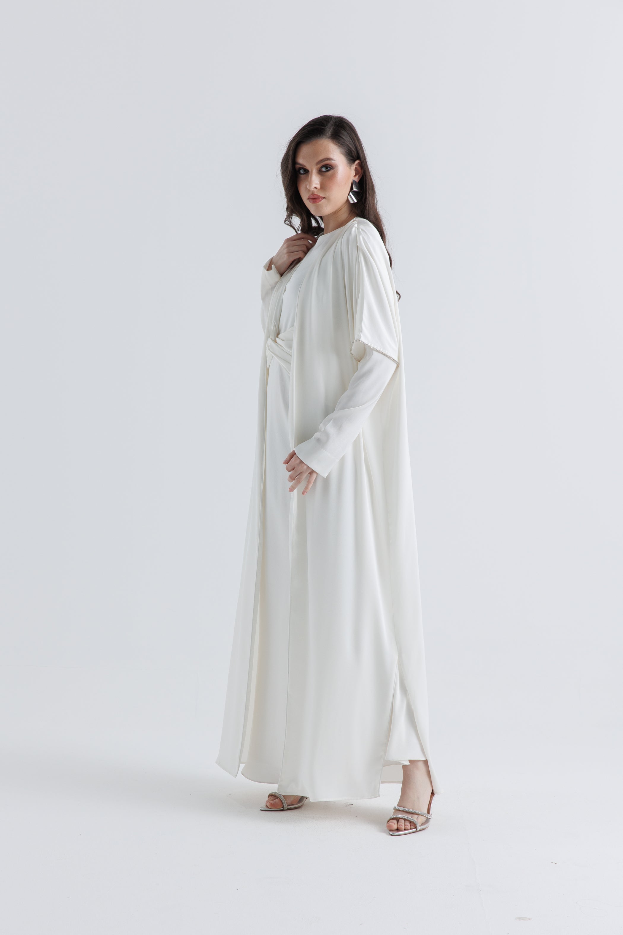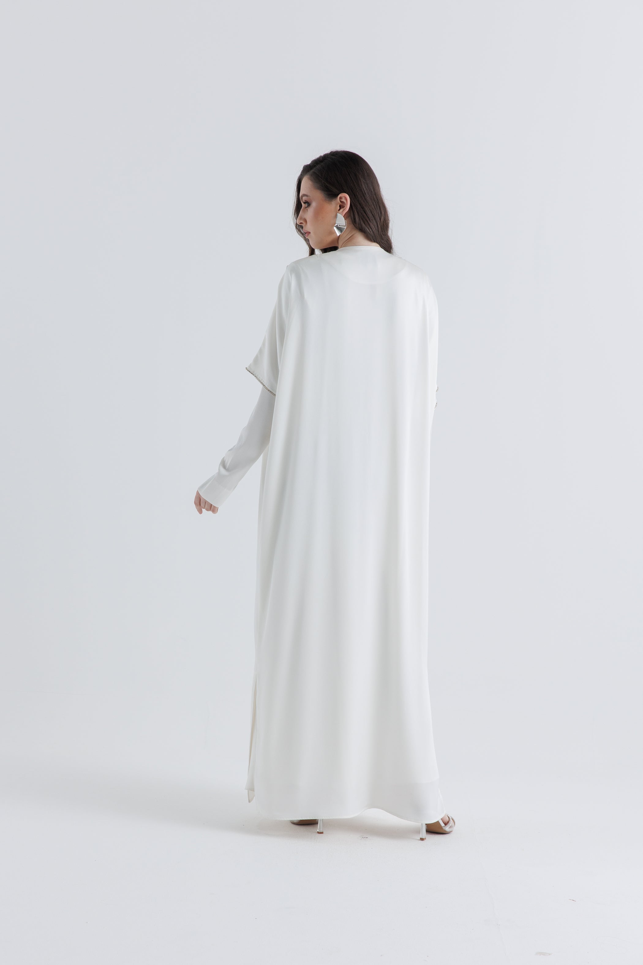 Elevate your layering game with this effortlessly chic open-front cardigan. Designed with a flowing silhouette and relaxed fit, it drapes beautifully over any outfit while offering modest coverage and refined movement. Crafted from a smooth, satin-like fabric, it adds a soft sheen and luxurious touch to your everyday wardrobe. Side slits at the hem allow for ease of movement, making it as practical as it is elegant.
