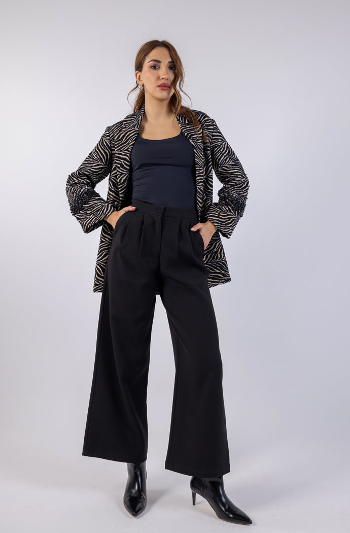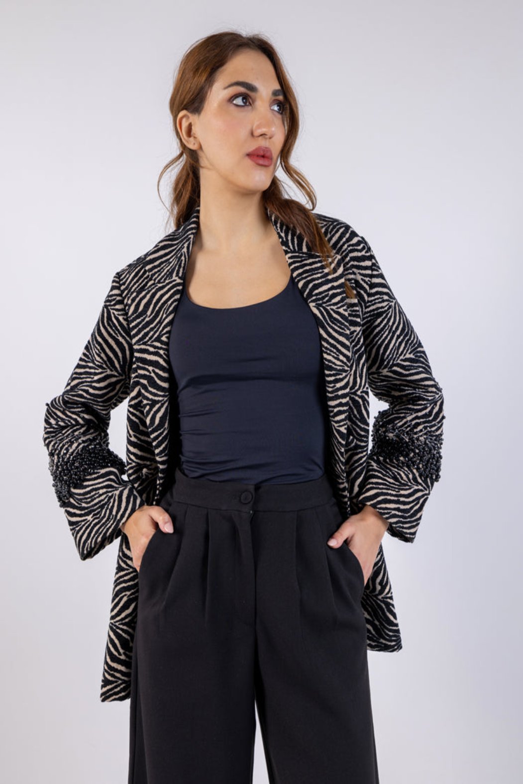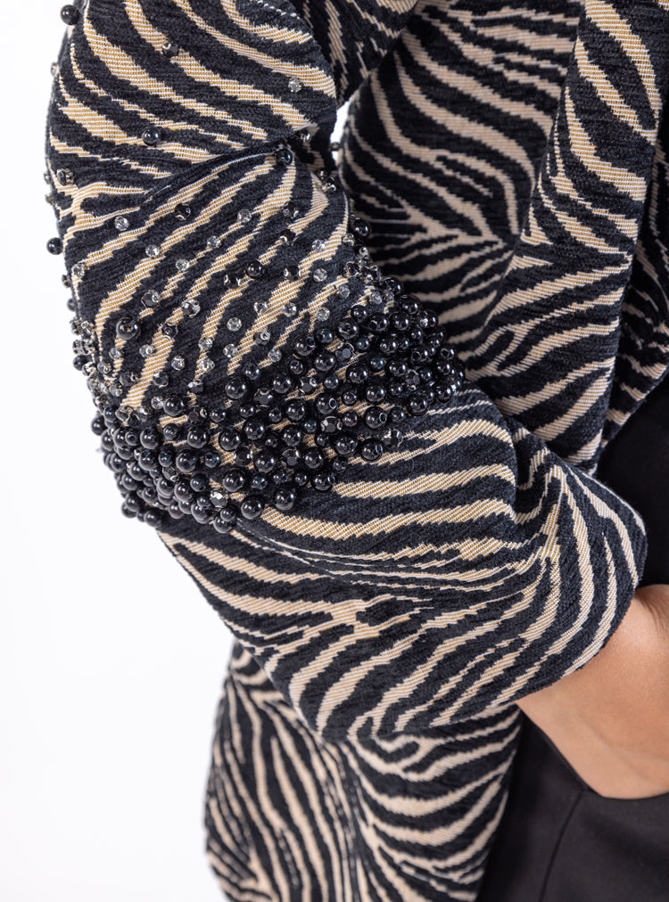 Bold Black Zebra Print Blazer with Beaded Sleeves