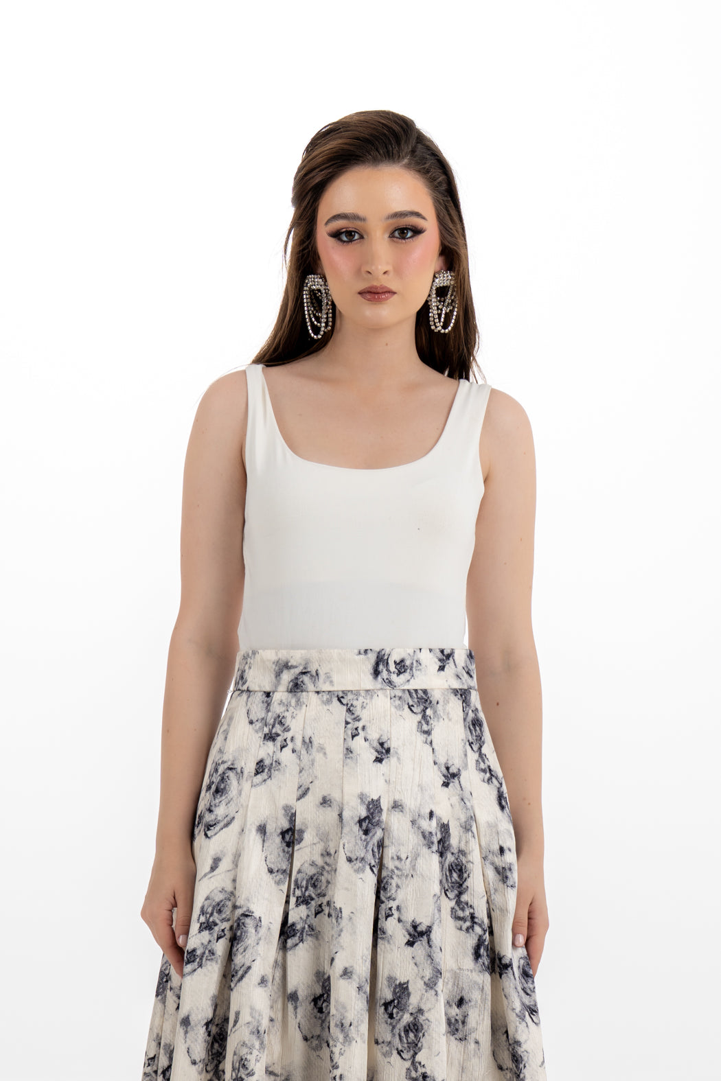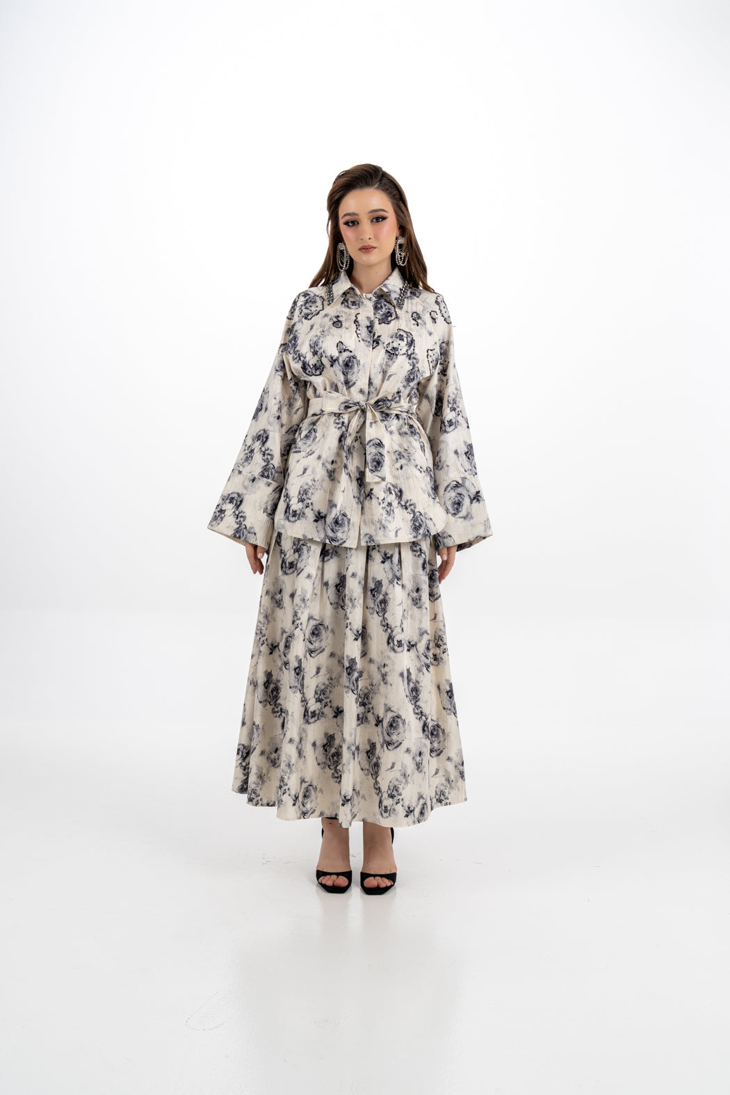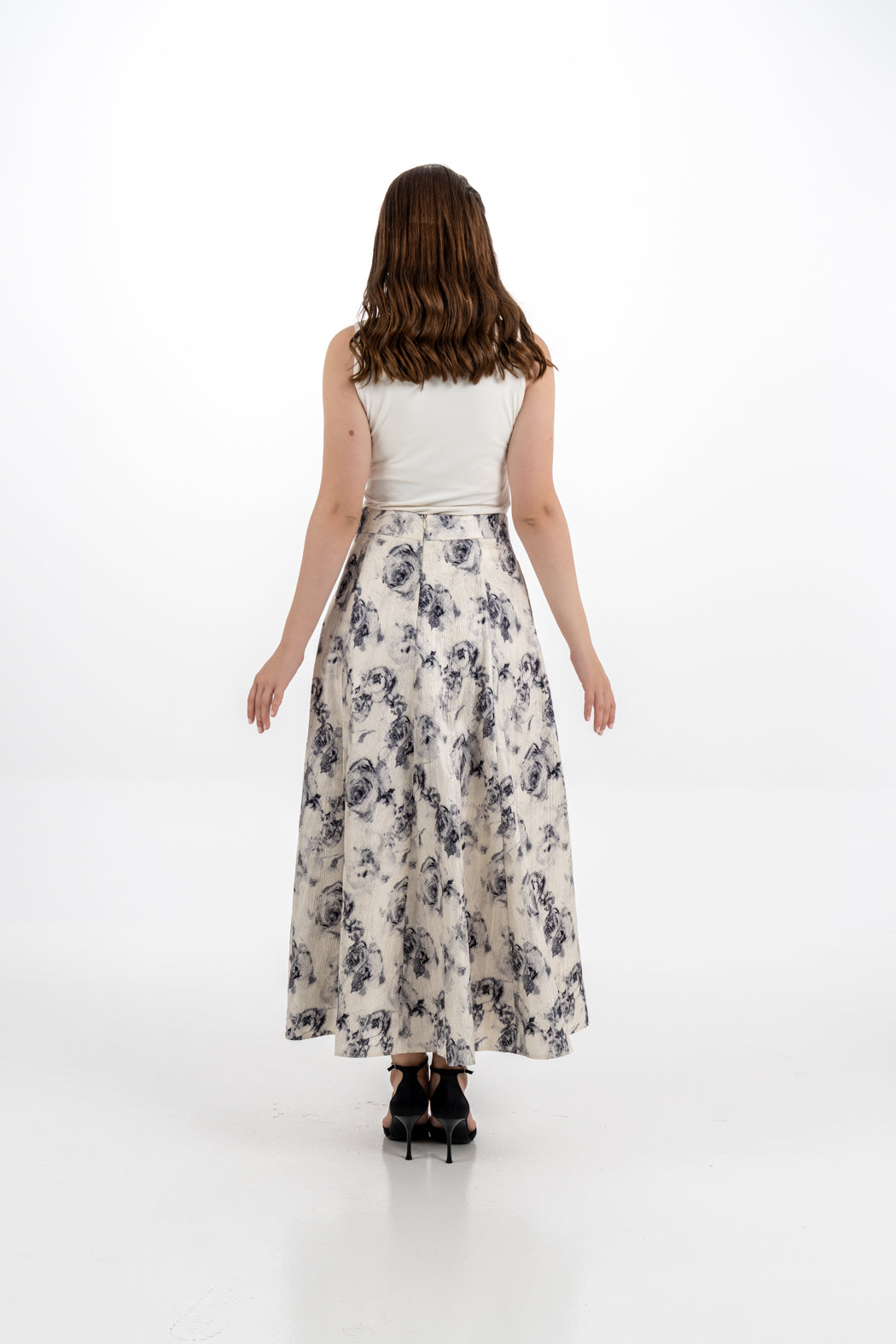 This elegant skirt features a delicate floral jacquard print in soft ivory and charcoal tones. Designed with structured pleats for volume and graceful movement, it offers a flattering A-line silhouette and falls to an approximate length of 94 cm. The high-waisted cut and hidden back zipper ensure a tailored and refined fit. Pair it effortlessly with shirt 2502033 for a chic and coordinated look.