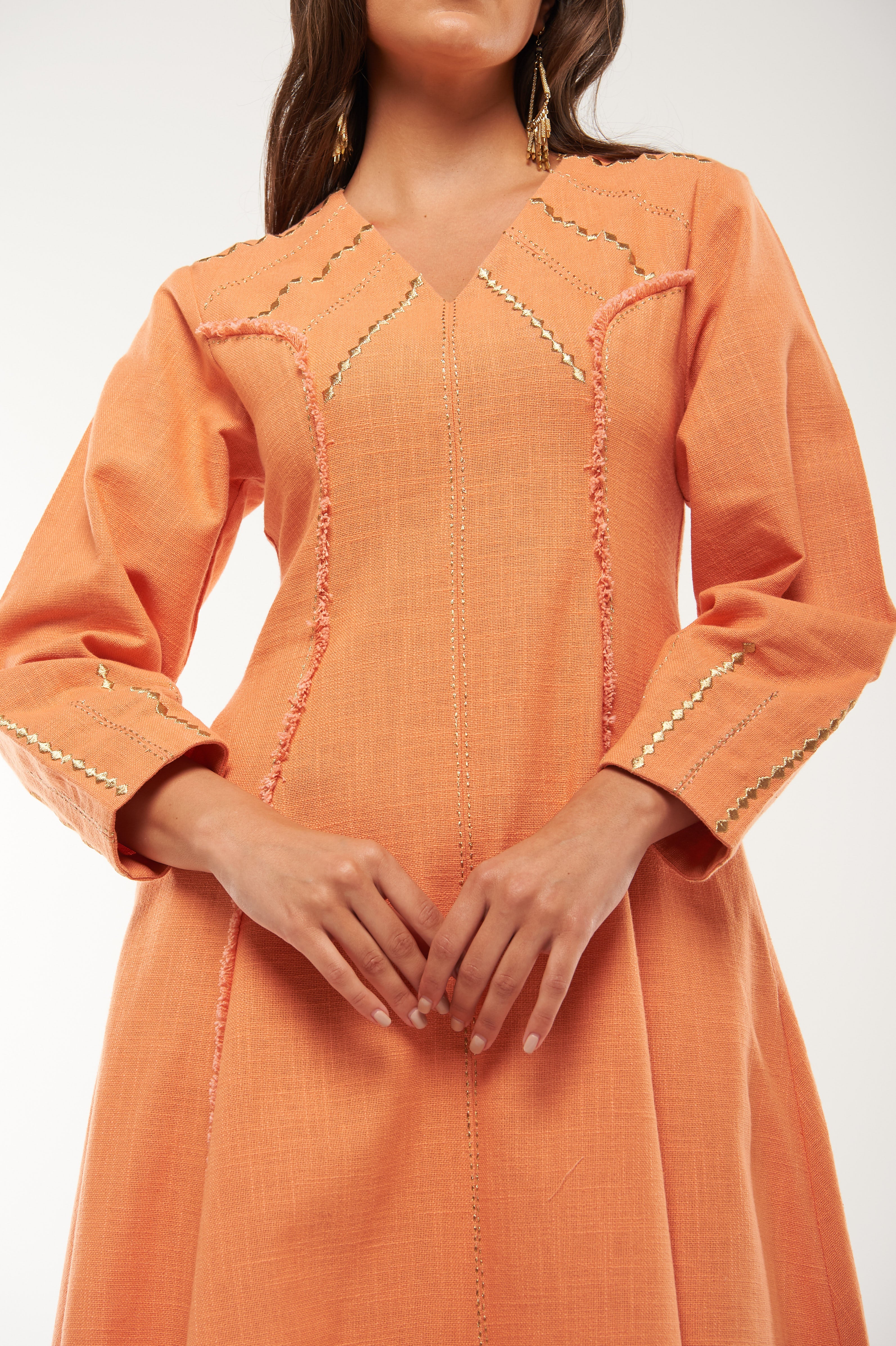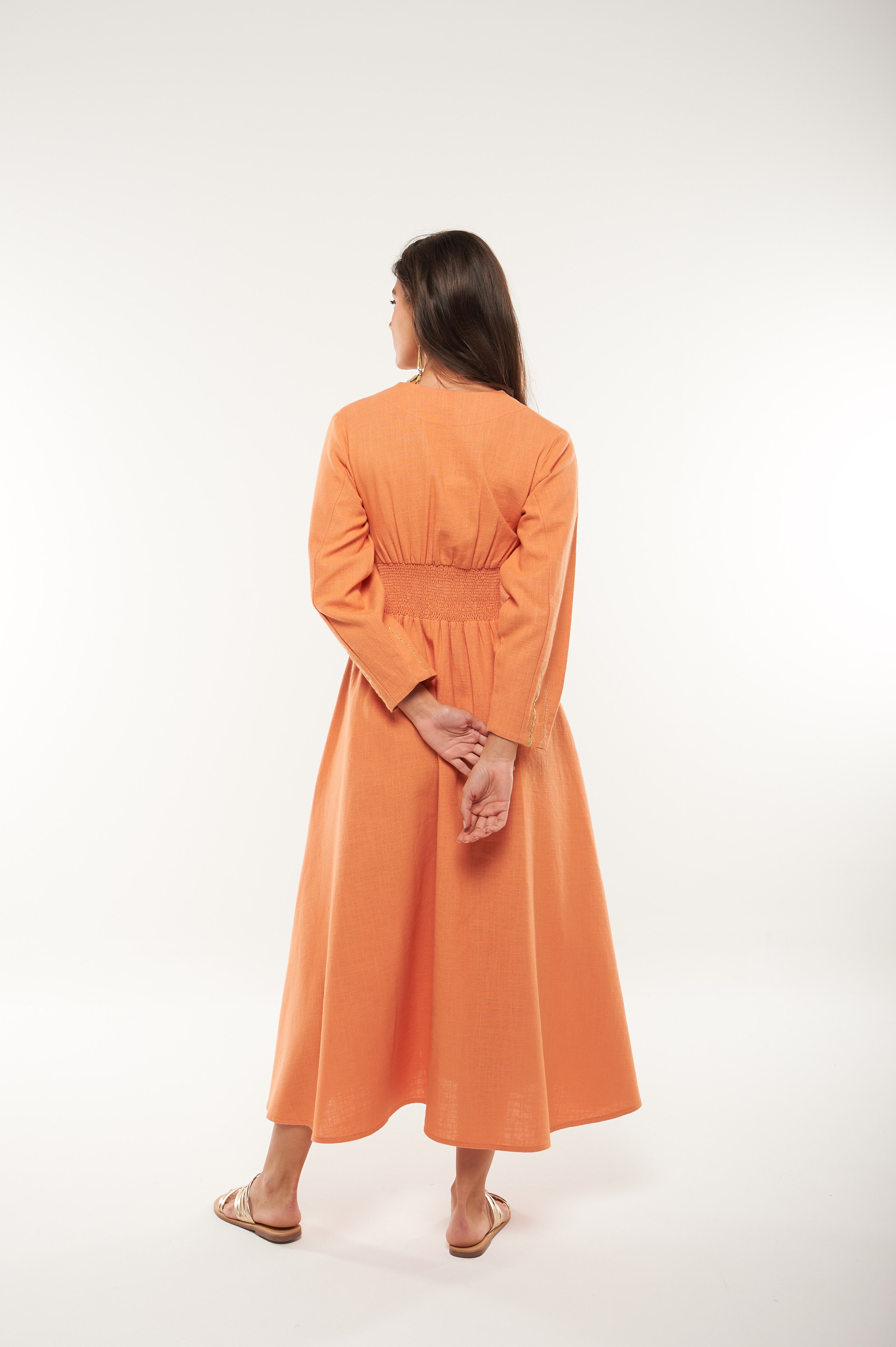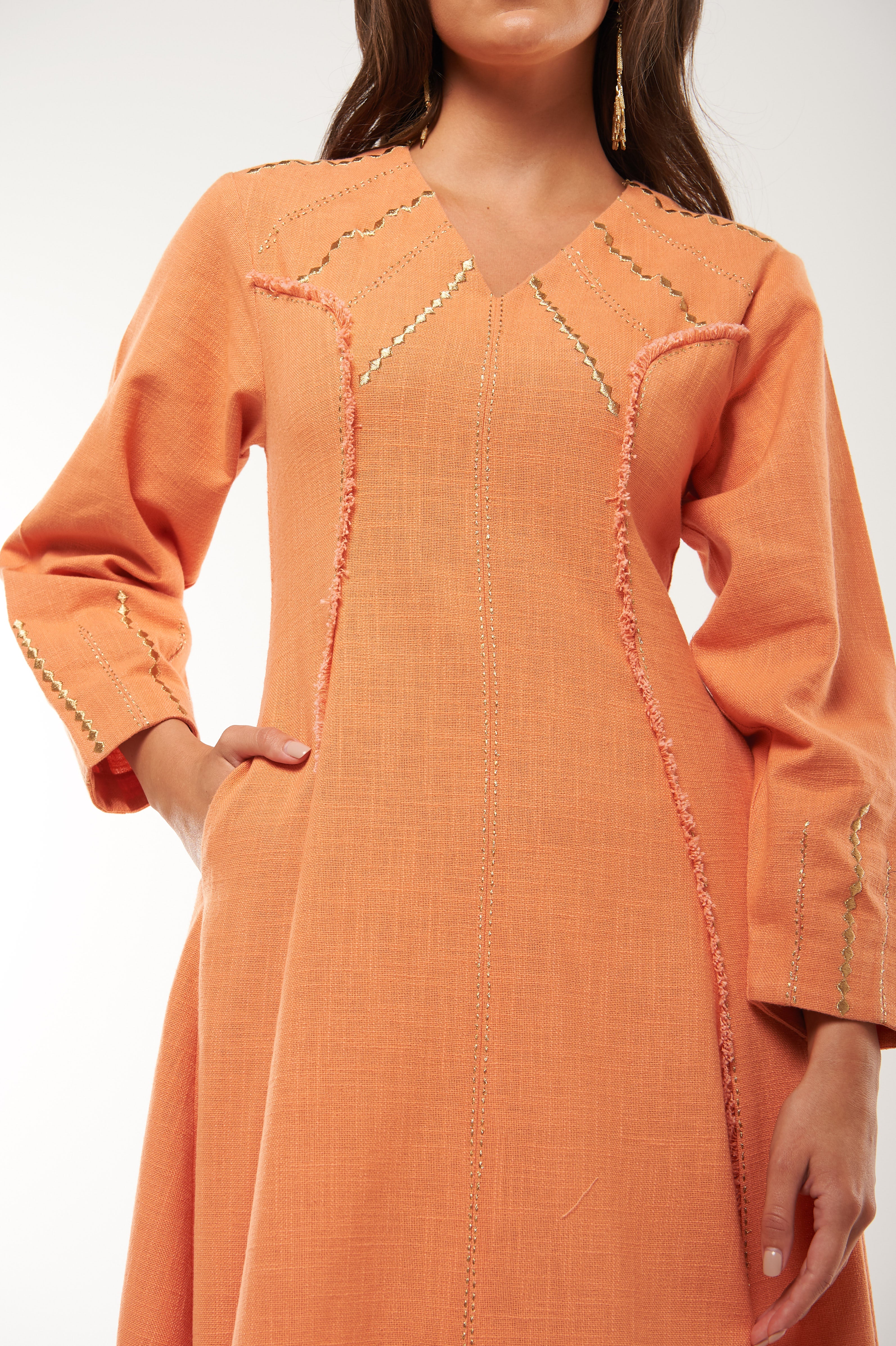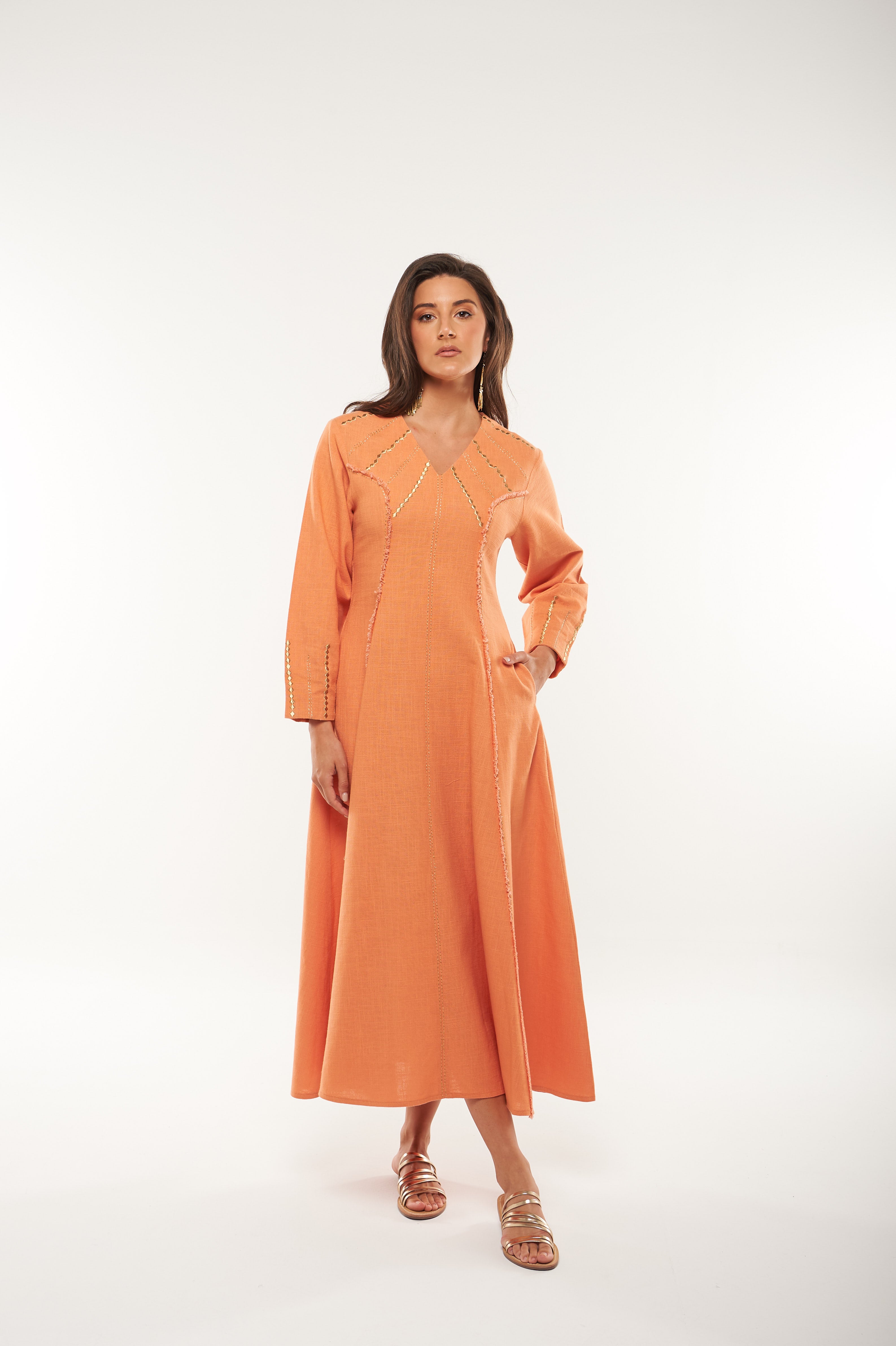 Elevate your everyday elegance with this beautifully tailored linen maxi dress. Crafted from a breathable textured linen-blend fabric, this dress features a flattering V-neckline, full-length sleeves, and intricate metallic embroidery across the chest, sleeves, and front seams. The front panel includes soft raw-edge detailing for a touch of artisanal charm, while the back is smocked at the waist for added comfort and shape. Side pockets offer practical functionality without compromising on style.