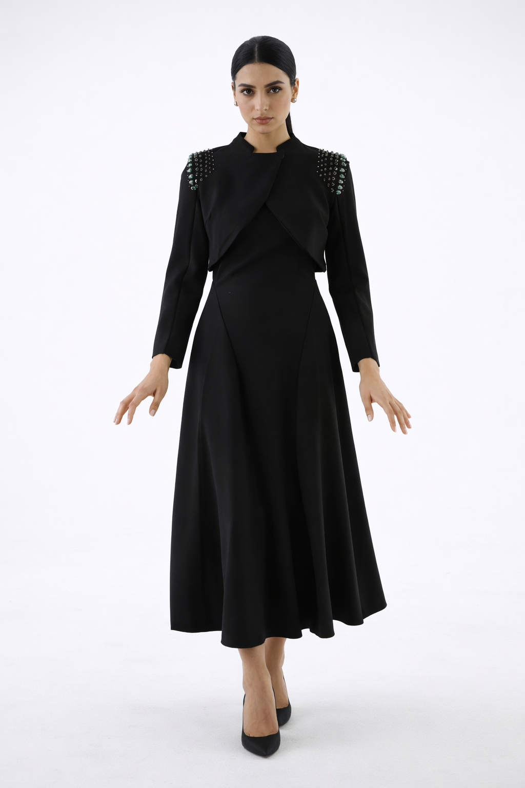 Style this cropped jacket over the coordinating dress 2506201 for a cohesive Ramadan and Eid ensemble. Complete the look with understated heels and minimal jewelry to let the embellishment details shine. It also pairs beautifully with fluid dresses or tailored separates for formal occasions.