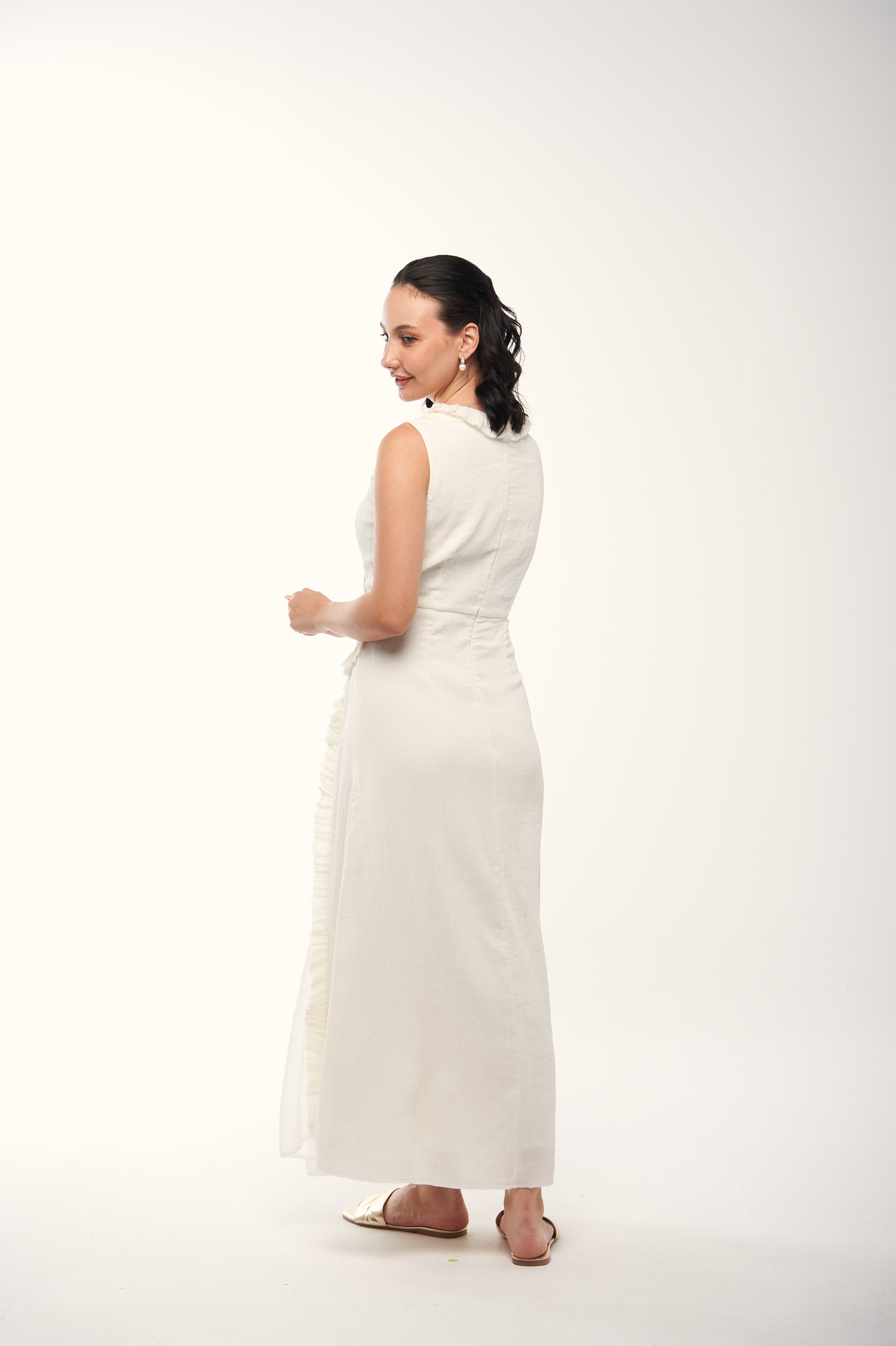 This sleeveless maxi dress exudes relaxed femininity with its wrap-style bodice and soft ruffle detailing. Crafted from breathable, lightweight fabric, it drapes effortlessly with a flattering V-neckline and a layered look at the waist. The asymmetrical ruffle trim runs along the neckline and hem, adding soft texture and movement. Perfect for summer days, resort wear, or minimalist evening looks.