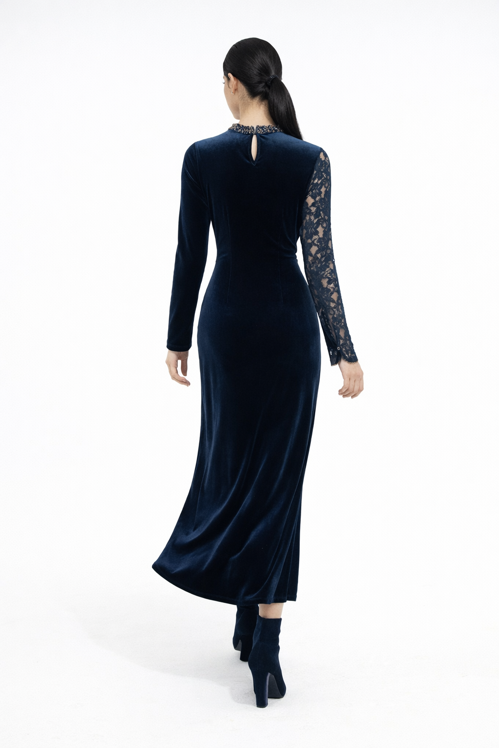 Velvet Maxi Dress with Lace Sleeve and Embellished Details