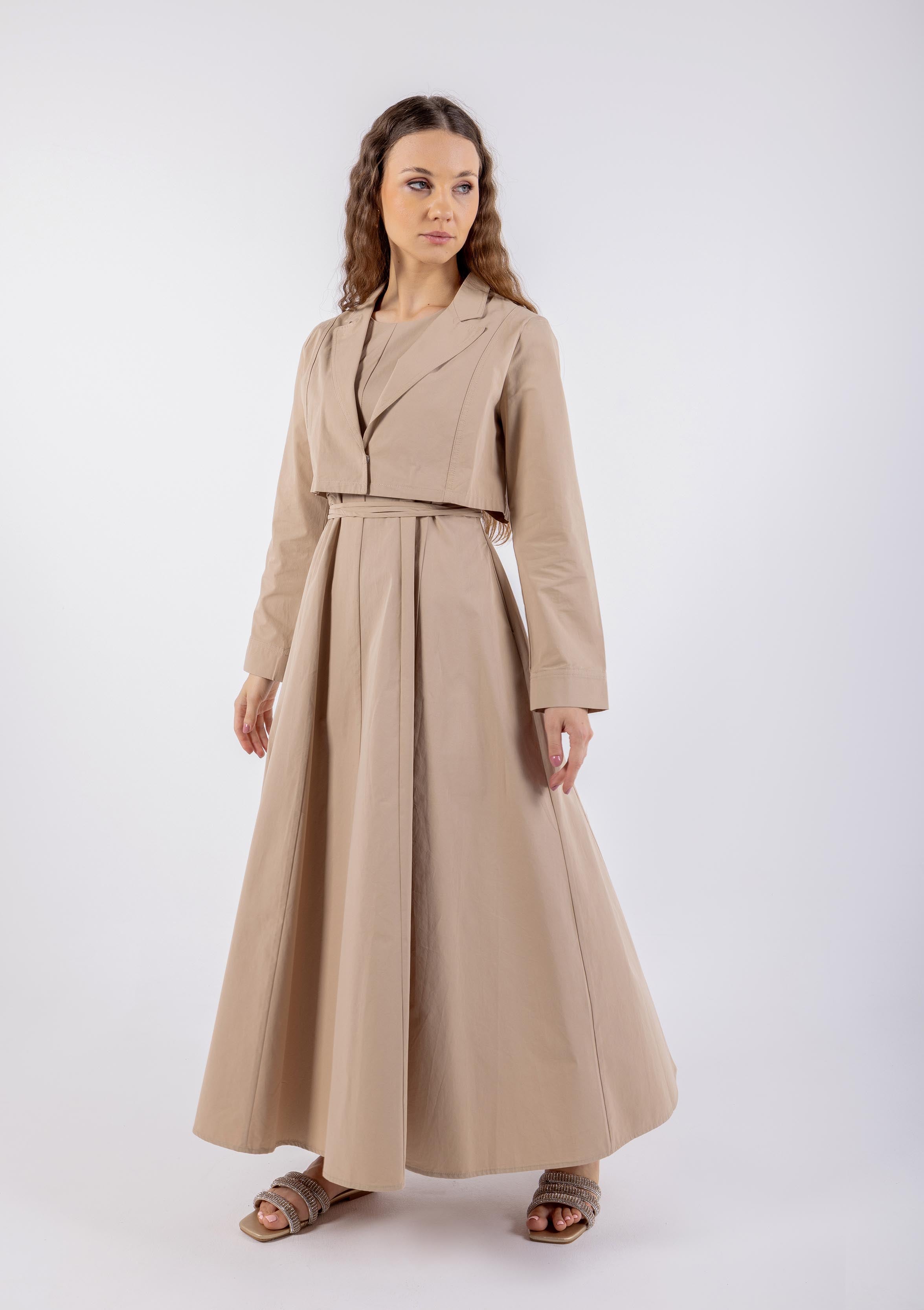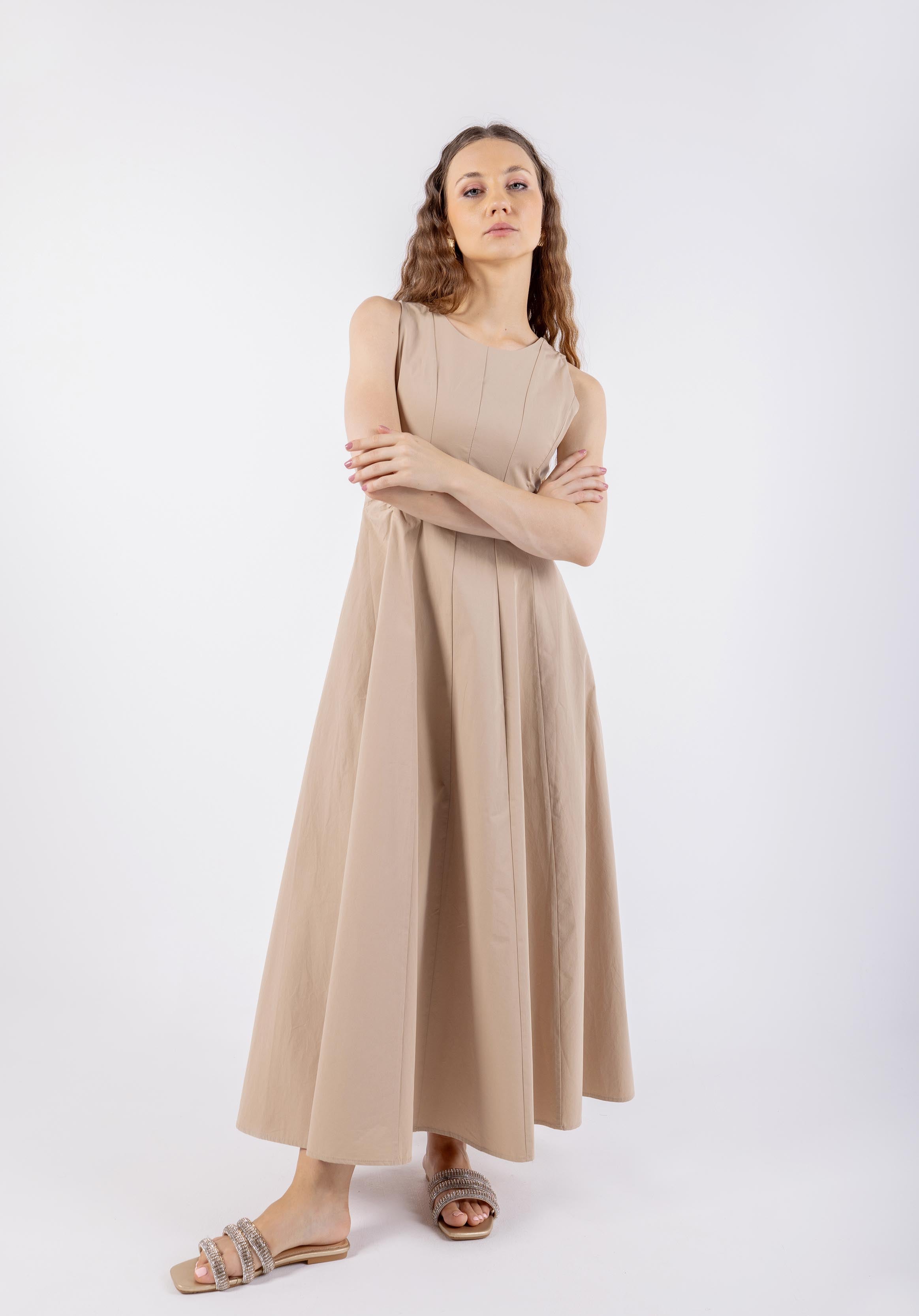 Elegant with a modern twist, this sleeveless dress is designed to highlight the waist while offering comfort and grace. Featuring a flattering fit-and-flare silhouette, it includes vertical seam detailing on the bodice and a fully adjustable lace-up back for a personalized fit. The soft flare skirt adds a touch of movement, making it ideal for day-to-evening transitions. Available in neutral beige and serene teal.