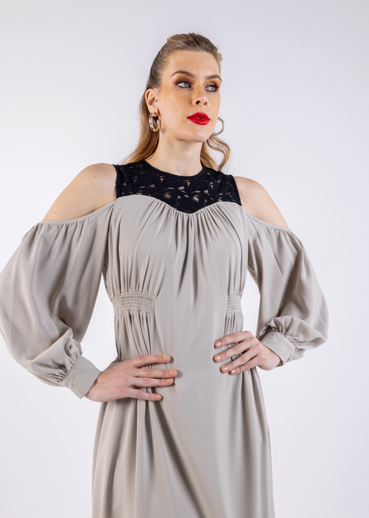 Elevate your wardrobe with our Elegant Cold-Shoulder Midi Dress, a timeless piece that exudes sophistication and style. Featuring a delicate lace yoke with intricate patterns, this dress beautifully blends modern elegance with classic charm. The cold-shoulder design adds a touch of allure, while the voluminous long sleeves with elastic cuffs ensure comfort and style in equal measure. The gathered waist detail flatters the silhouette, making it an ideal choice for both casual outings and special occasions.