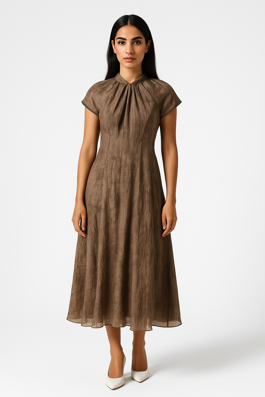 This elegant midi dress combines understated sophistication with delicate detailing. Designed with a softly gathered neckline and embellished cap sleeves, it offers a graceful A-line silhouette that flatters every figure. With a length of approximately 128 cm, this dress is ideal for both refined daywear and chic evening occasions.