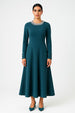 Long sleeves with button-closure cuffs provide a tailored finish, while the skirt gently flares from the waist to a flowing maxi length for graceful movement and elegant drape. Perfect for formal occasions, evening events, and elevated winter gatherings.