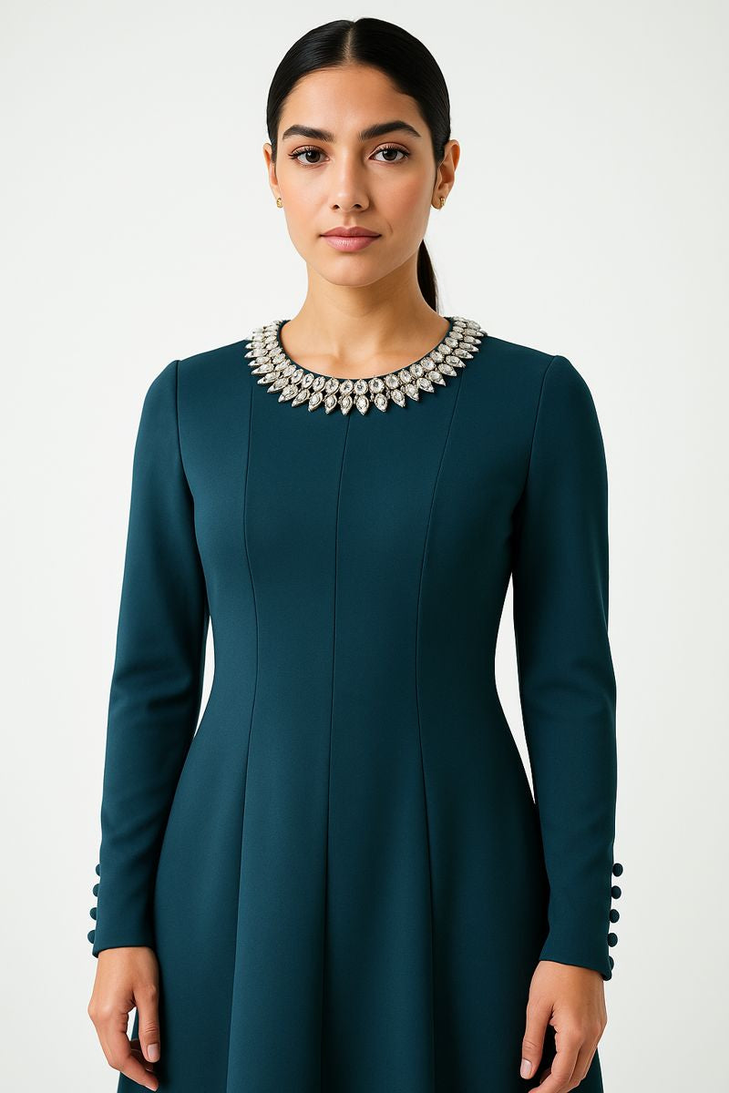 Designed to embody timeless winter elegance, this sophisticated maxi dress features refined tailoring and subtle luxury details. The classic round neckline is finished with delicate embellished trim, adding a polished focal point to the design. A fitted bodice with vertical seam detailing enhances the silhouette, creating a flattering, elongated shape.