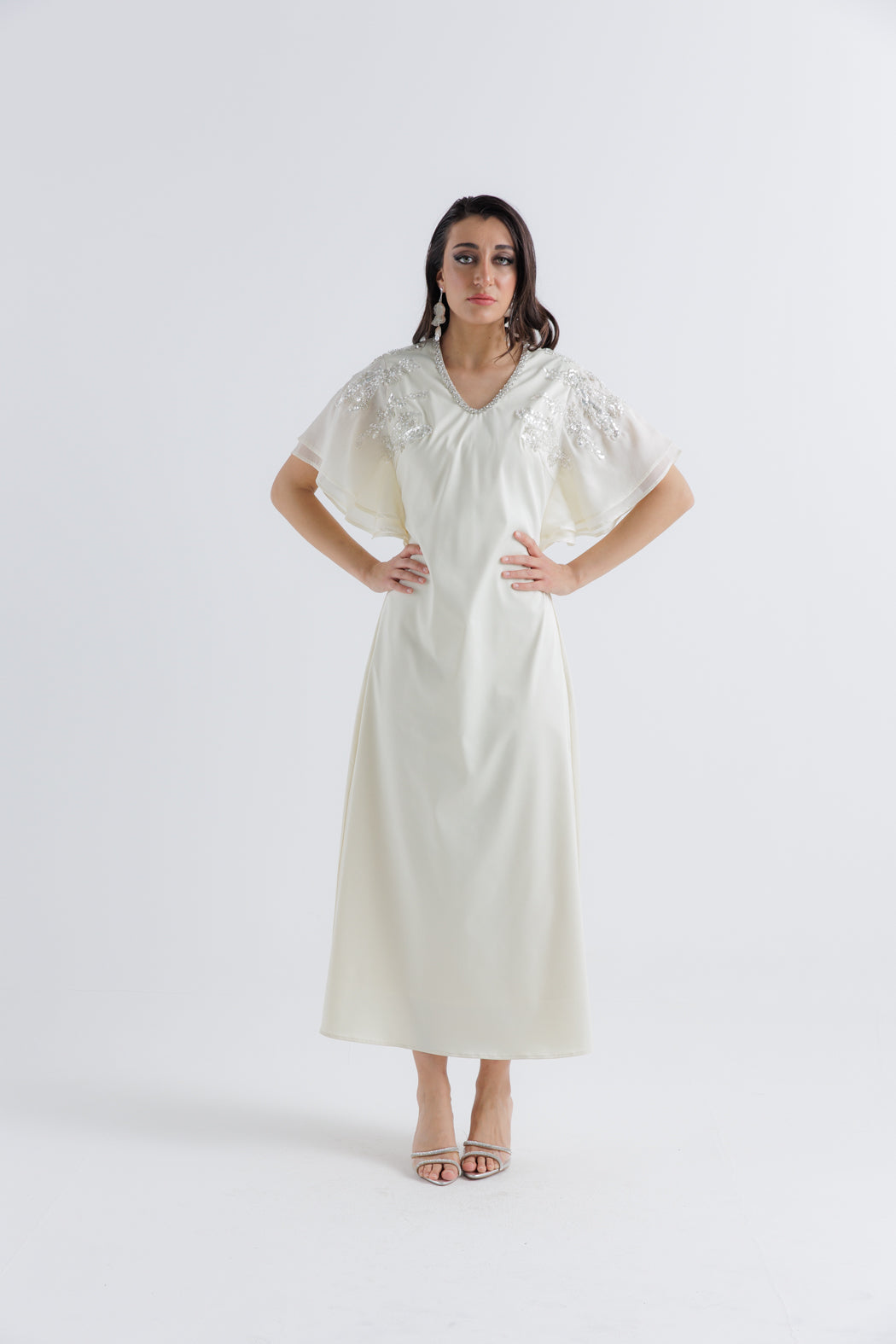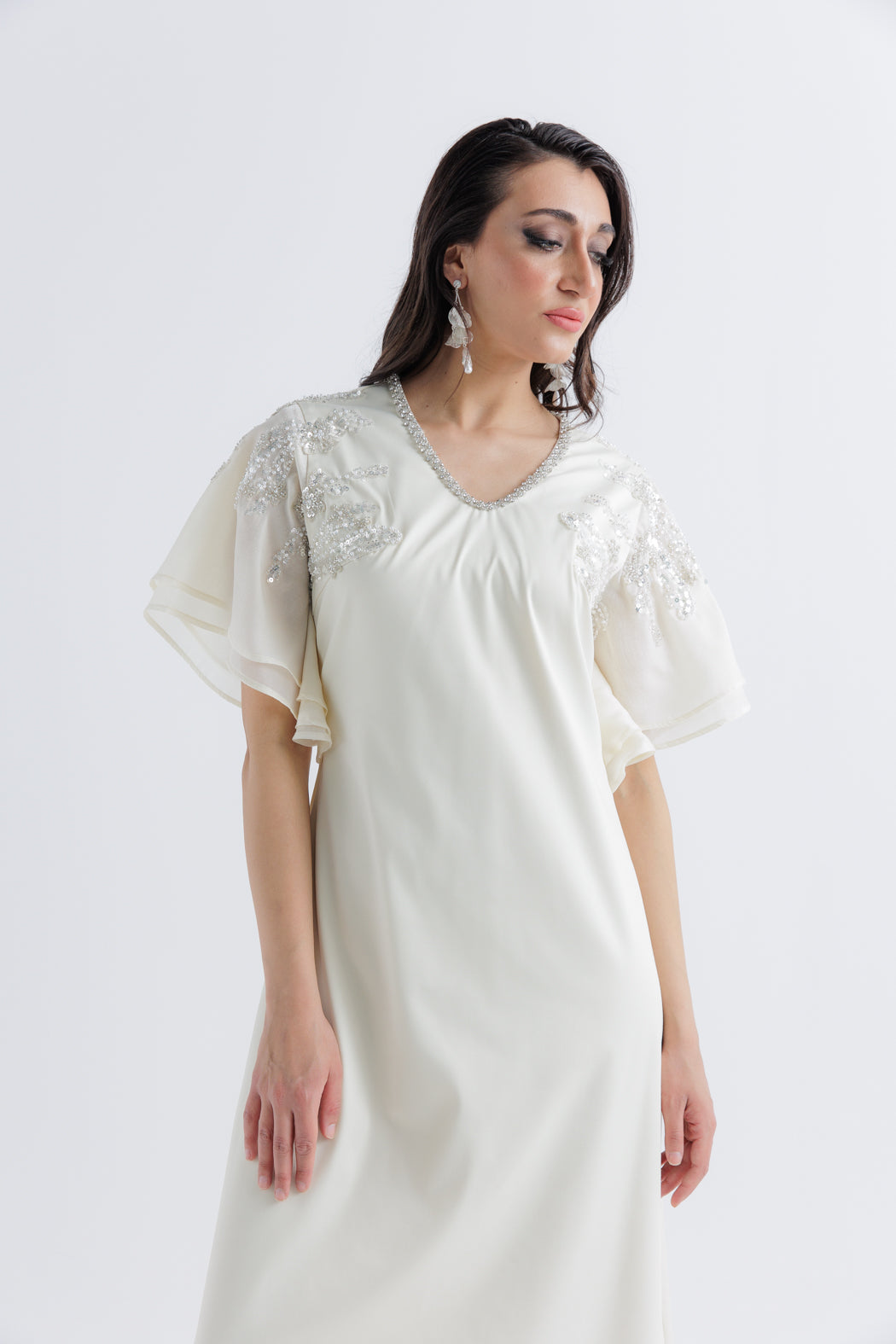 Graceful and refined, this maxi dress showcases a flowing silhouette with soft flutter sleeves. The shoulders and upper bodice are adorned with intricate sequin and bead floral designs, bringing a subtle shimmer and elegance. A delicately beaded V-neckline adds a graceful accent, making this piece ideal for formal evenings and festive occasions.