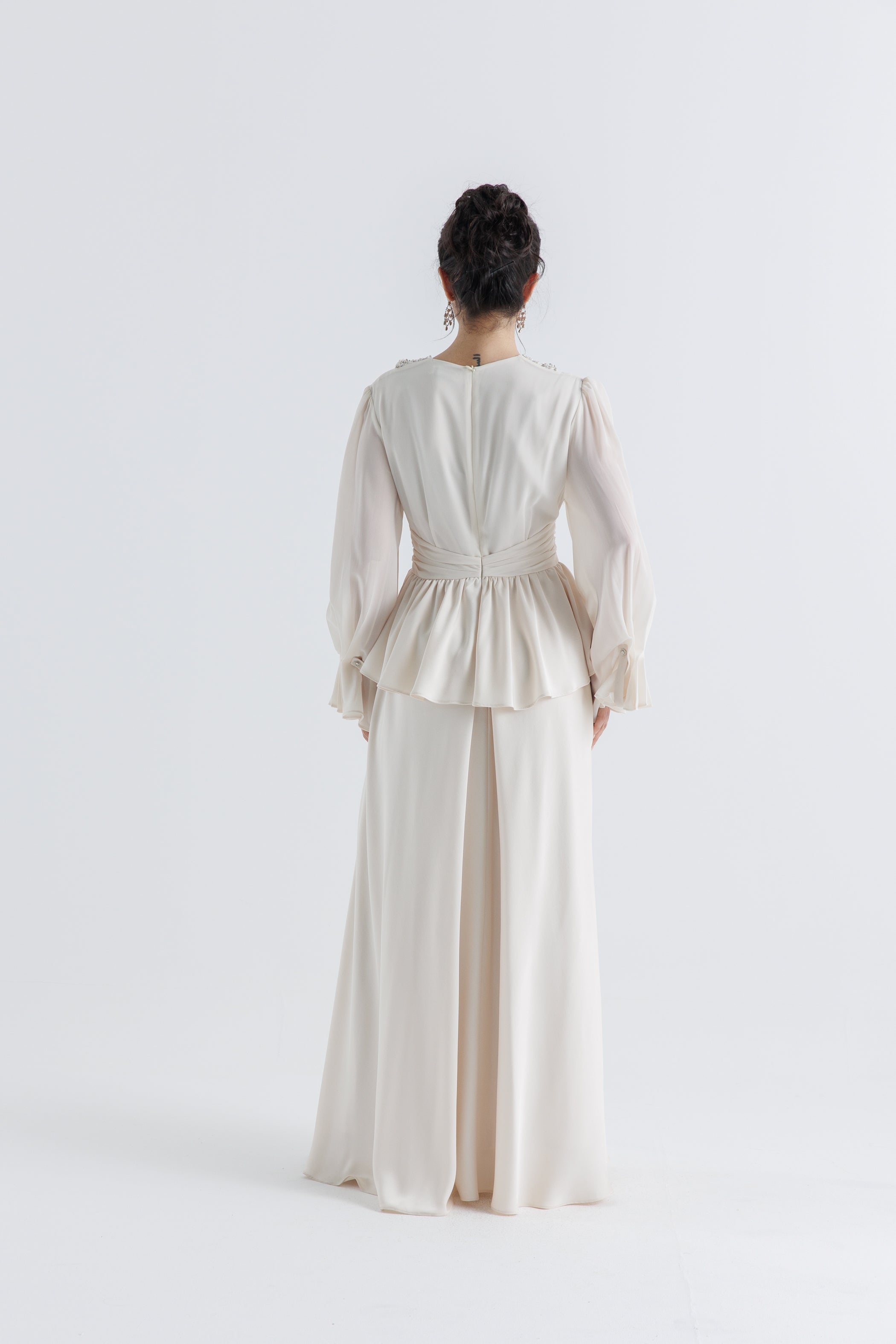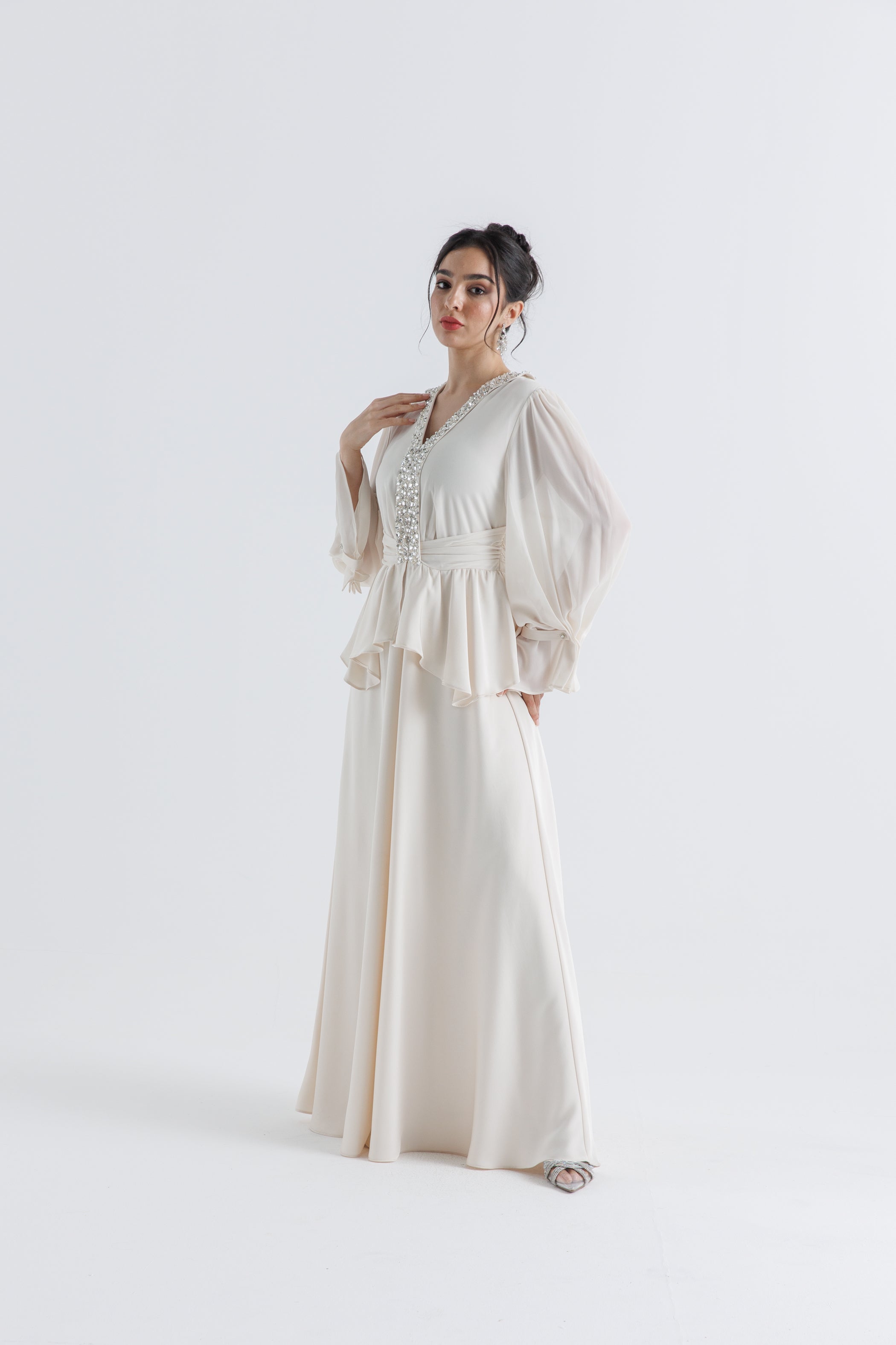 This graceful peplum gown blends modest sophistication with glamorous details. Designed with a flattering V-neckline, the bodice is accented by a shimmering panel of crystal embellishments that elevate the overall look. The soft chiffon sleeves flow elegantly with subtle pleating, while the layered peplum waist adds a romantic, structured silhouette. The skirt falls beautifully in an A-line cut, offering both comfort and elegance for formal occasions, evening gatherings, or weddings.