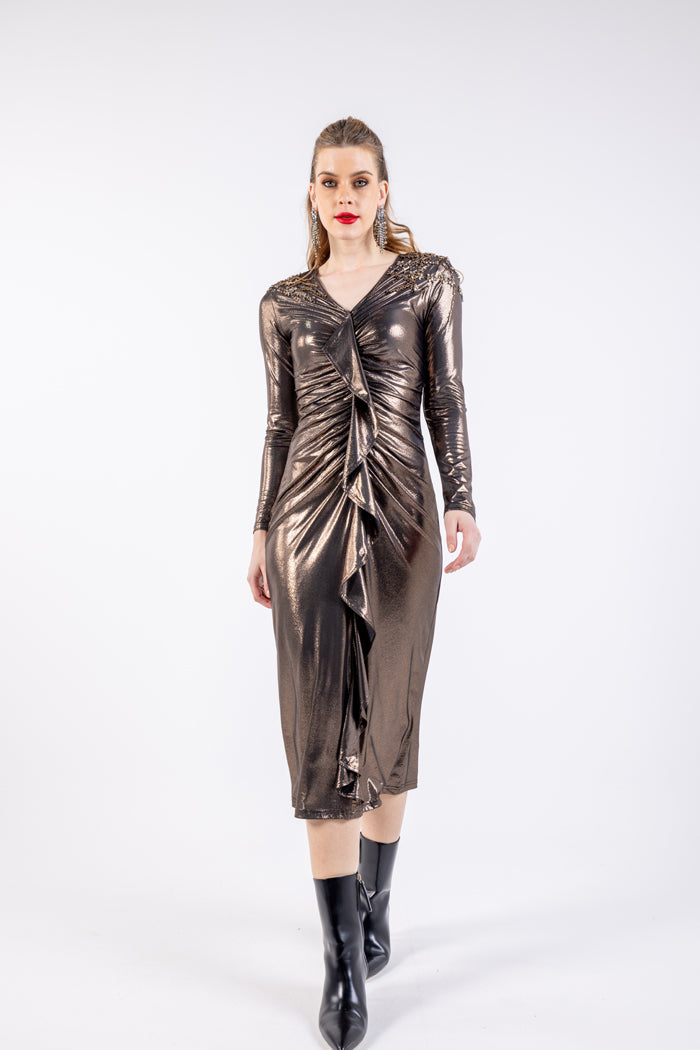 Elevate your evening look with this glamorous metallic ruched midi dress, designed to make you stand out at any special event. Featuring a classic V-neckline, this dress offers a flattering silhouette with intricate ruching that enhances your curves. The embellished shoulder detailing adds a touch of elegance, while the long sleeves provide a sophisticated finish. The cascading ruffle detail down the front adds a dramatic flair, making it the perfect choice for a chic and confident appearance.