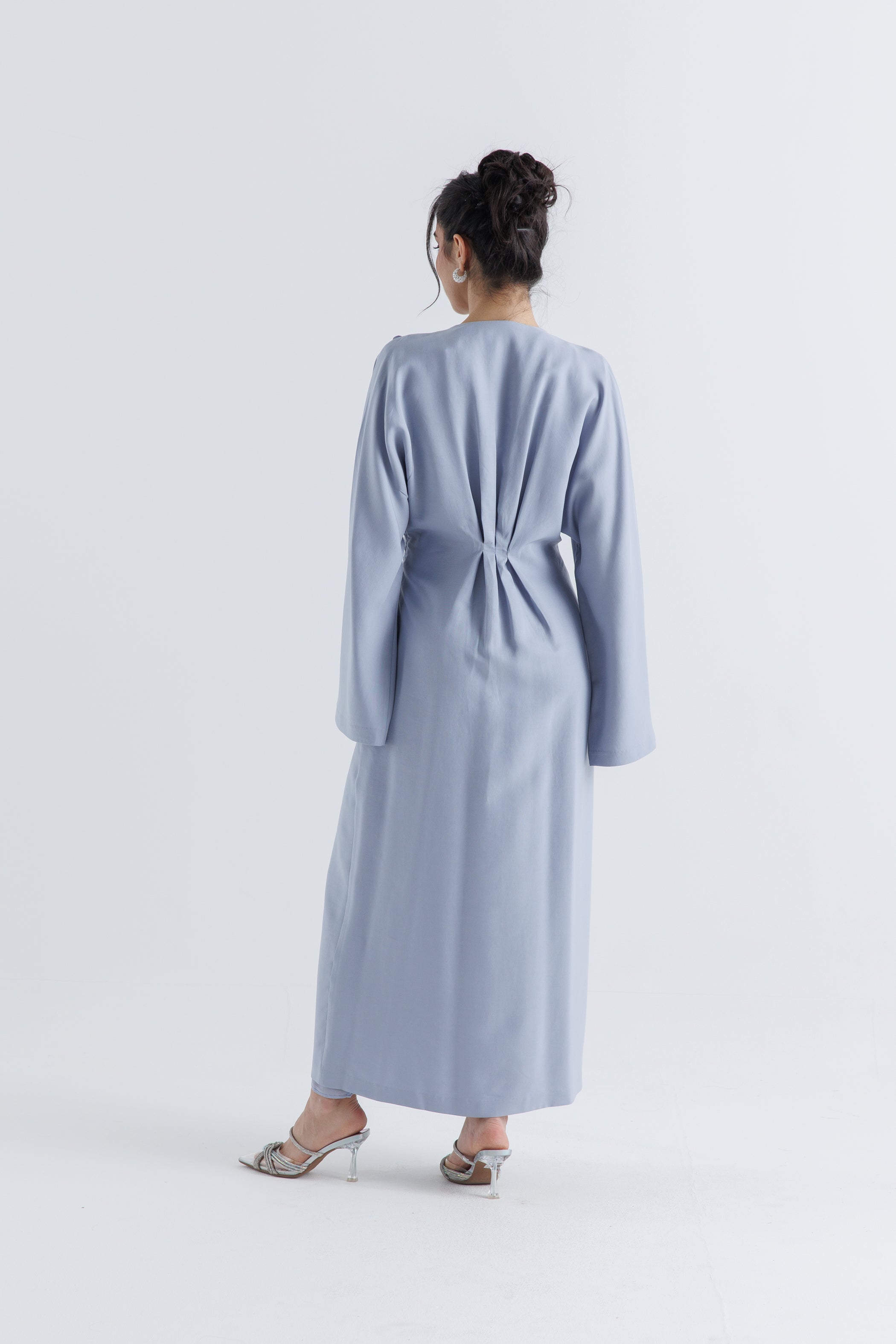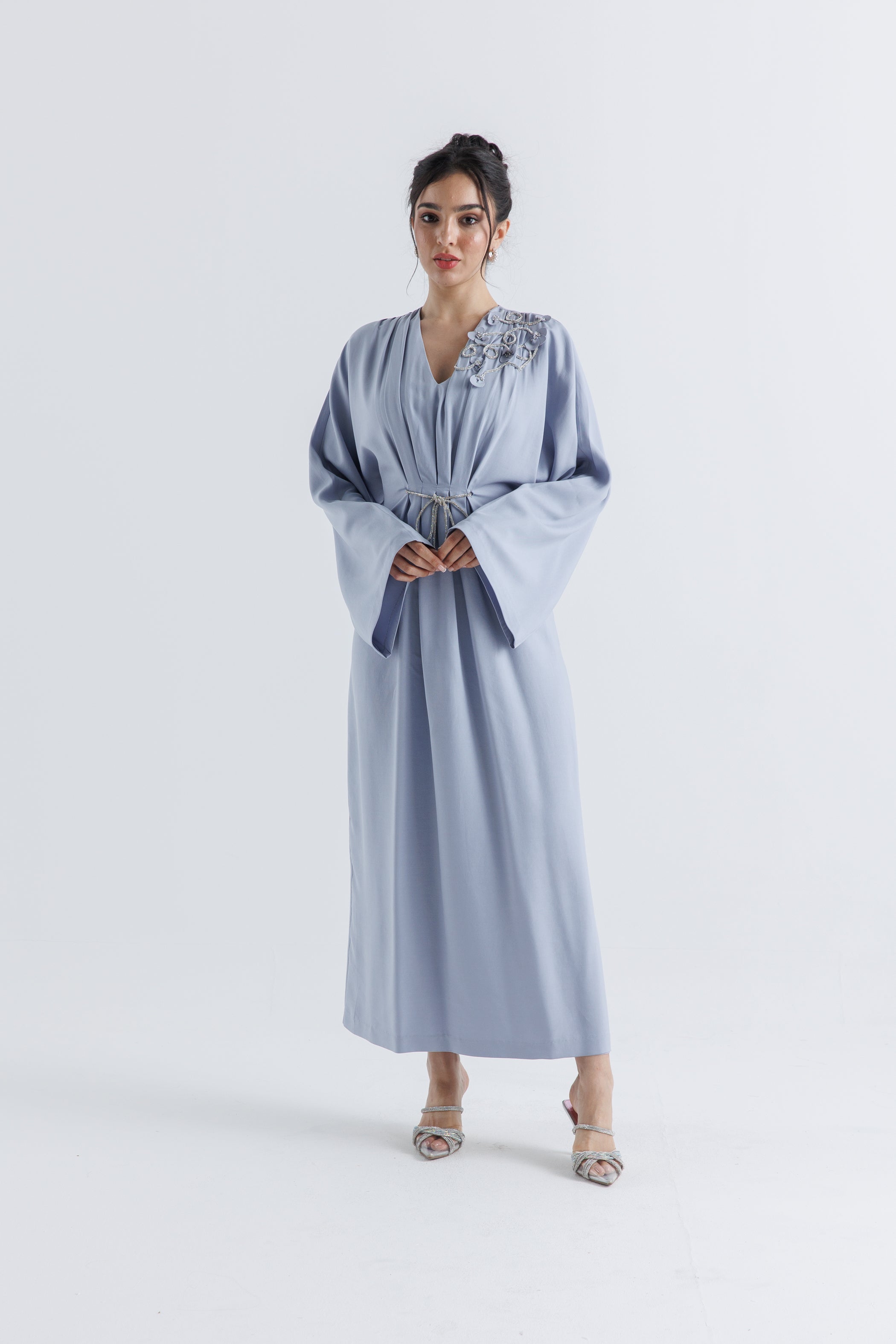 Make a stunning impression with this elegant maxi dress, designed for Ramadan and Eid festivities. Featuring exquisite embellishments on the shoulder and delicate pleated details, this dress offers a sophisticated blend of modern elegance and timeless tradition. The adjustable waist tie accentuates your figure, while the flowing silhouette ensures graceful movement and comfort.