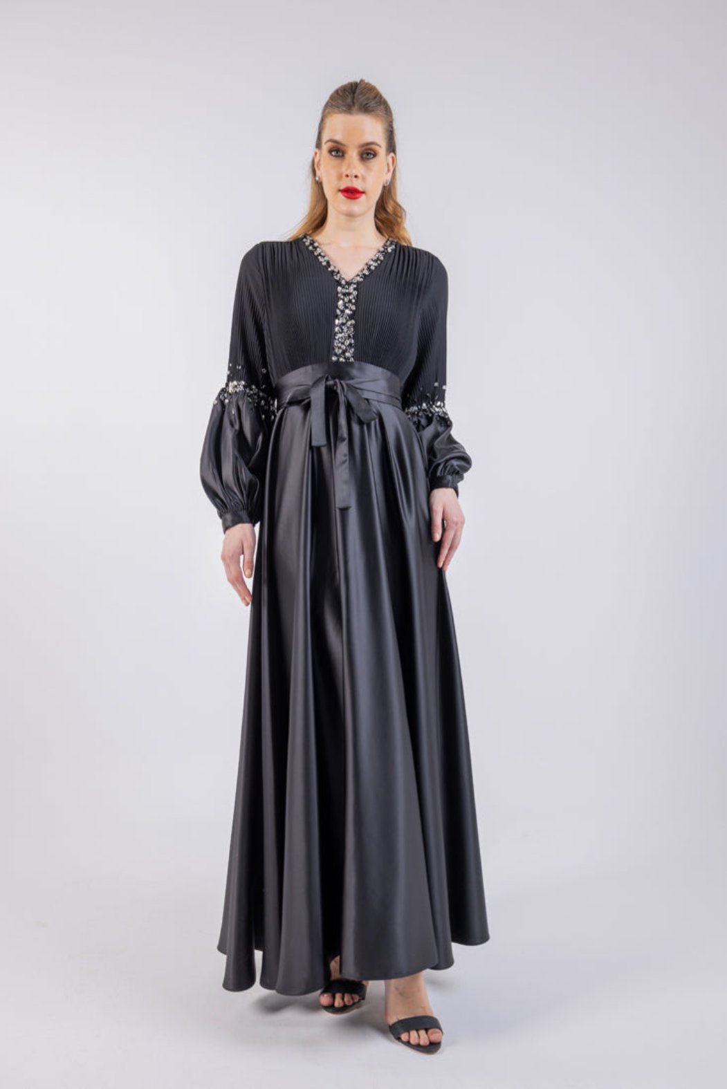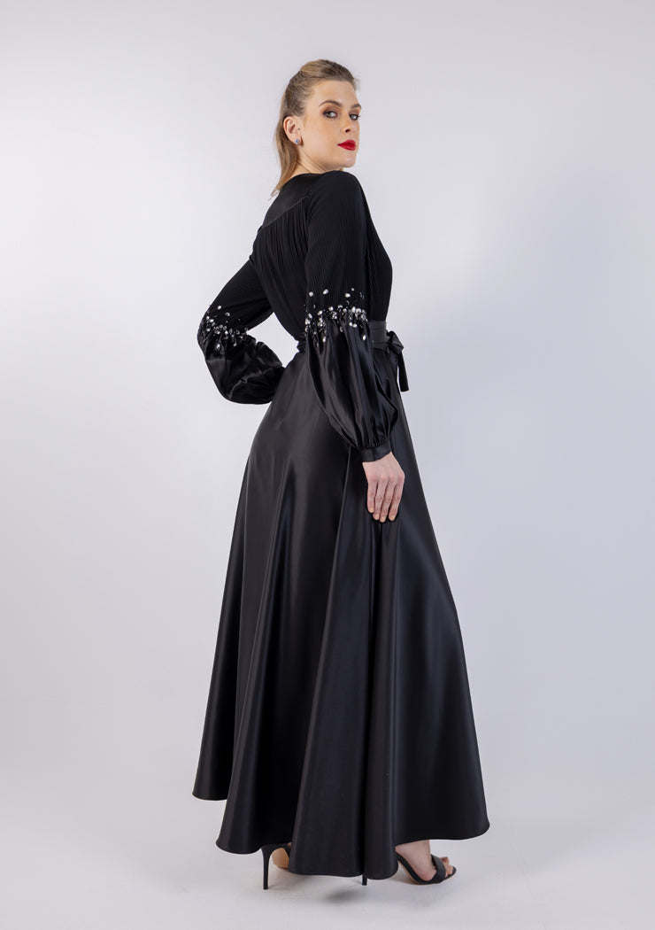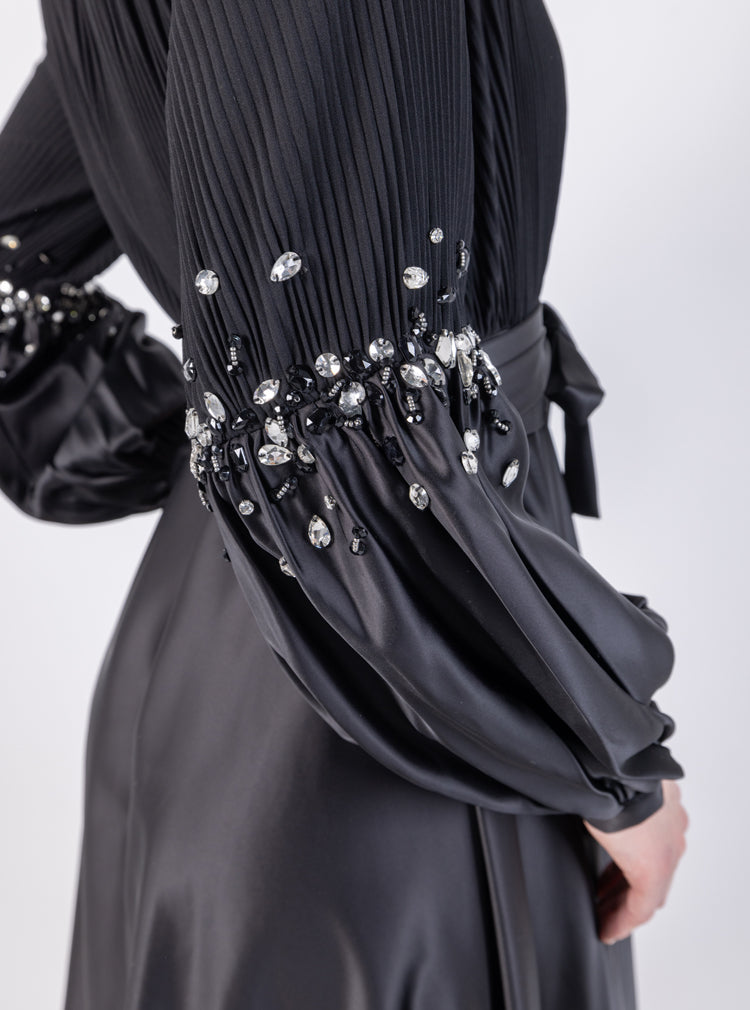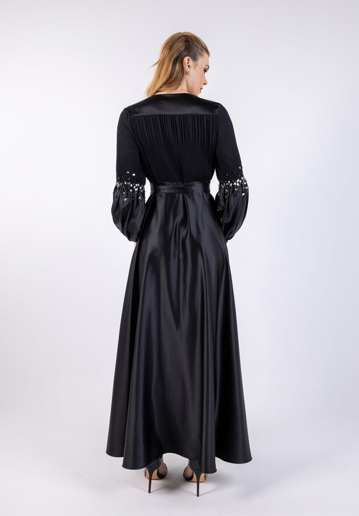 Step into timeless elegance with this stunning pleated maxi dress, featuring a beautifully embellished V-neckline and voluminous balloon sleeves with intricate embellishments. The dress cinches at the waist with a satin belt, creating a flattering silhouette and adding a touch of sophistication. The flowing A-line skirt adds grace and movement, making it a perfect choice for special occasions and evening events. Pair it with statement accessories to complete the glamorous look.