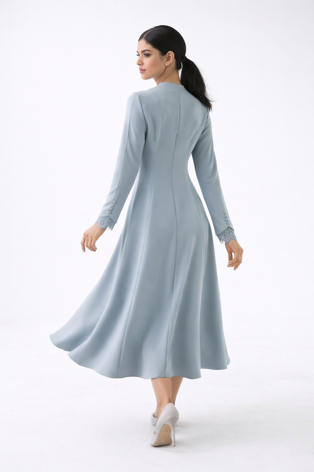 Designed for refined Ramadan gatherings and elegant Eid occasions, this graceful maxi dress blends timeless modesty with modern femininity. The design features a clean stand collar with a subtle keyhole opening, finished with a fabric-covered button for a polished neckline detail. A softly sculpted twist detail at the waist creates elegant draping across the bodice, enhancing the silhouette while maintaining fluid movement. Long sleeves are accented with delicate lace-trimmed cuffs and fabric-covered buttons, adding a romantic handcrafted touch. The flared hemline flows beautifully with every step, making this piece both sophisticated and effortlessly wearable.