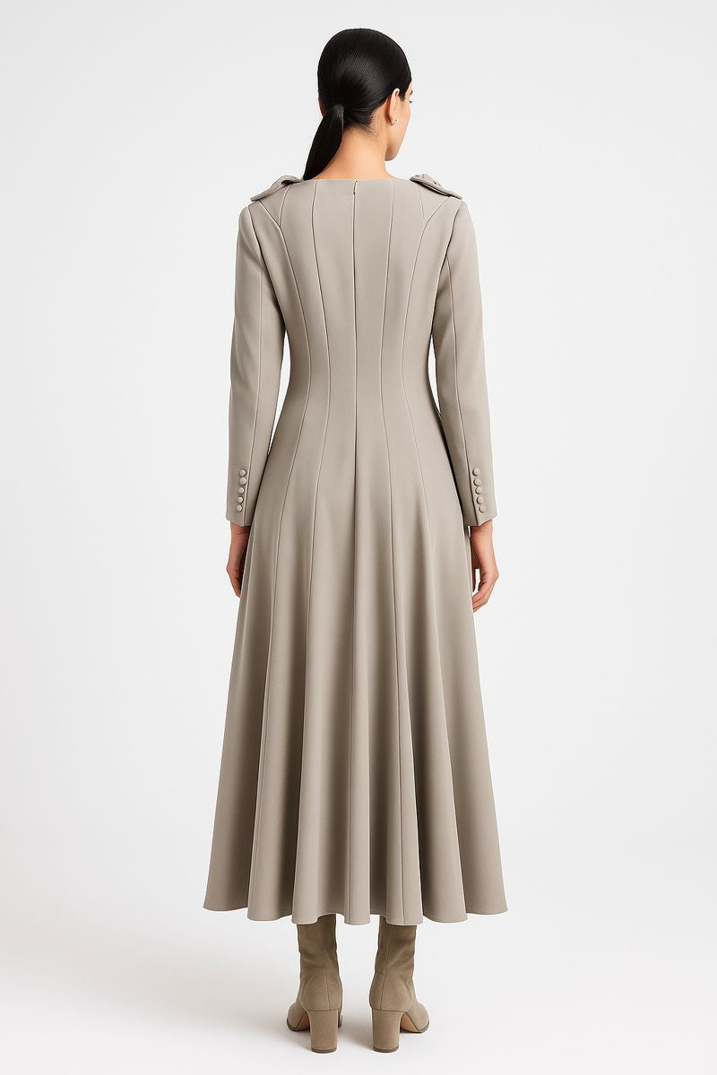 A refined expression of modern elegance, the Aurelia Sculpted Midi Dress is designed to flatter with precision tailoring and understated luxury. Crafted with a structured yet fluid silhouette, this dress features a softly contoured bodice enhanced by vertical panel seams that elongate the form and define the waist with architectural finesse.