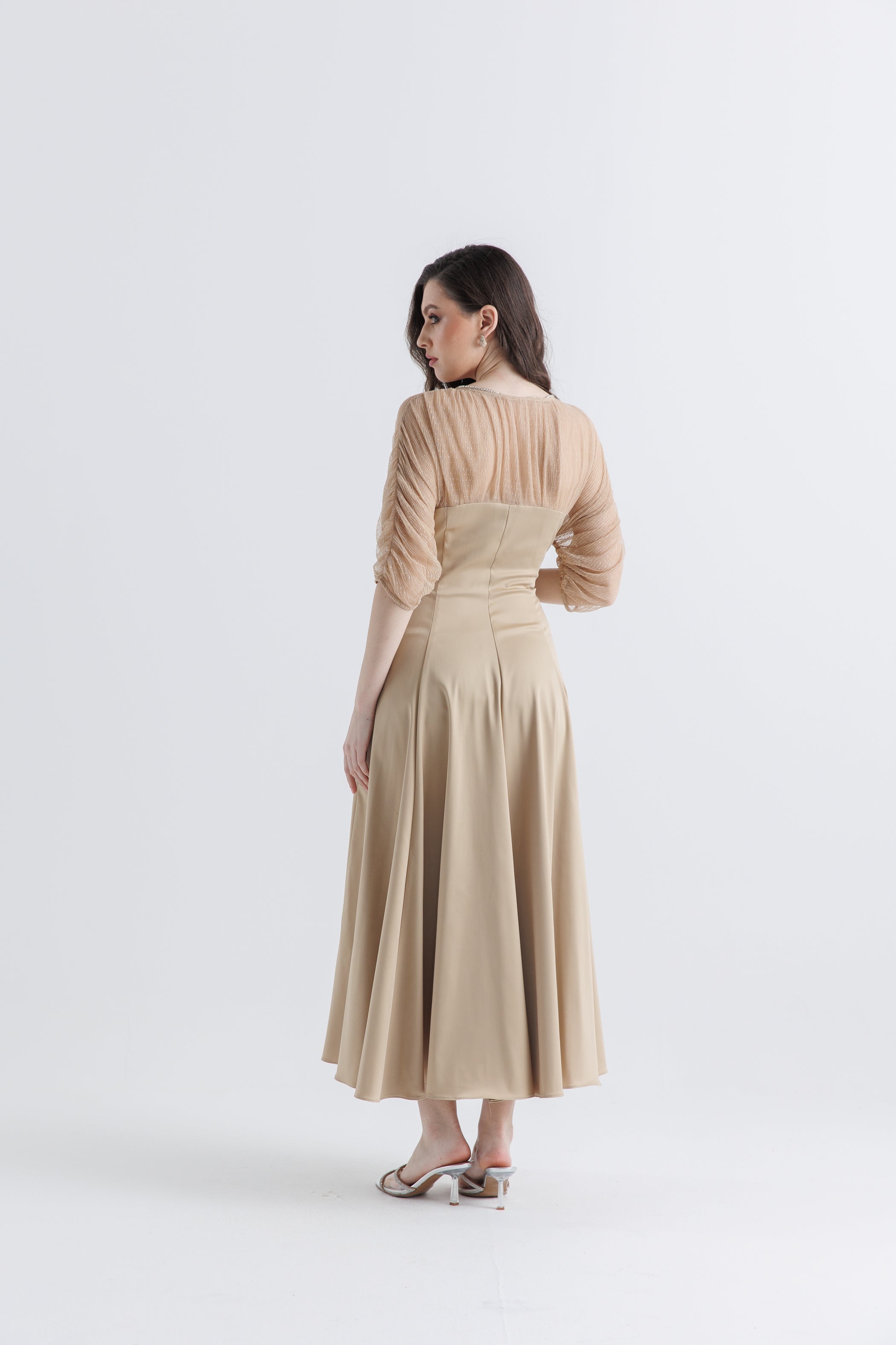 Step into elegance with this flowing satin dress, featuring a structured A-line silhouette and luxurious crystal embellishments. The standout detail lies in the sheer gathered net fabric adorning the upper bodice and sleeves—delicate, lightweight, and subtly textured for a soft, feminine touch.