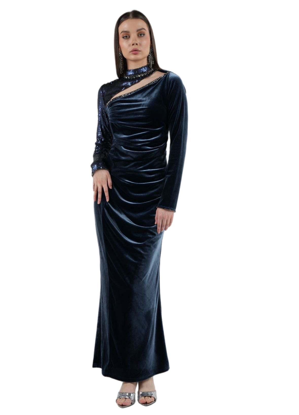 Turn heads with this stunning asymmetrical velvet gown that exudes elegance and sophistication. The gown features a unique cutout neckline adorned with sparkling embellishments for a bold, glamorous look. The combination of rich velvet fabric and one sequined sleeve creates a perfect blend of textures, adding dimension to your outfit.