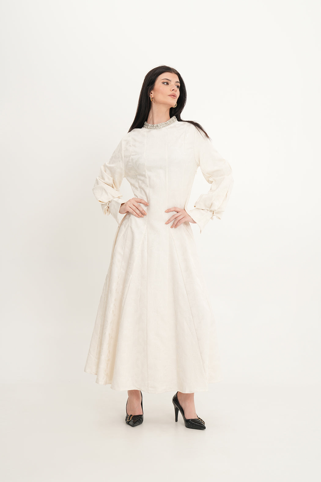 Elegance meets structure in this luxurious jacquard A-line dress, designed for refined evening occasions. The dress features a softly flared silhouette that flows gracefully to an approximate length of 135 cm. The intricate textured jacquard weave adds depth and subtle shimmer to the fabric, while the high neckline is adorned with sparkling embellishments for a touch of opulence. Voluminous long sleeves with tailored cuffs add a regal, modern twist to the timeless design.