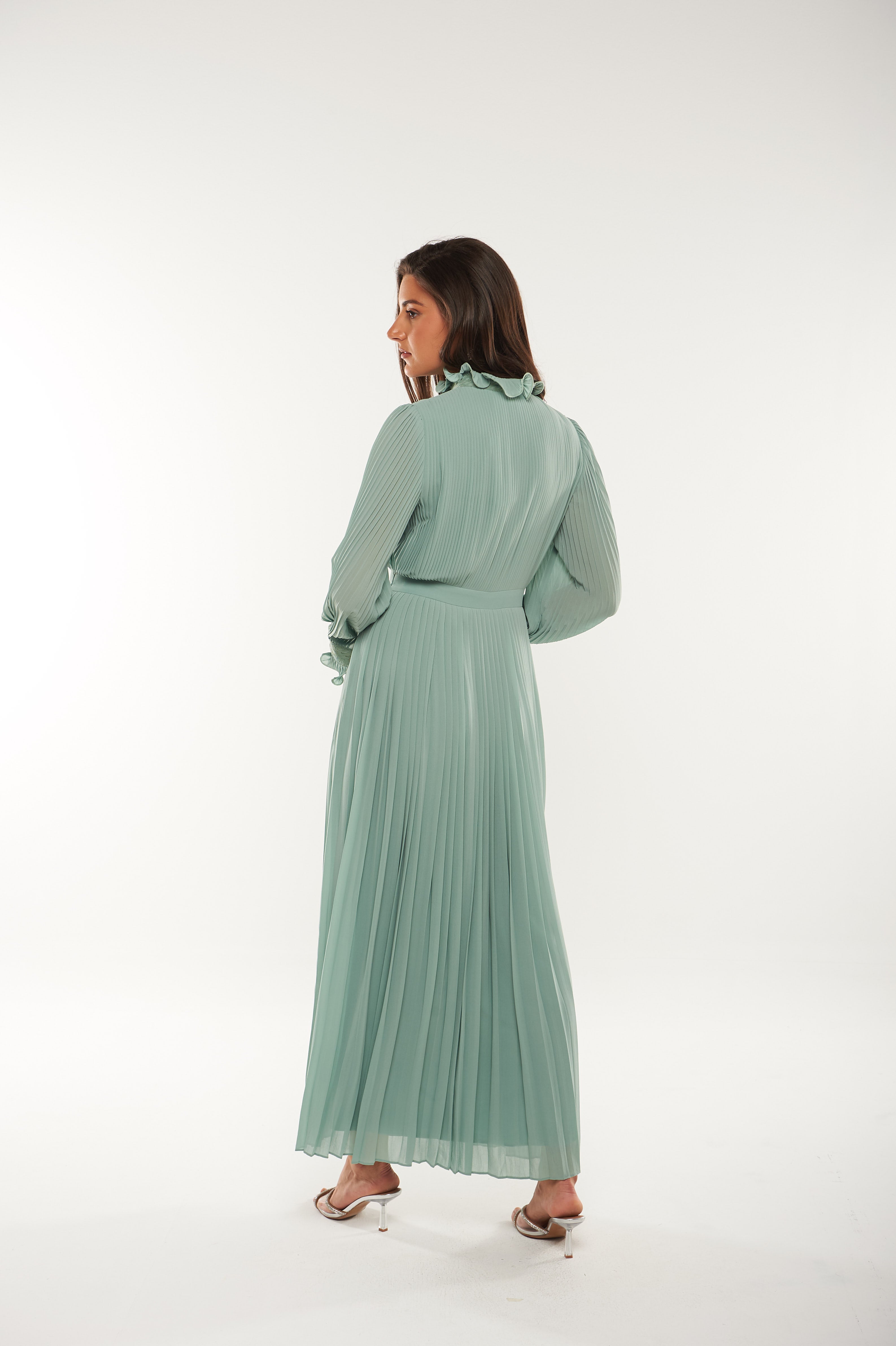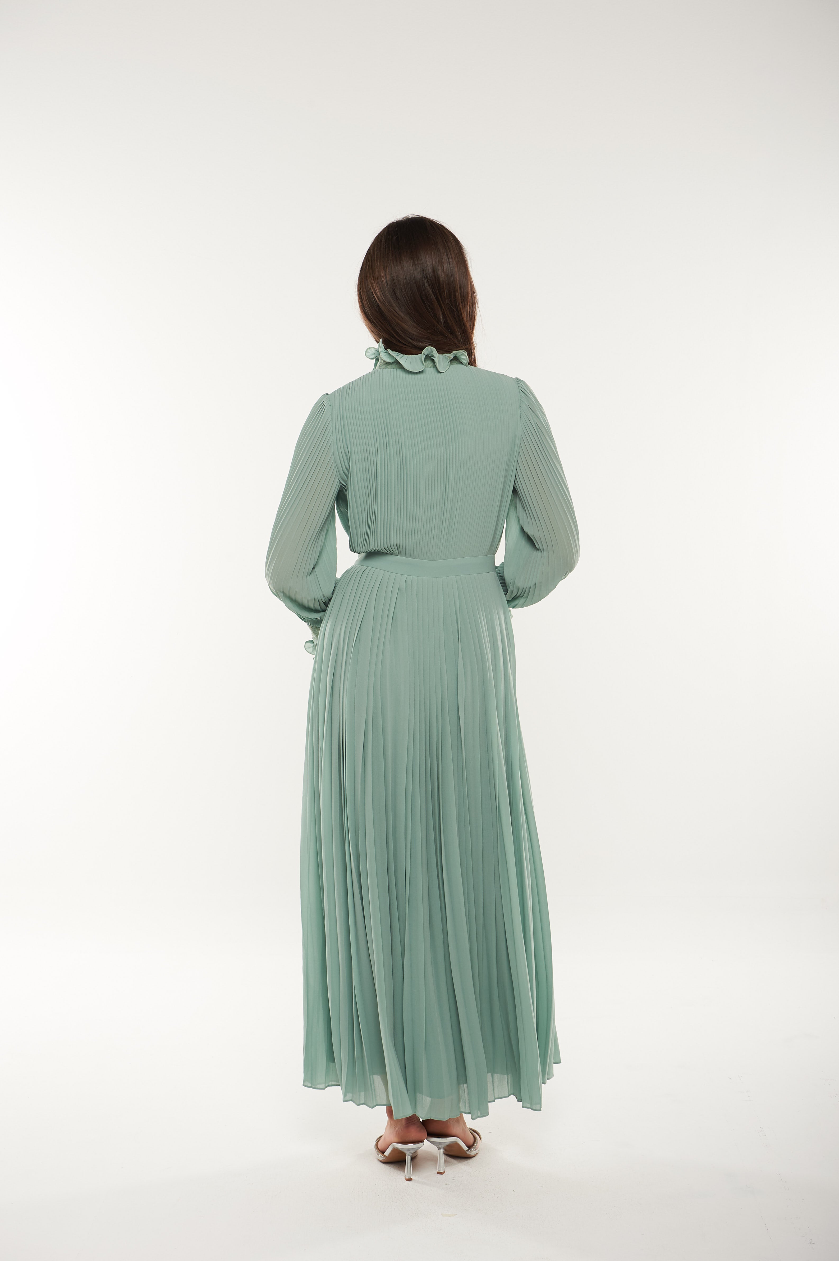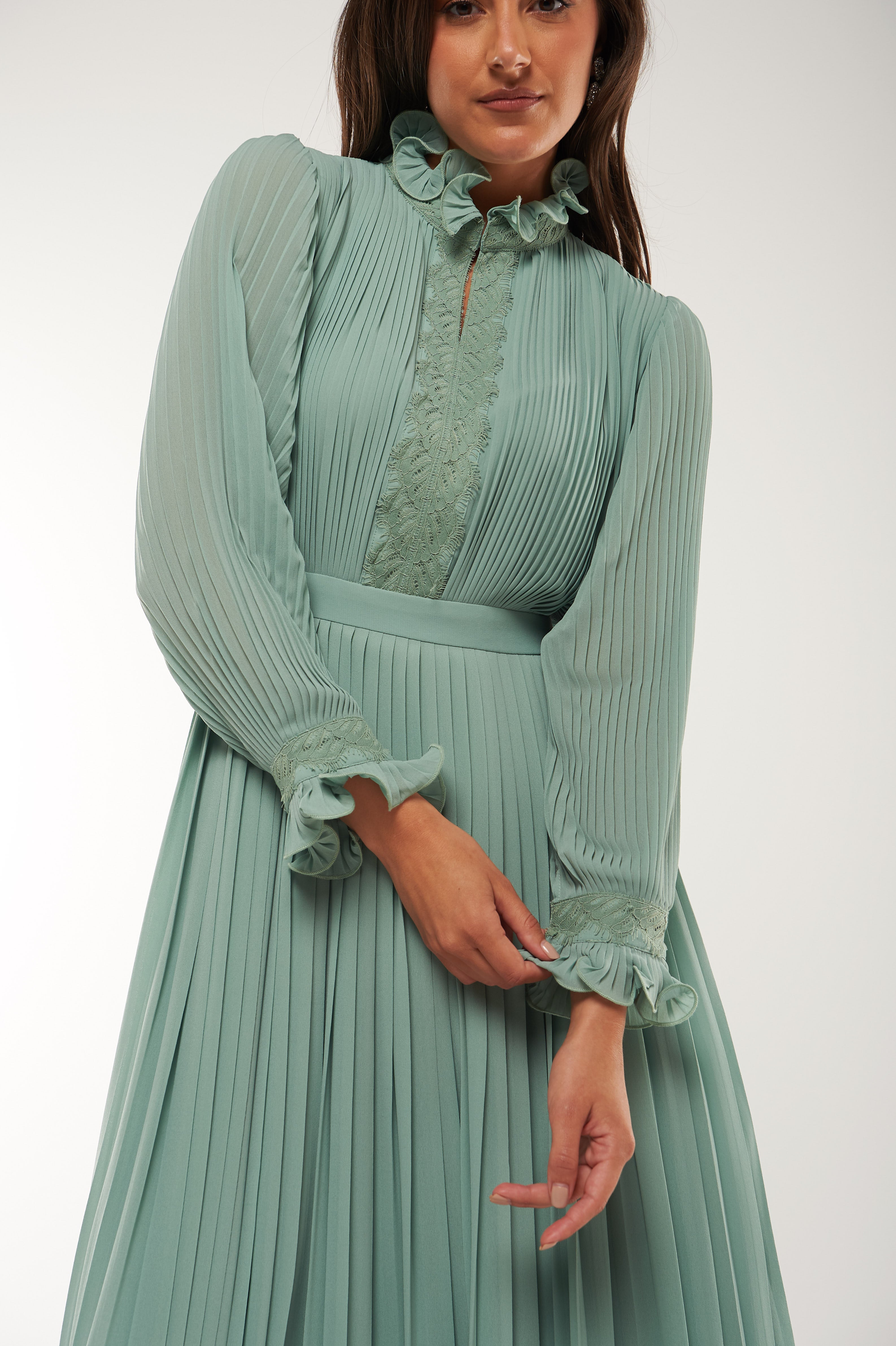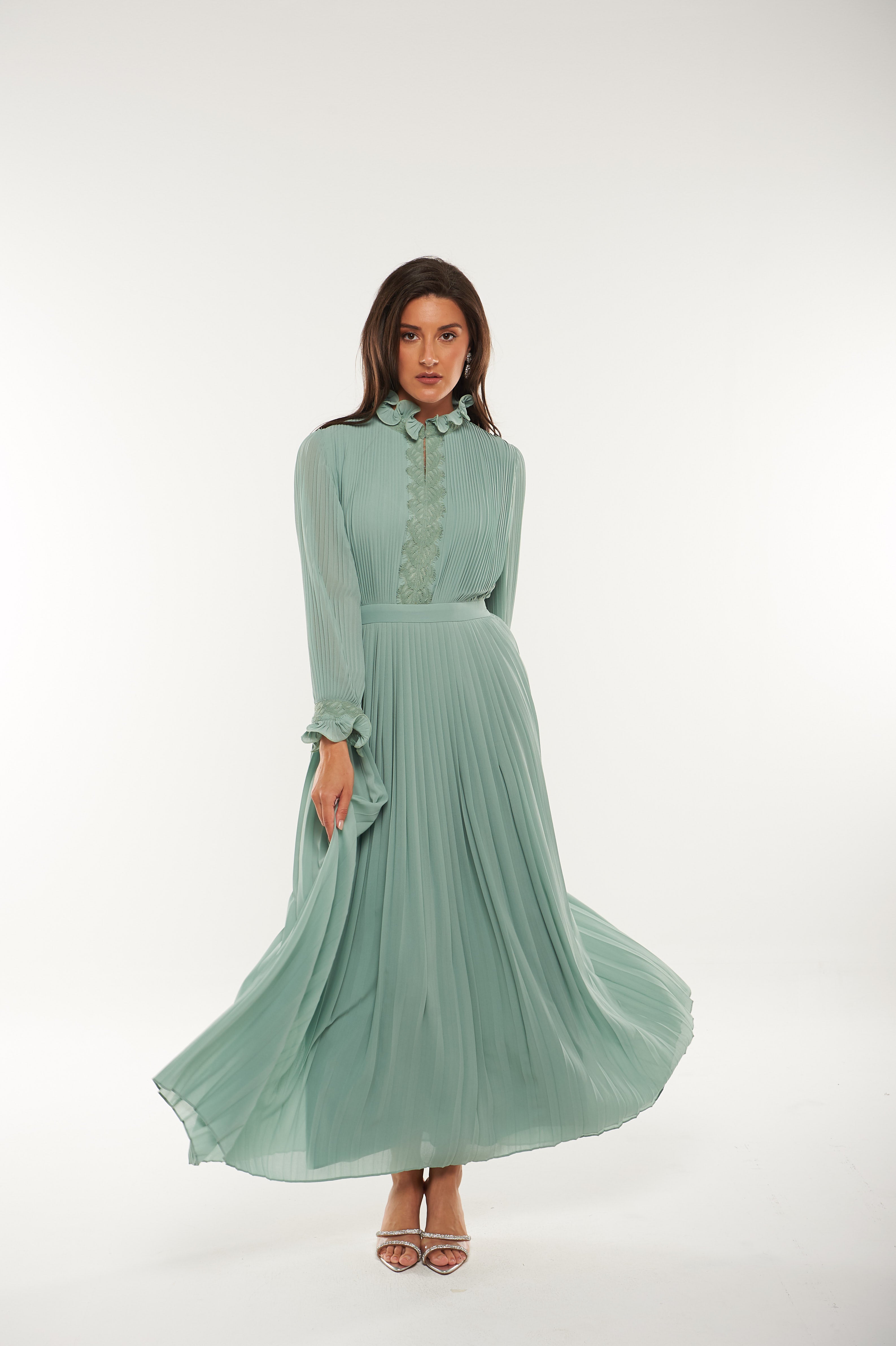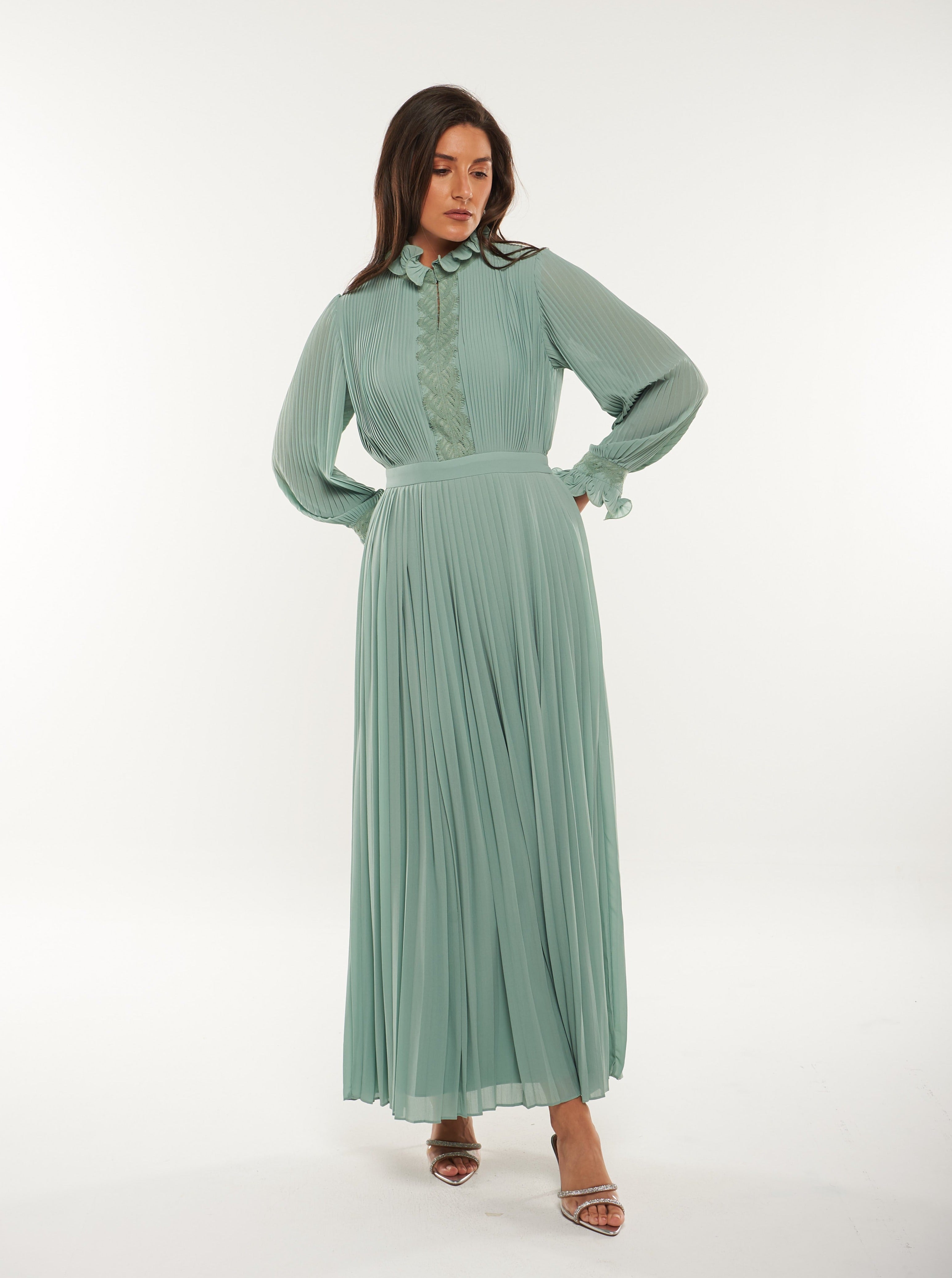 Step into refined elegance with this pleated high-neck maxi dress, crafted to capture both grace and charm. Featuring delicate lace trim along the front and sleeve cuffs, this dress balances vintage inspiration with modern sophistication. The full-length pleated skirt adds volume and flow, while the soft, lightweight fabric ensures effortless movement—perfect for formal occasions or stylish gatherings.