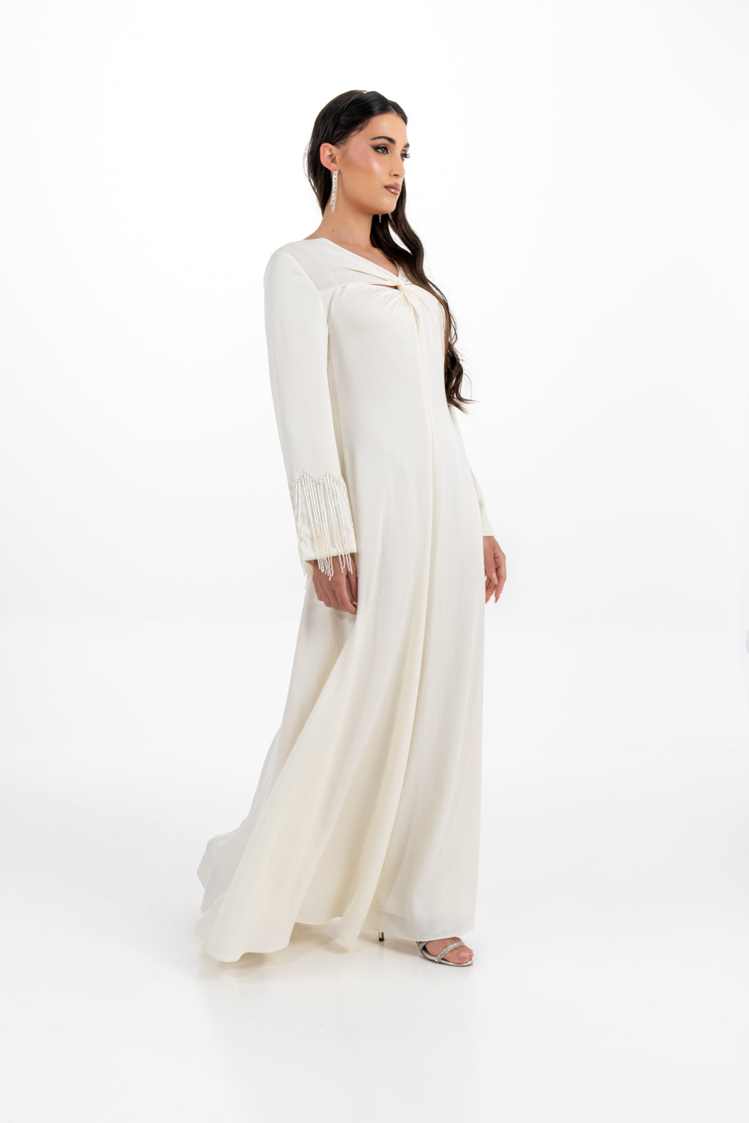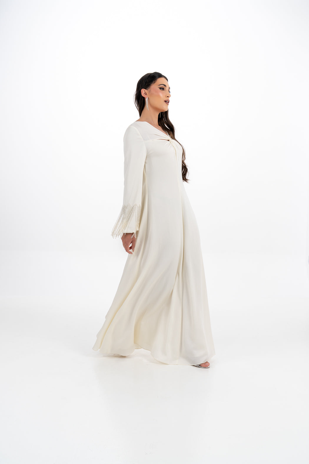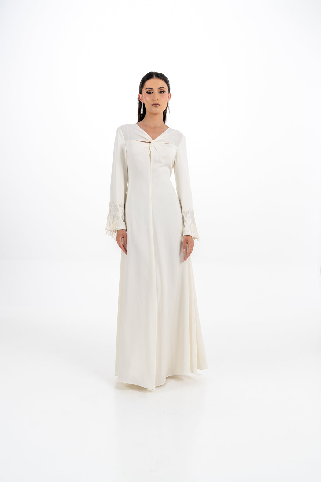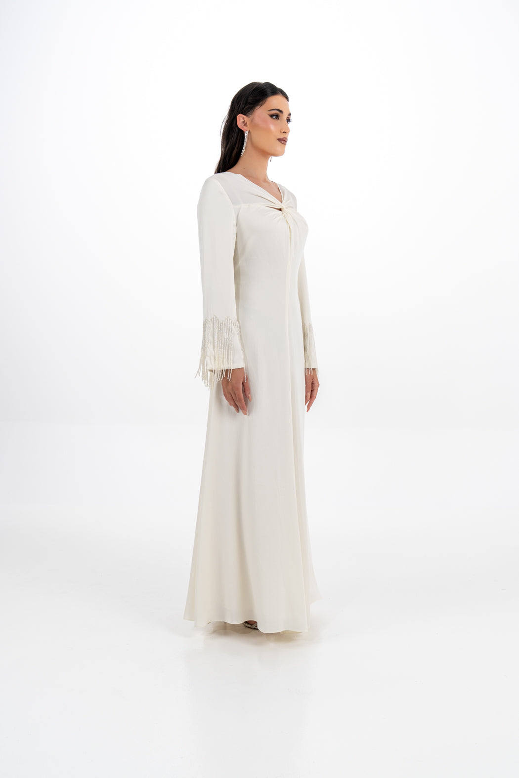 Graceful elegance meets modern charm in this full-length maxi dress featuring a twisted front neckline and shimmering stone tassel details on the cuffs. Crafted from a premium crepe blend and fully lined for comfortable wear, this dress flows effortlessly with every step. The back zipper provides a sleek finish, while the refined silhouette makes it a standout choice for Ramadan evenings, special dinners, or formal events.