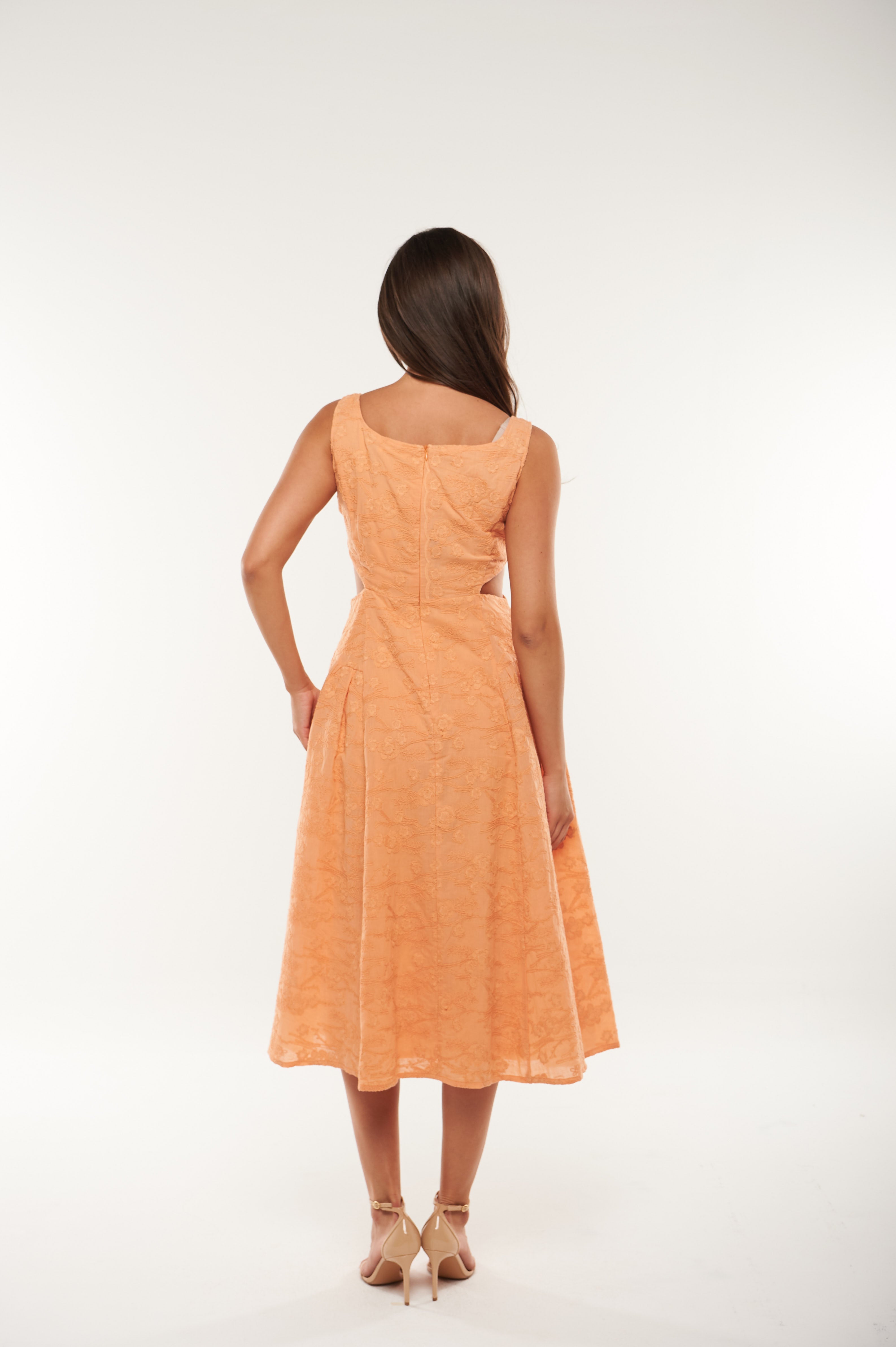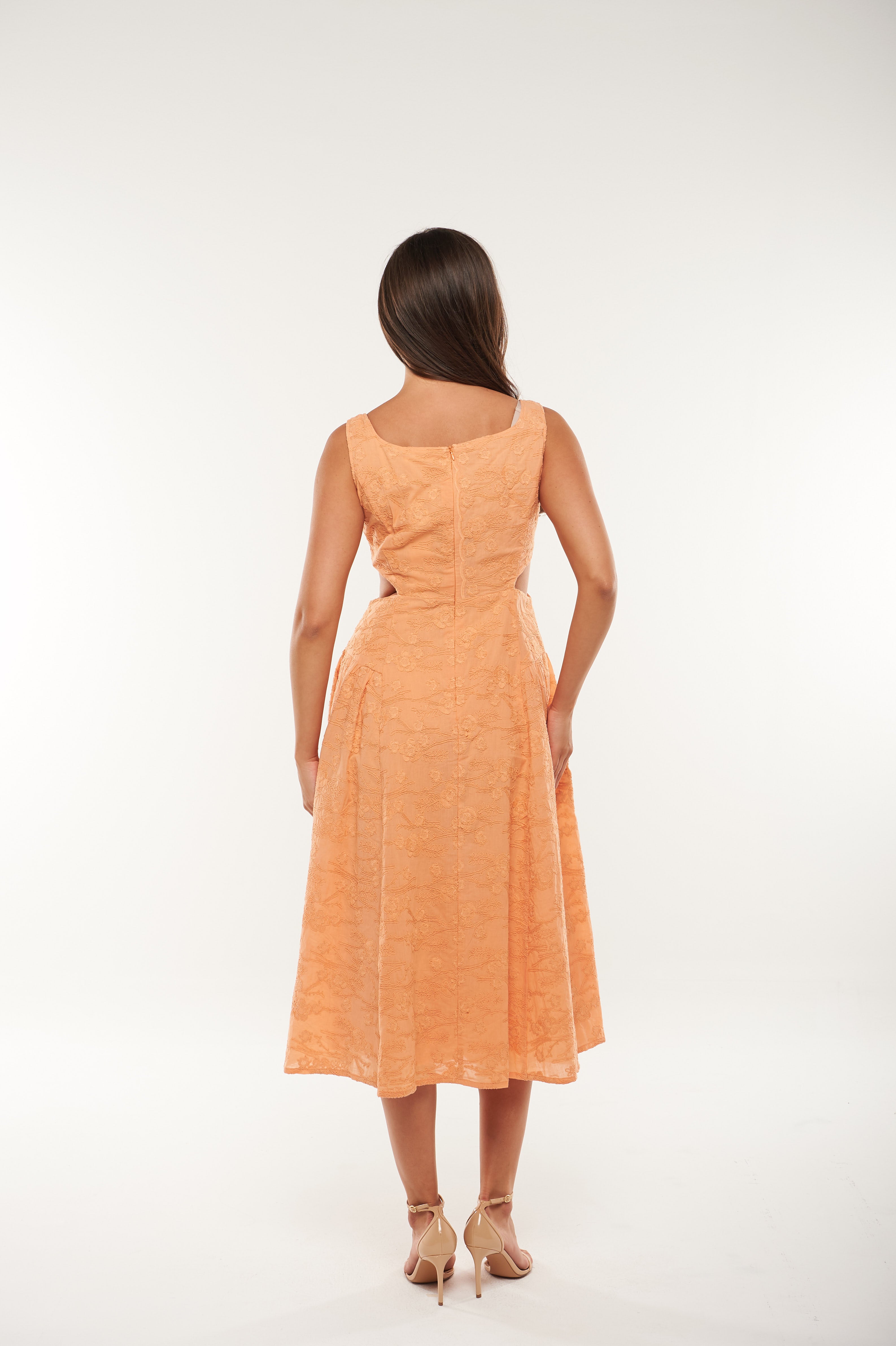Elevate your day-to-evening style with this timeless A-line midi dress, crafted in delicately embroidered fabric for a refined and feminine feel. The design features a flattering square neckline, wide shoulder straps, and elegant side cut-outs that enhance the silhouette while adding a touch of modern charm.