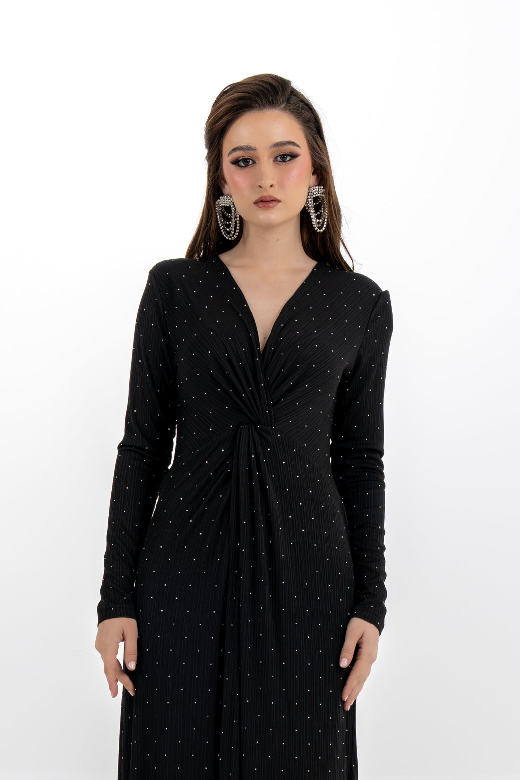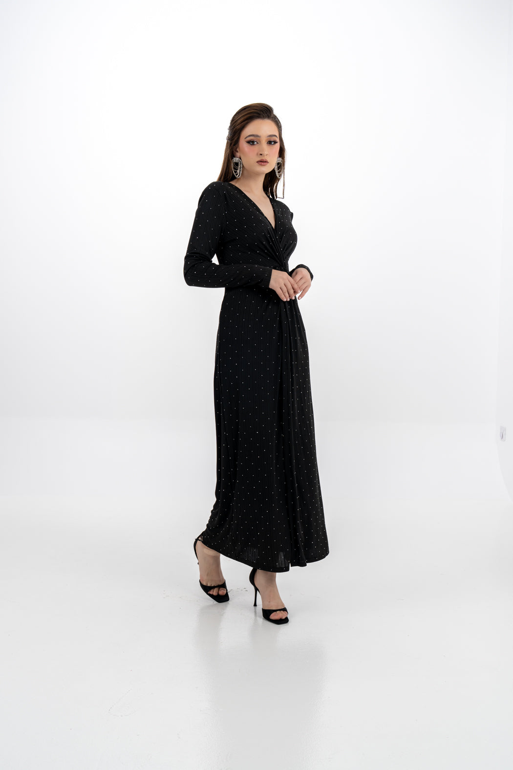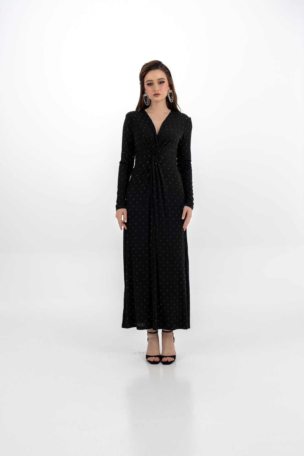 A refined choice for evening wear, this elegant maxi dress is crafted from a soft stretch fabric and adorned with subtle lead dot embellishments that offer a touch of shimmer without being overpowering. The design features a flattering front knot detail at the waist that enhances the silhouette with a gentle drape. Its clean, minimalist cut is elevated by a V-neckline and long sleeves, making it a timeless piece for formal occasions.