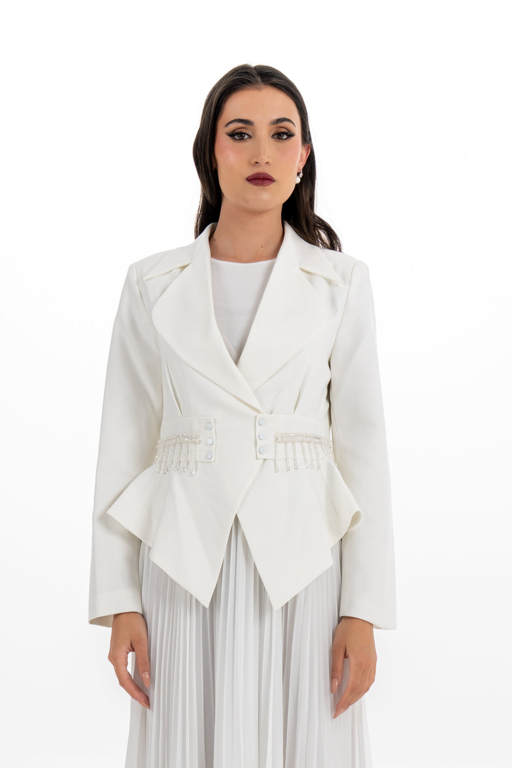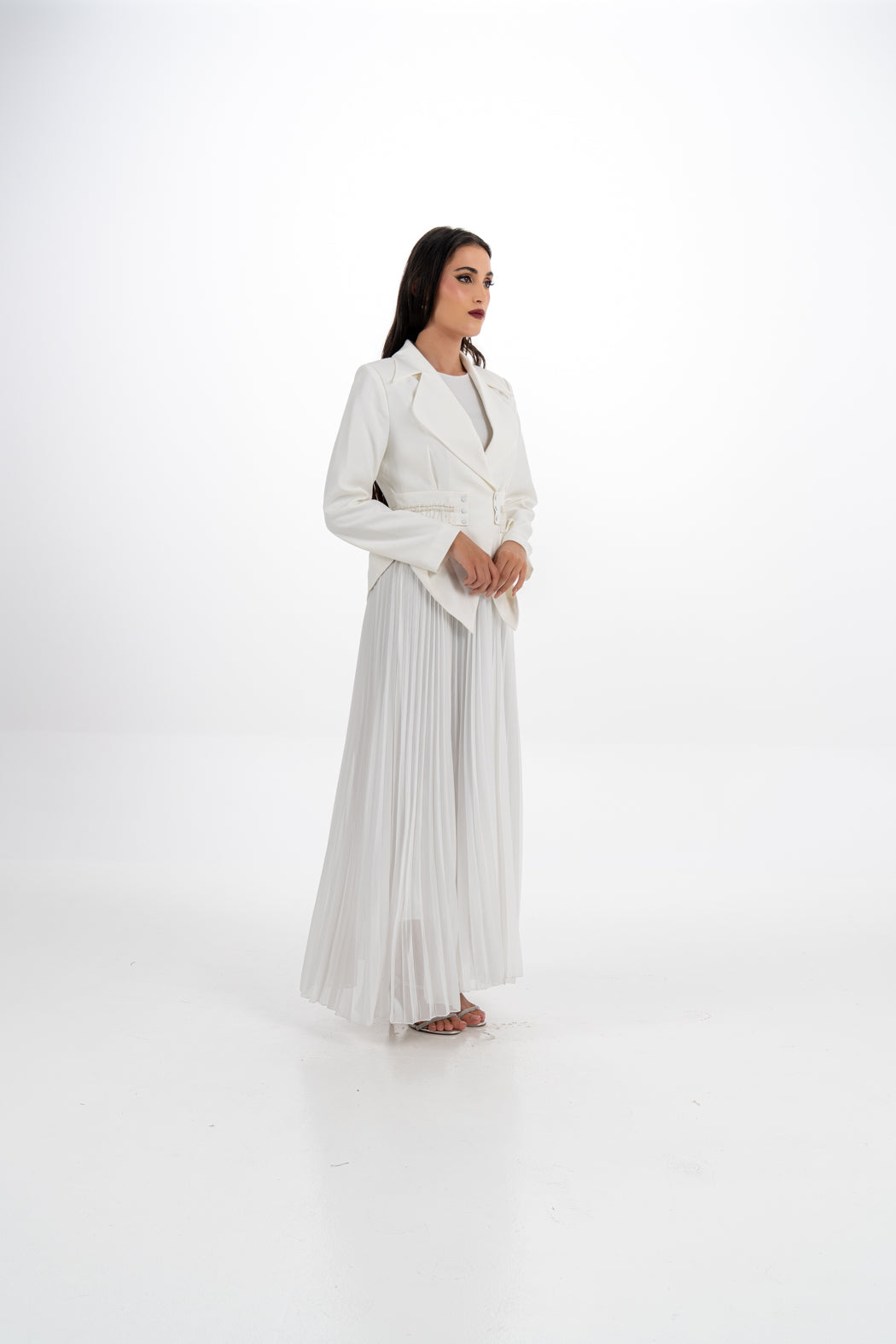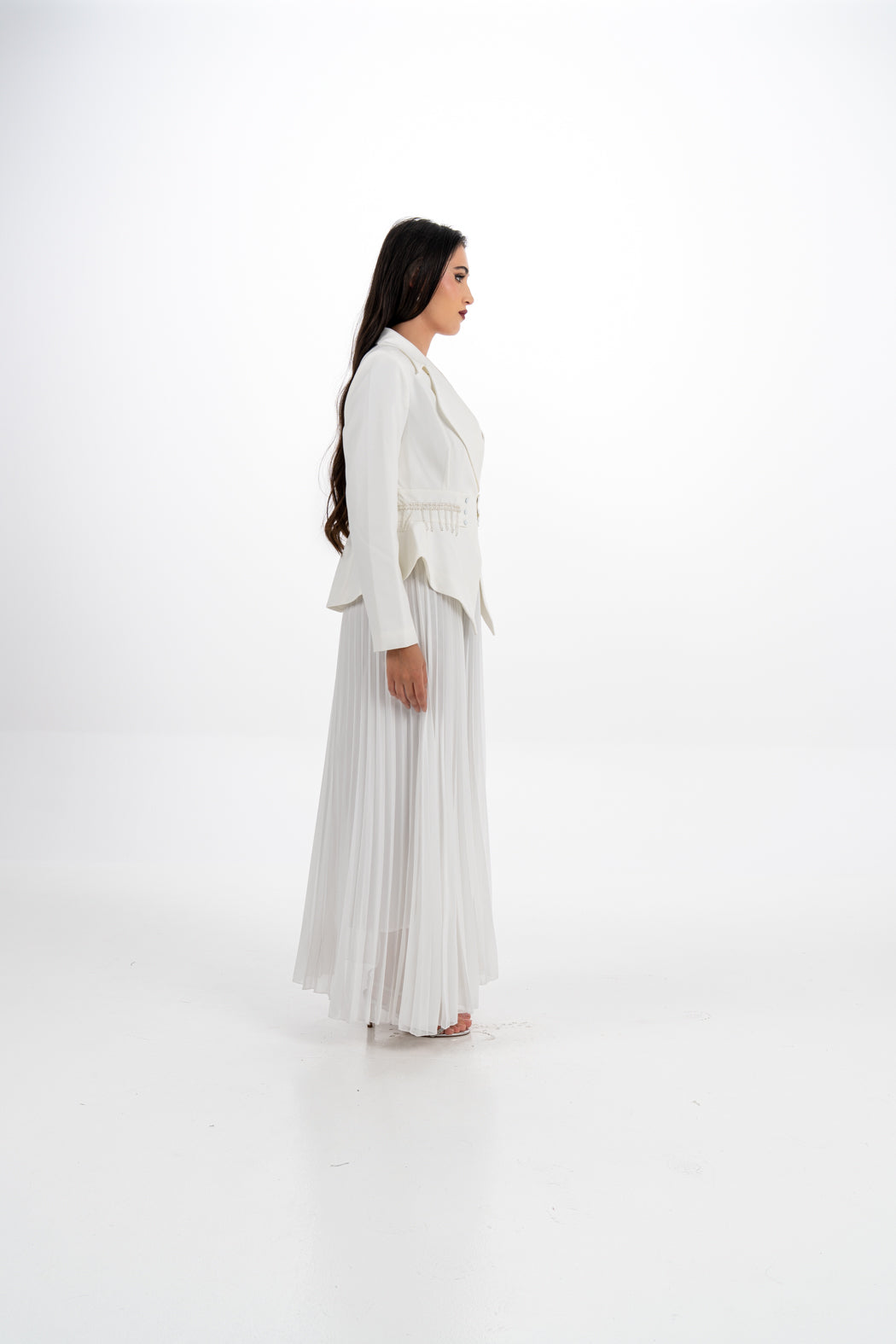 A graceful ensemble that blends elegance with versatility. This sleeveless maxi dress features delicate pleats and a cinched waistline that enhances the silhouette with subtle sophistication. The removable tailored jacket adds a statement touch, adorned with shimmering beadwork at the waist and a sculpted hem that accentuates the shape. Wear them together for a refined formal look or style the dress alone for understated charm.