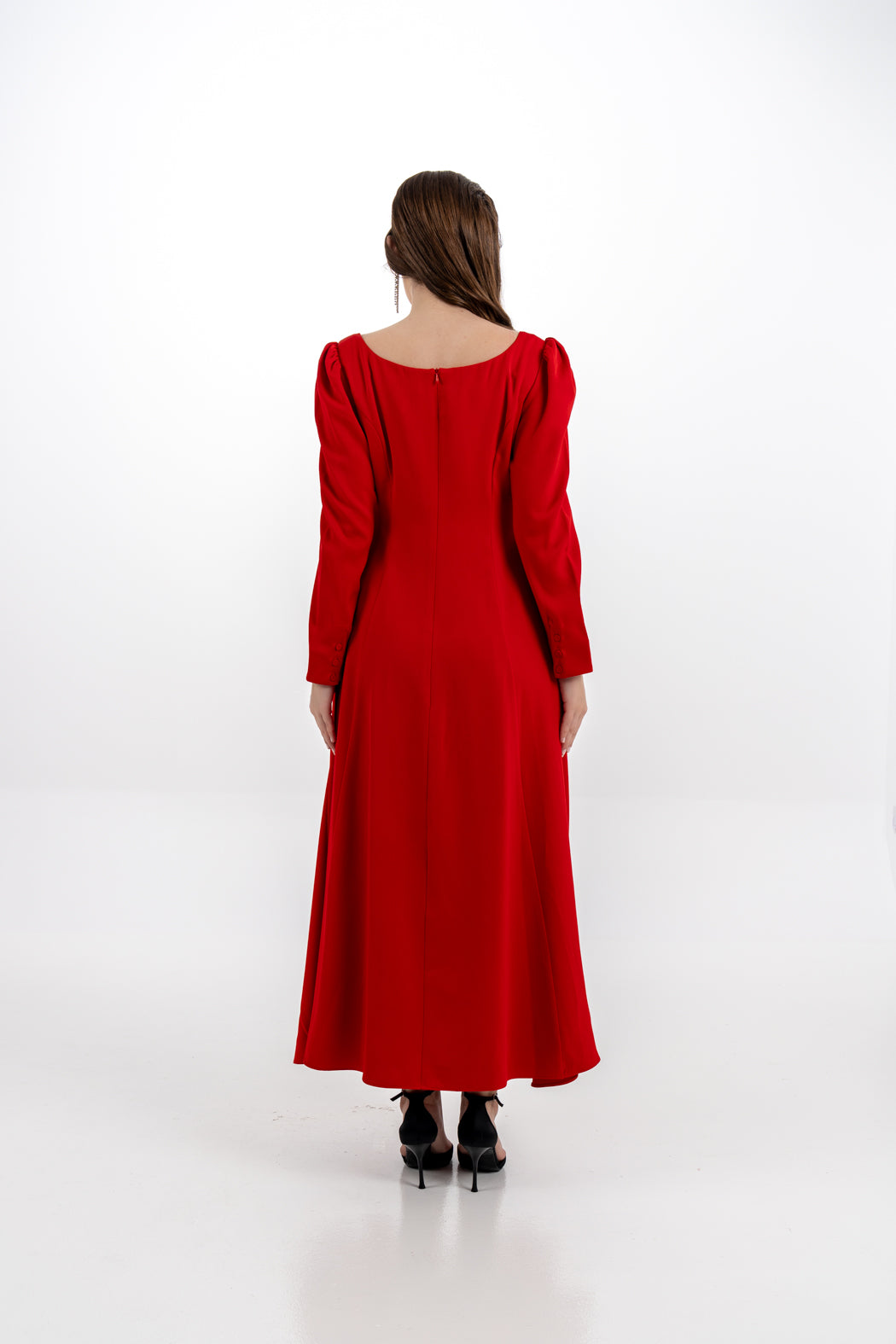 Graceful and timeless, this long-sleeve maxi dress is the perfect choice for your special occasions. Designed with a flattering square neckline and gentle pleats that flow from the bodice, it offers elegance with every step. The delicate embellishments along the pleats add a touch of sparkle, while the buttoned cuffs enhance the classic charm. Made for both comfort and sophistication, the full-length silhouette (approximately 136 cm) creates a graceful and refined presence.