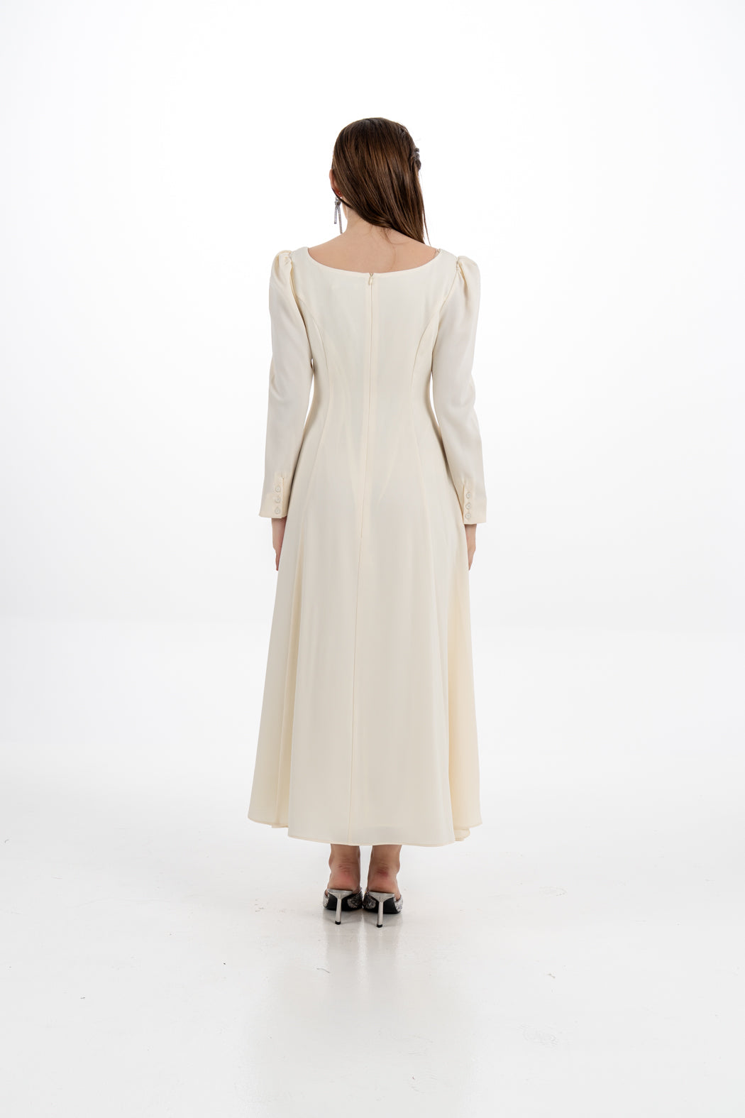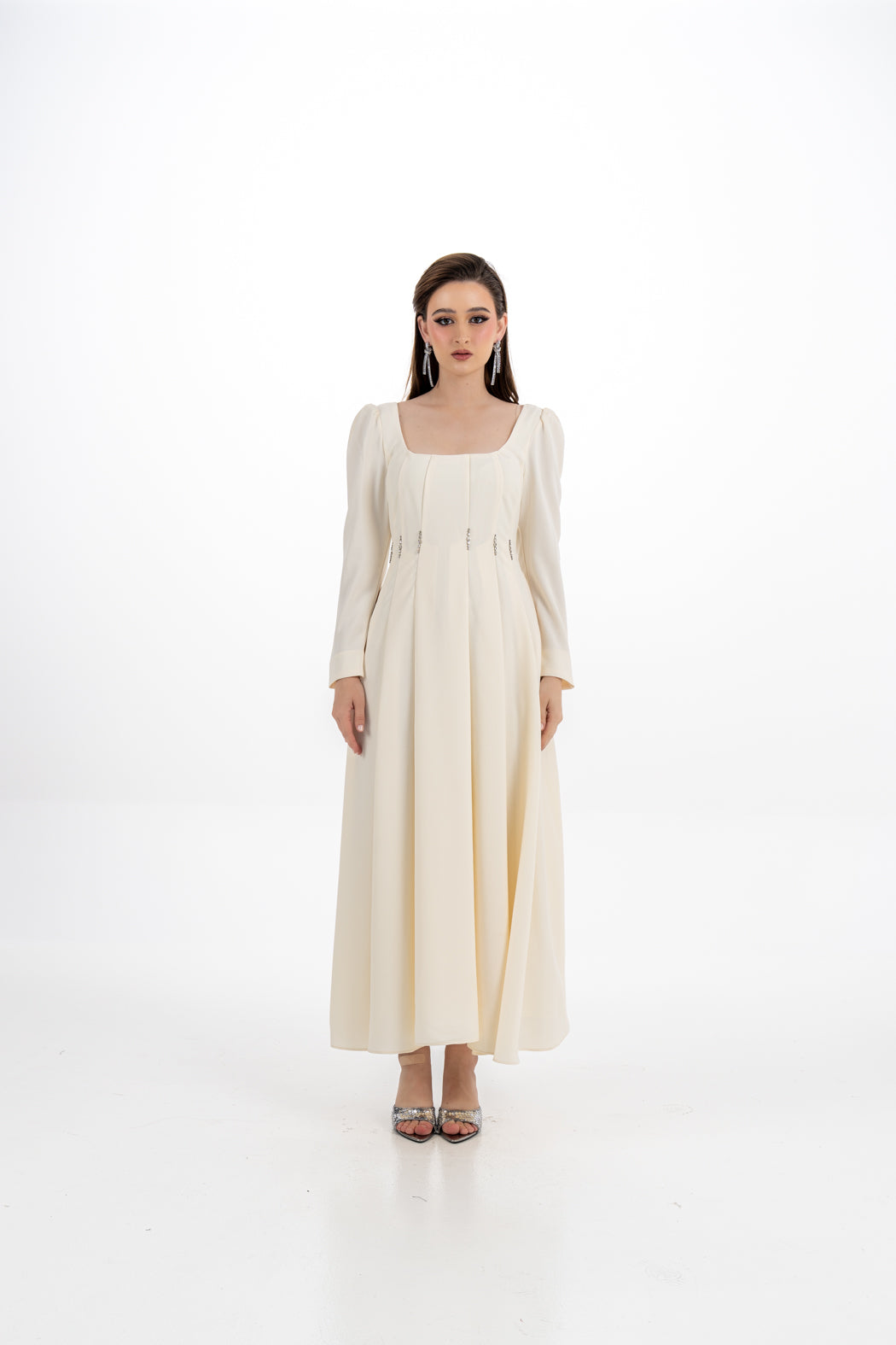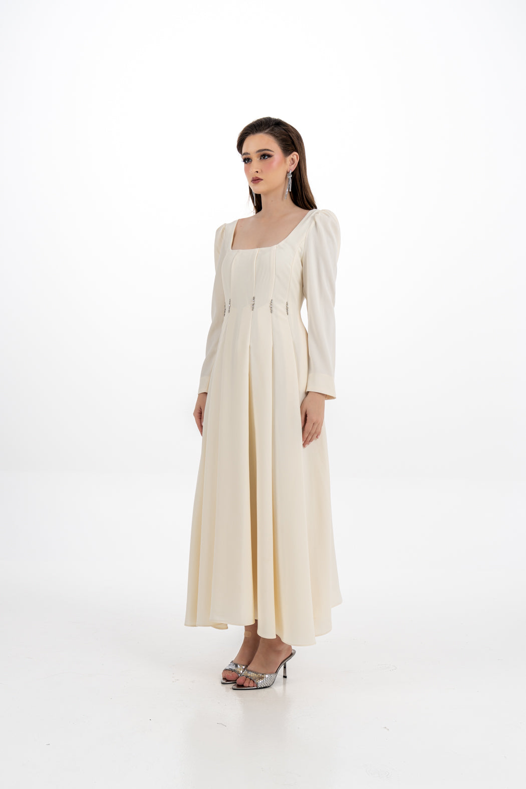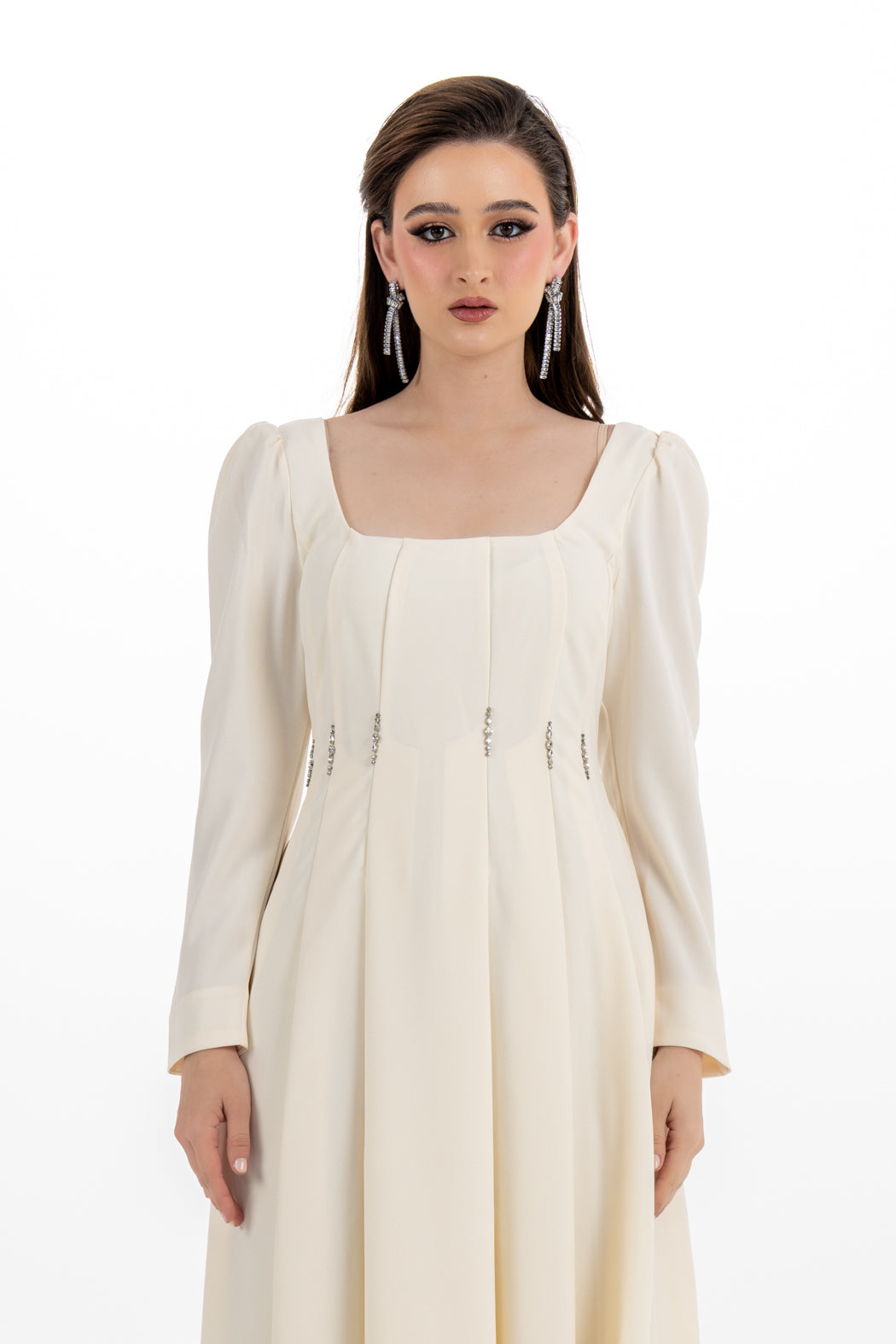 Graceful and timeless, this long-sleeve maxi dress is the perfect choice for your special occasions. Designed with a flattering square neckline and gentle pleats that flow from the bodice, it offers elegance with every step. The delicate embellishments along the pleats add a touch of sparkle, while the buttoned cuffs enhance the classic charm. Made for both comfort and sophistication, the full-length silhouette (approximately 136 cm) creates a graceful and refined presence.