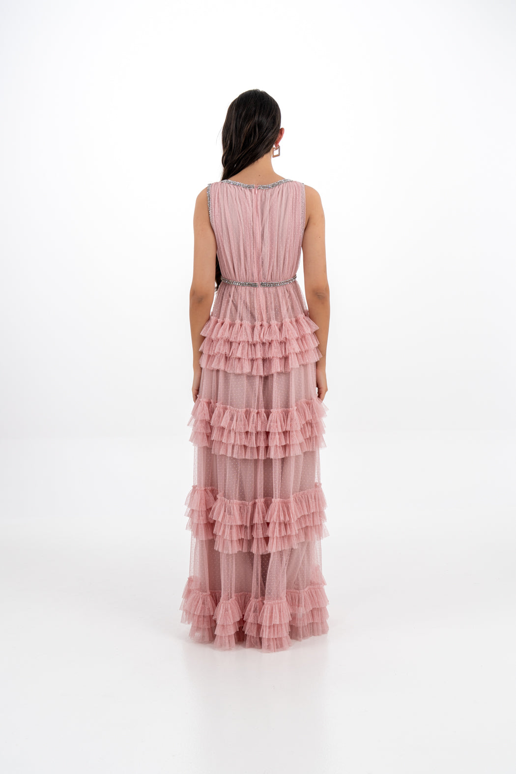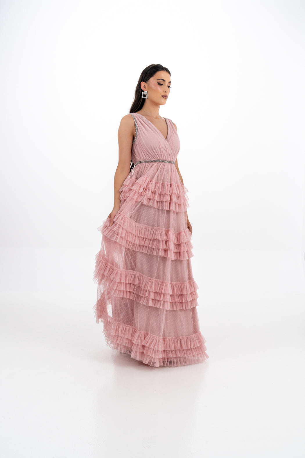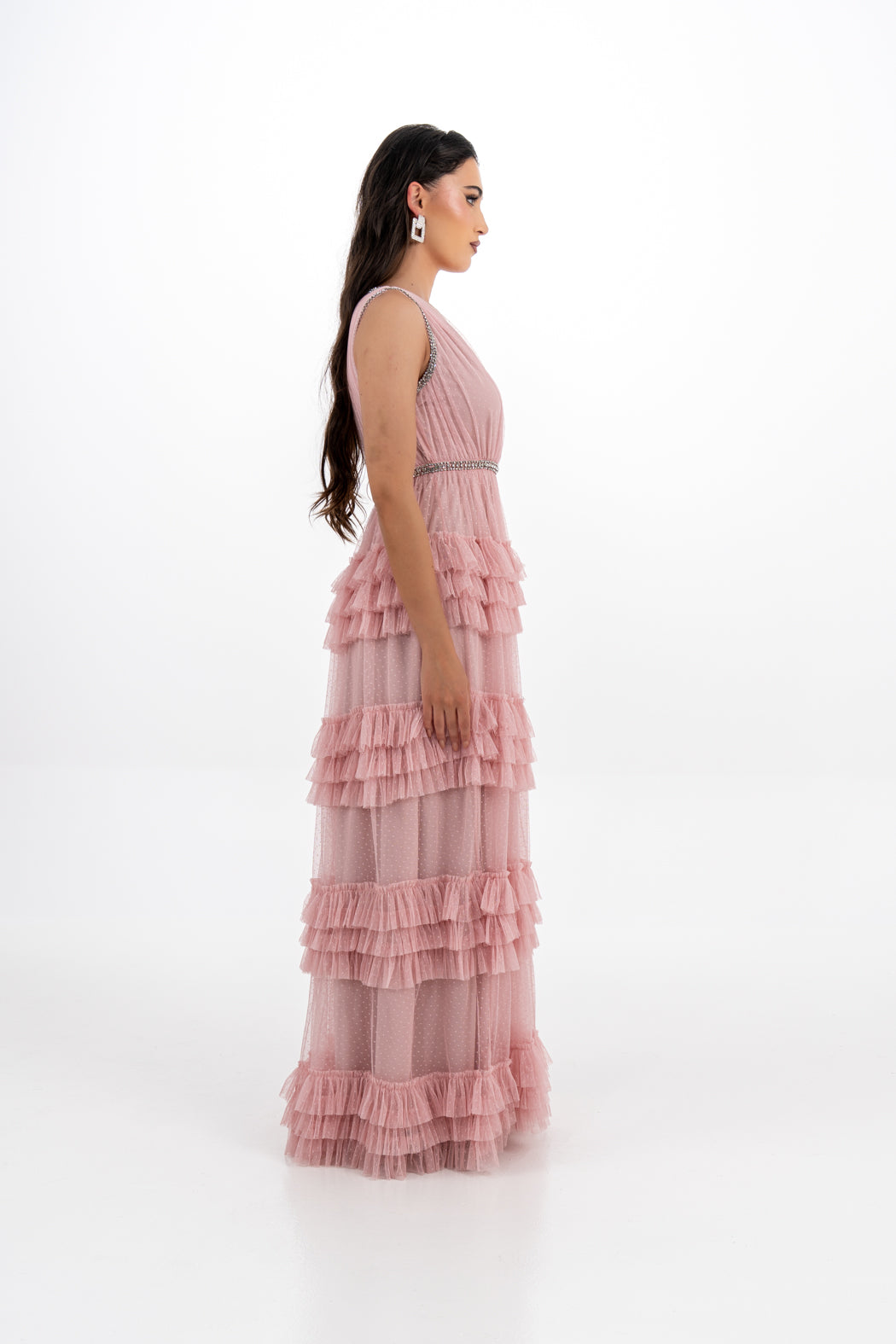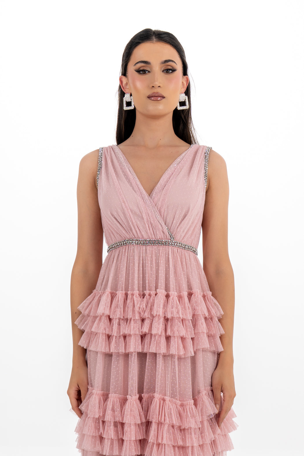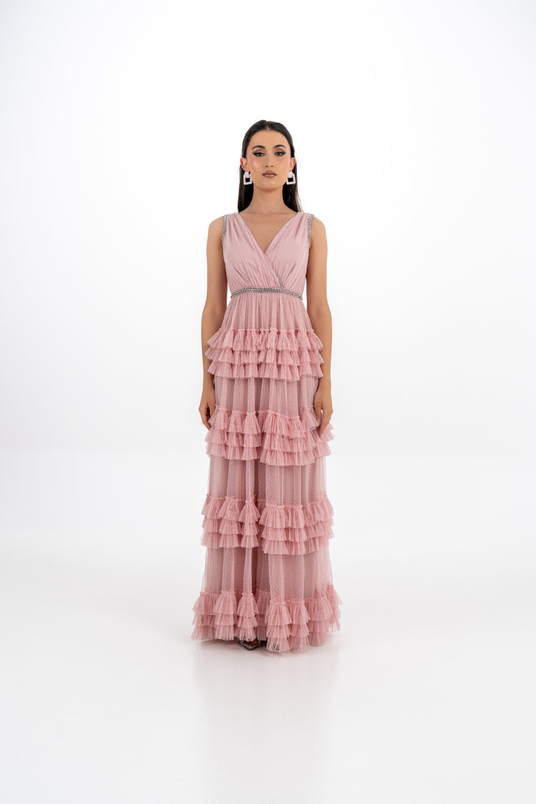 Elevate your eveningwear with this enchanting ruffle-layered gown, crafted from dotted mesh for a romantic texture. The sleeveless design features a flattering V-neckline and a criss-cross bodice that’s accented with dazzling crystal trims. A tiered ruffle skirt flows elegantly to the floor, creating graceful movement with every step. Perfect for formal occasions, weddings, and special celebrations.