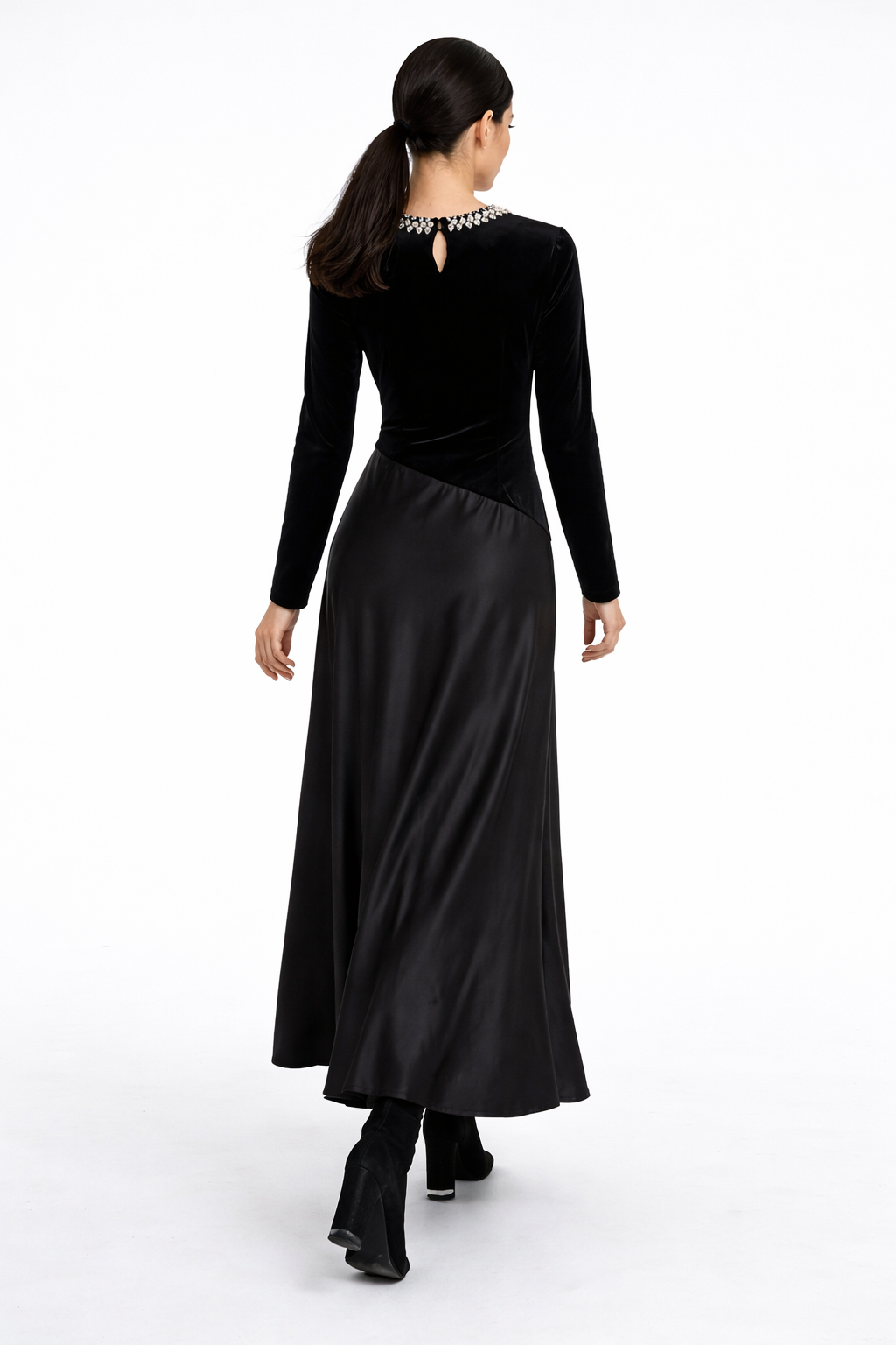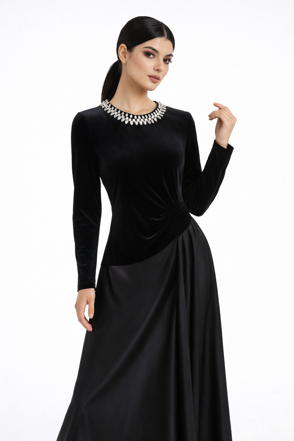 The design features a classic round neckline adorned with delicate embellishments, adding a subtle touch of luxury. Soft pleated detailing at the waist enhances the shape and creates a graceful drape that flows seamlessly into the maxi skirt made from a contrasting fabric. Long fitted sleeves complete the polished, winter-ready look.