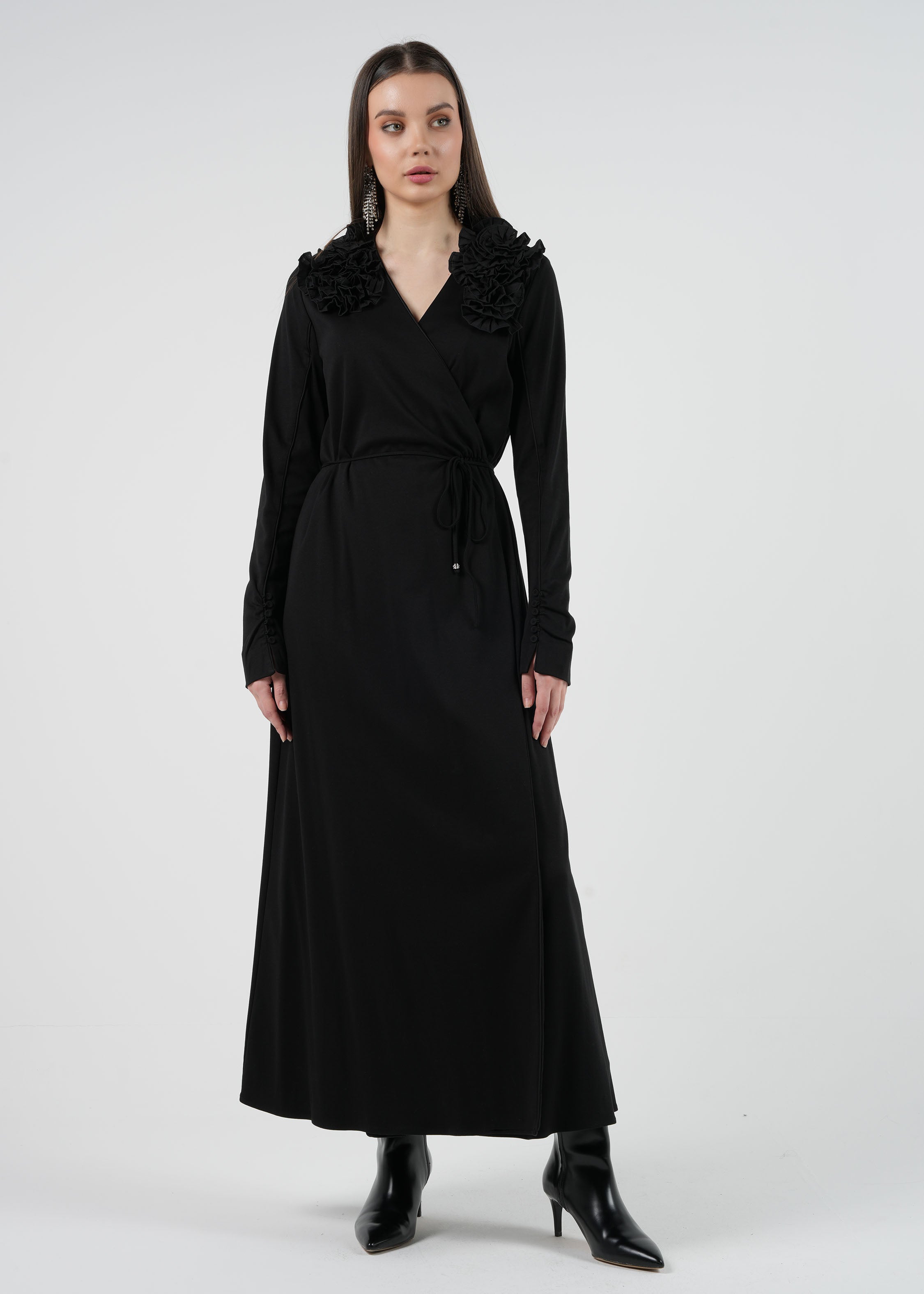 Step into elegance with this Floral Appliqué Wrap Maxi Dress, designed for effortless style and comfort. Featuring a flattering wrap-style silhouette, this dress ties at the waist for a customized fit. The statement floral appliqués on the shoulders add a chic and feminine touch, making it perfect for both casual and formal occasions. Long sleeves with delicate button accents enhance the sophisticated look, while the full-length maxi design ensures a graceful flow.
