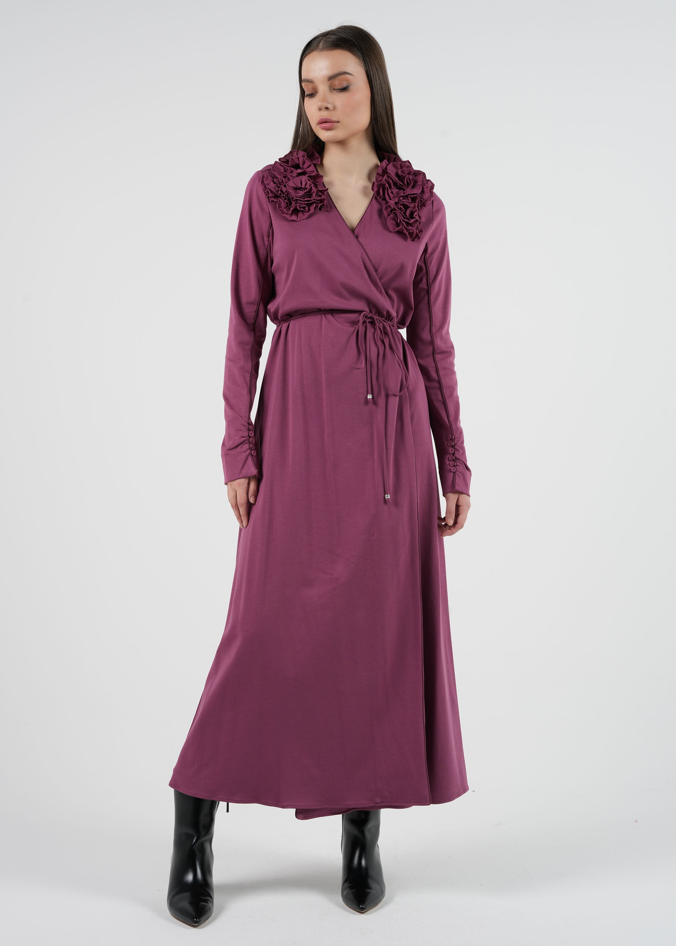 Elevate your style with this Floral Appliqué Wrap Maxi Dress, a perfect blend of elegance and sophistication. The flattering wrap-style front cinches at the waist with a delicate tie, offering a customizable fit. The beautifully crafted floral appliqués on the shoulders add a touch of femininity and charm. Long sleeves with subtle button details complete the refined look, making it an ideal choice for special occasions and elegant gatherings.