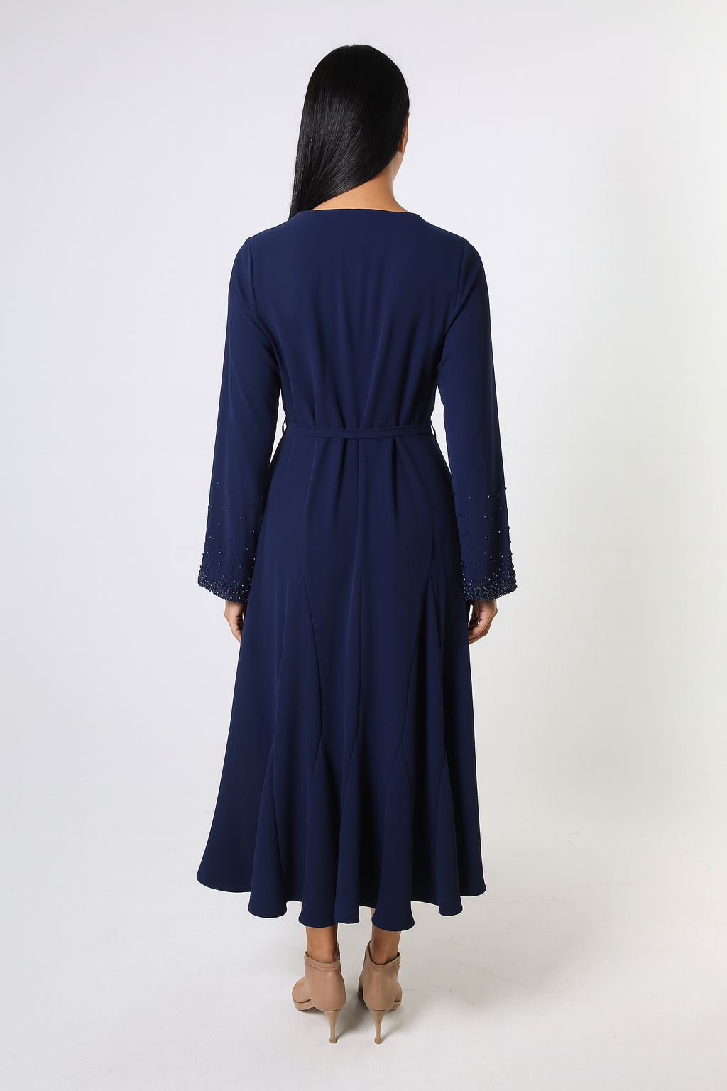 Elevate your wardrobe with this sophisticated wrap-style midi dress, designed to exude timeless elegance. Crafted with a graceful A-line silhouette, it features a flattering V-neckline, long sleeves adorned with intricate bead embellishments, and a flowing skirt that moves beautifully with every step. A defined waist enhances the feminine shape, while the fluid drape offers a luxurious finish. Perfect for special occasions, evening events, or elegant daytime gatherings.