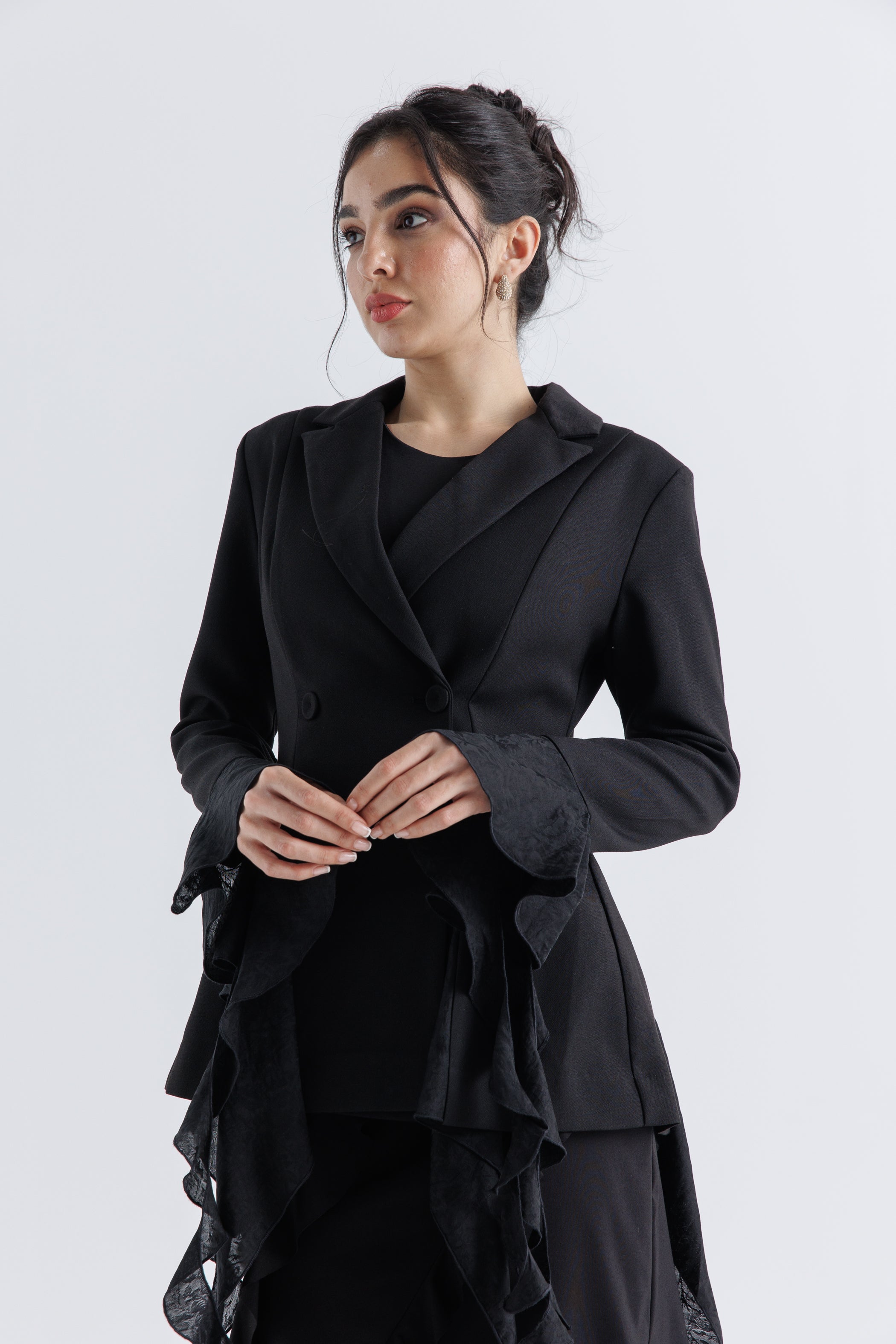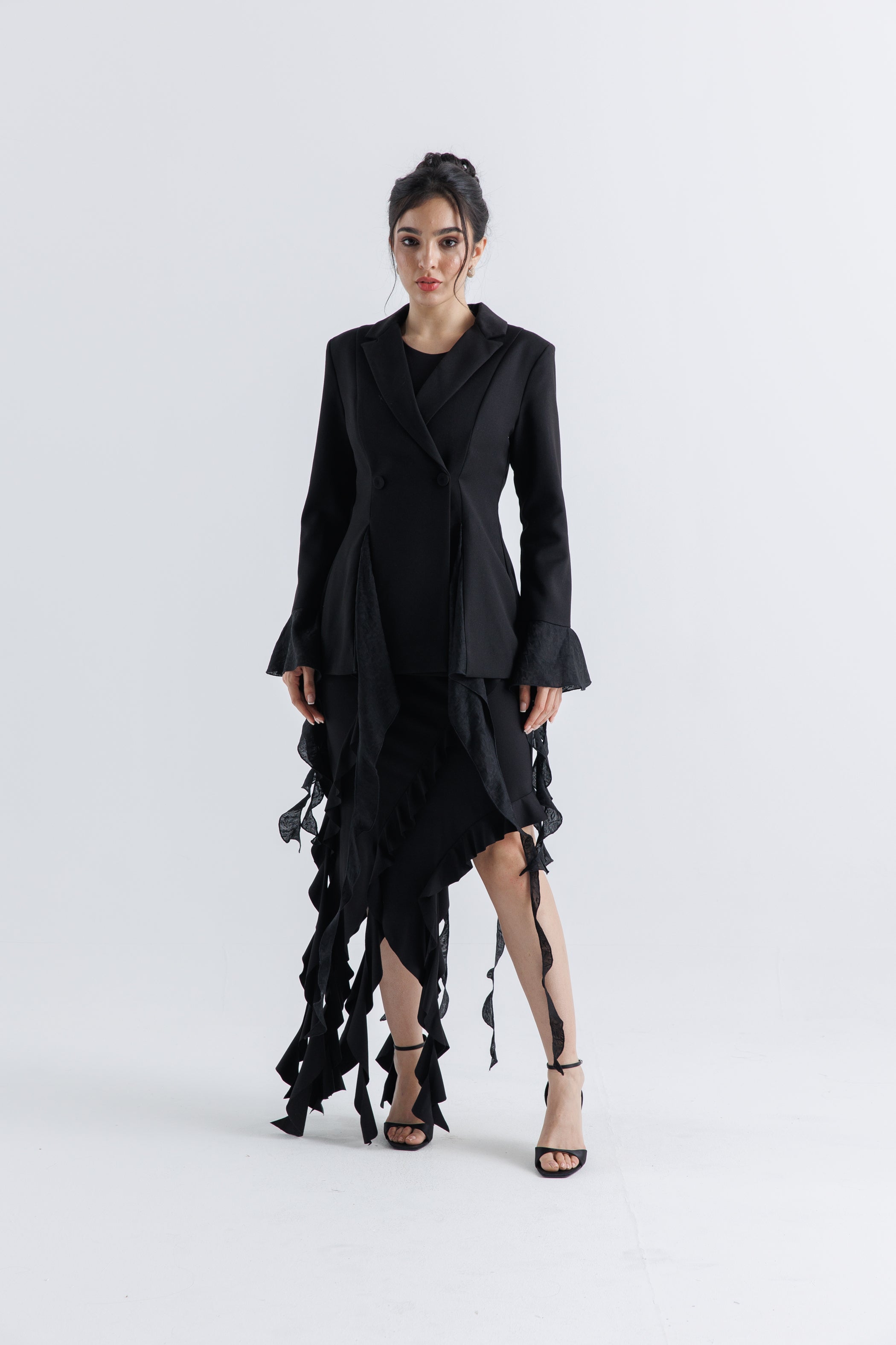 Refined elegance meets modern flair in this tailored double-breasted jacket. Crafted from structured woven fabric for a sleek silhouette, it features a notched lapel, fitted waist, and asymmetrical ruffle detailing that cascades along the sides and sleeve cuffs. The double-button front enhances its sharp tailored look, while the sheer textured ruffle panels bring fluidity and softness to the ensemble. Whether styled with matching pants or a statement skirt, this piece exudes contemporary sophistication.