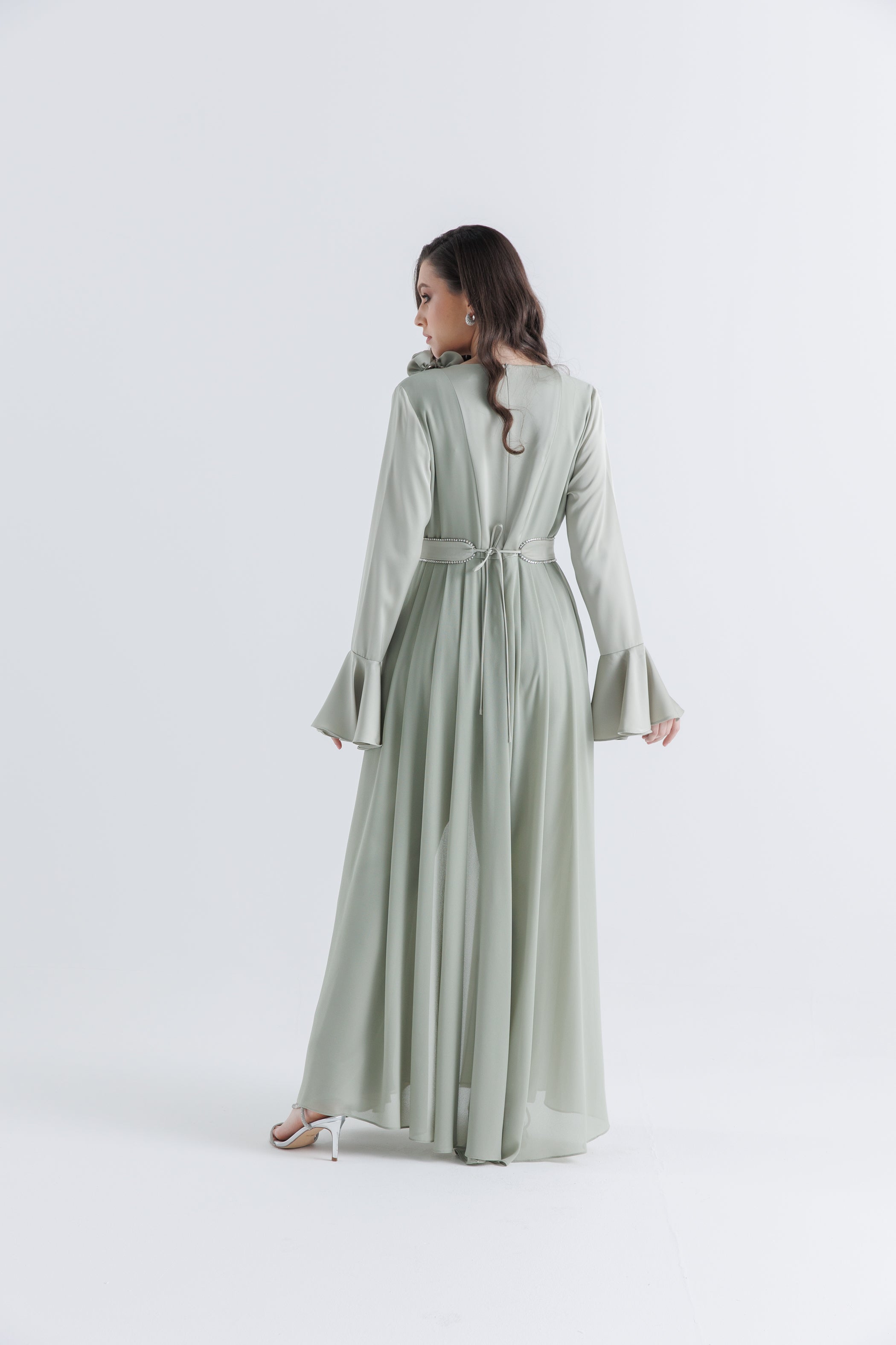 • Waist: Attached matching belt with 3D floral embellishment