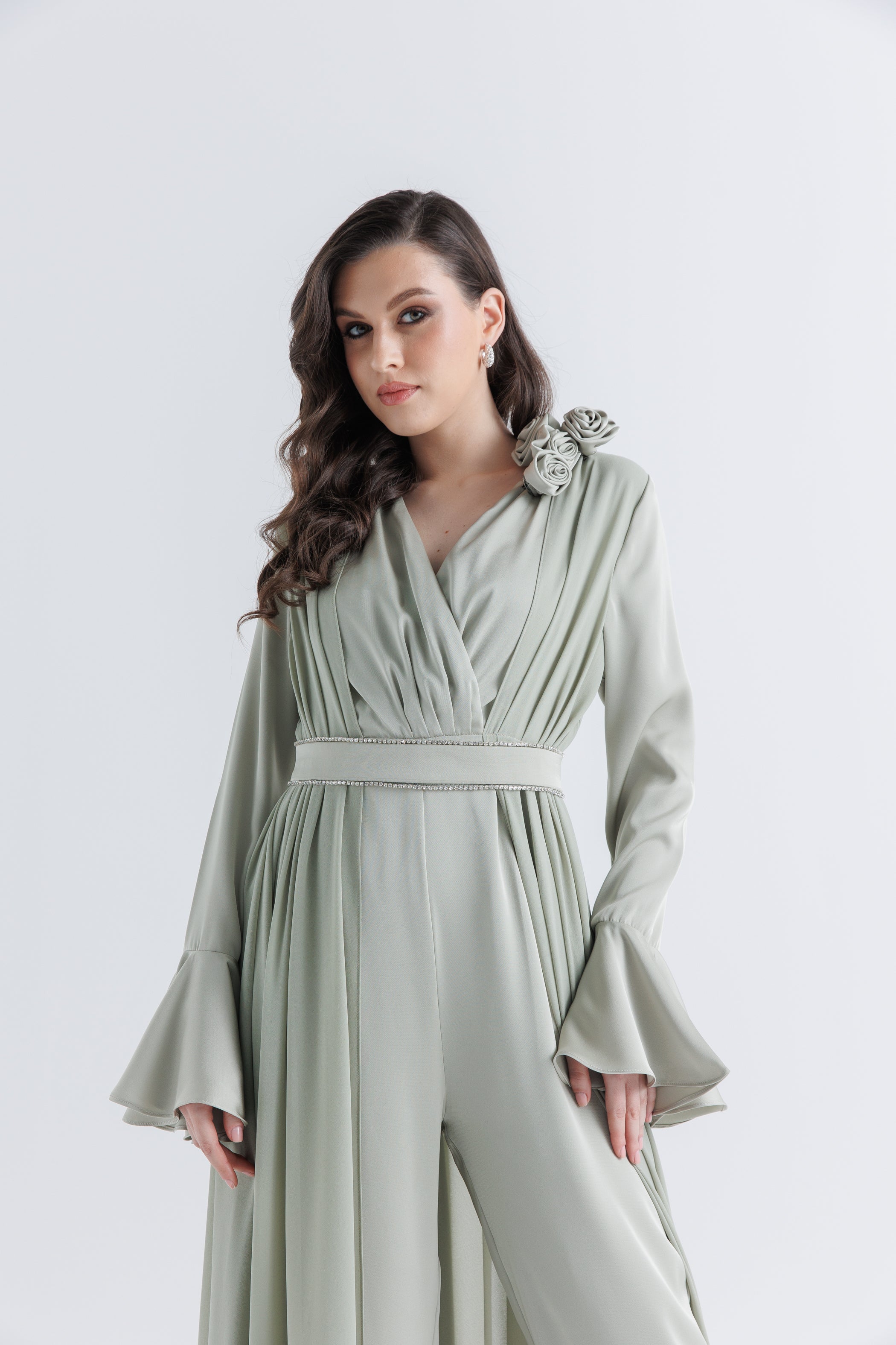 Bring effortless elegance to your wardrobe with this beautifully pleated jumpsuit, crafted from a luxurious mix of chiffon and satin. The design features a flattering V-neckline that enhances the neckline and frames the face, while the soft pleated texture adds fluidity and movement throughout the silhouette. A tonal fabric belt cinches the waist and is adorned with a delicate handcrafted flower, offering a romantic and feminine finish. The jumpsuit flows into wide-leg bottoms, giving the illusion of a coordinated two-piece set while providing the ease of a one-piece. Fully lined for comfort, this design is perfect for evening occasions, formal events, or standout daytime looks.