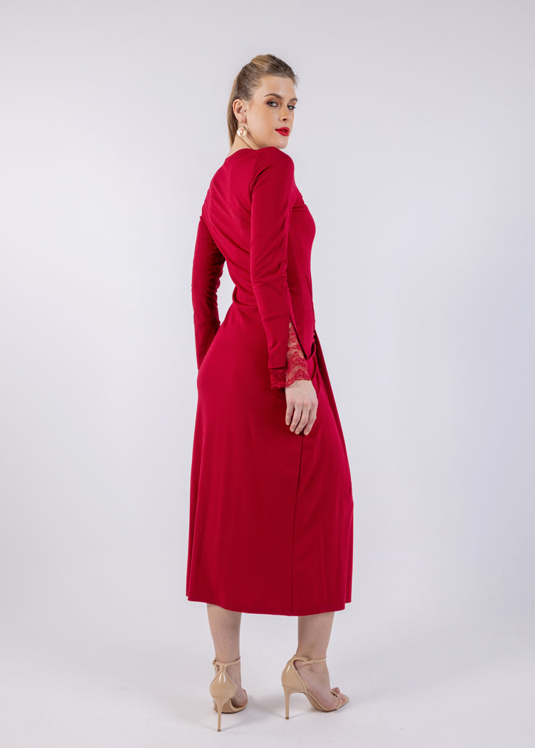 Solid Drapped Midi Dress with Lace Cuff Detail