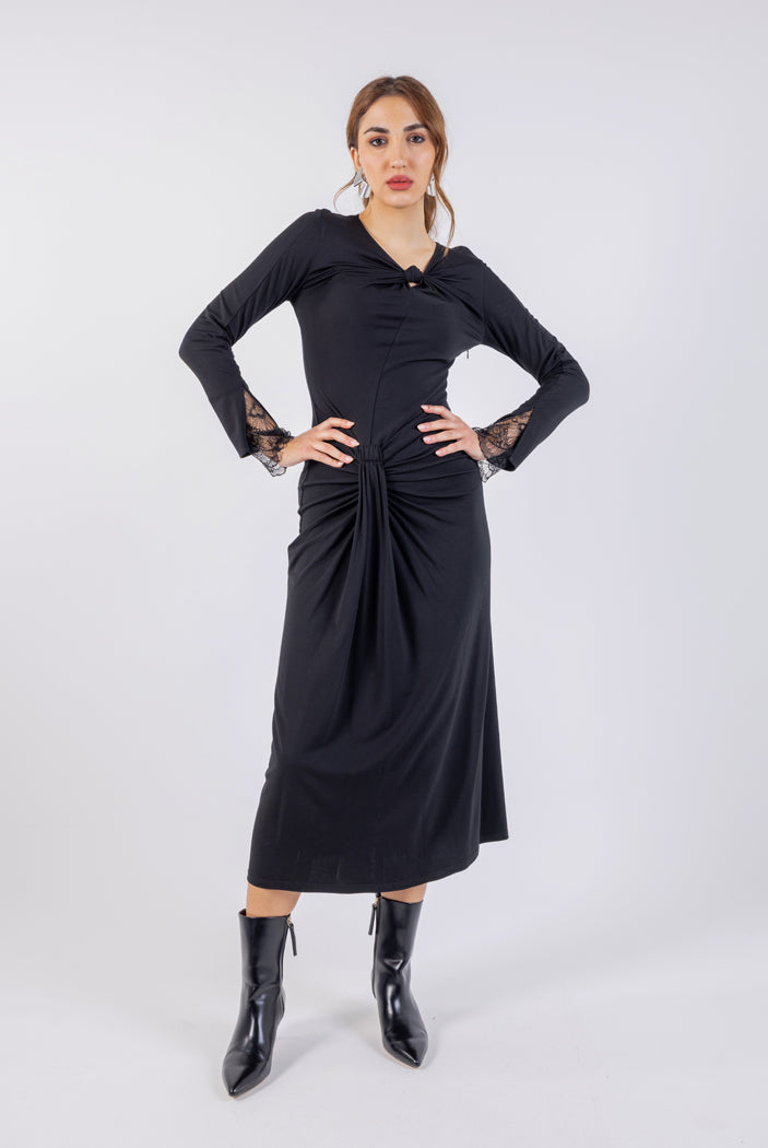Elegant solid midi dress featuring a chic drapped front and delicate lace cuffs on long sleeves. Perfect for a refined, timeless look, this dress pairs effortlessly with ankle boots for day-to-night sophistication.