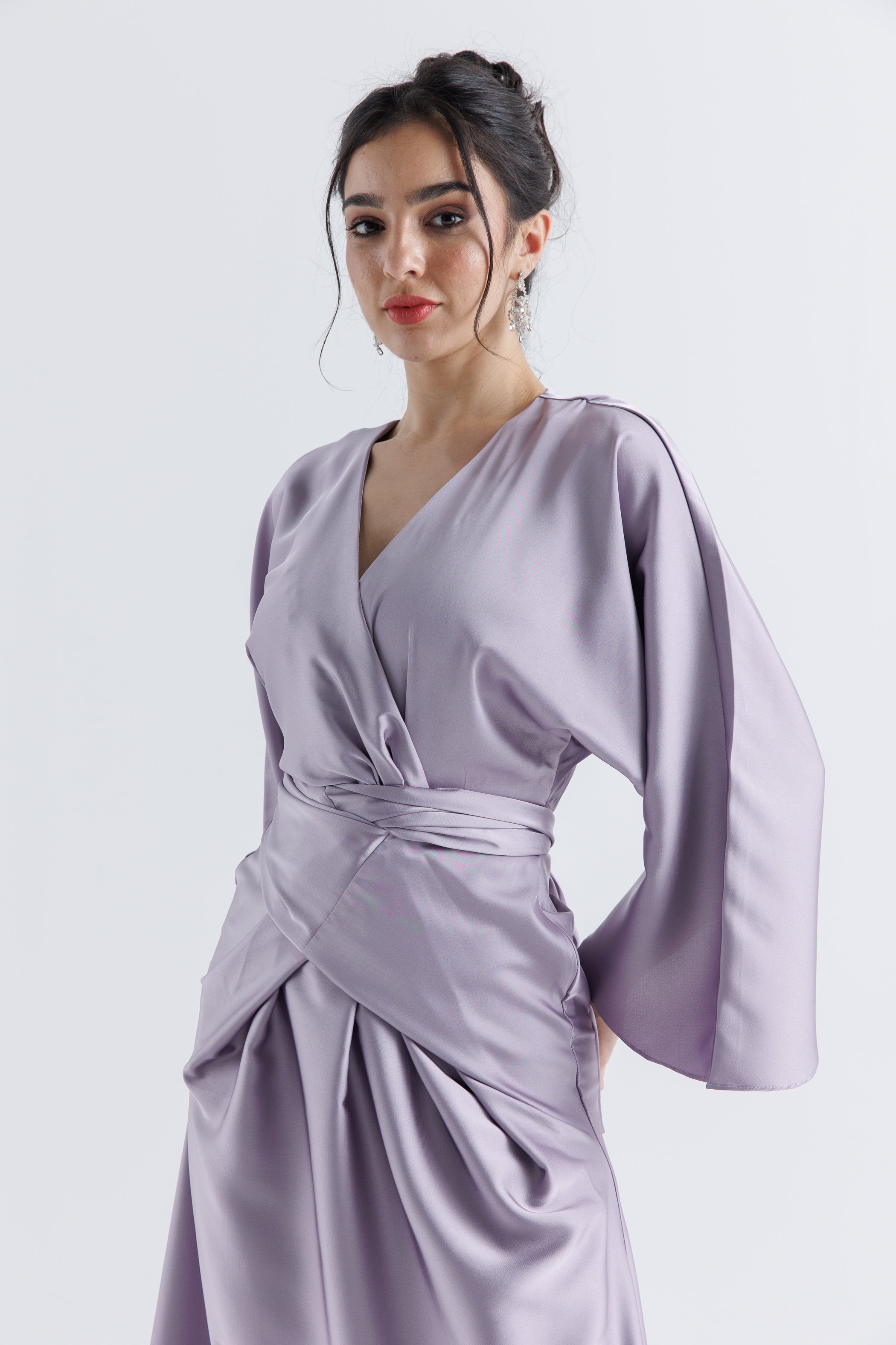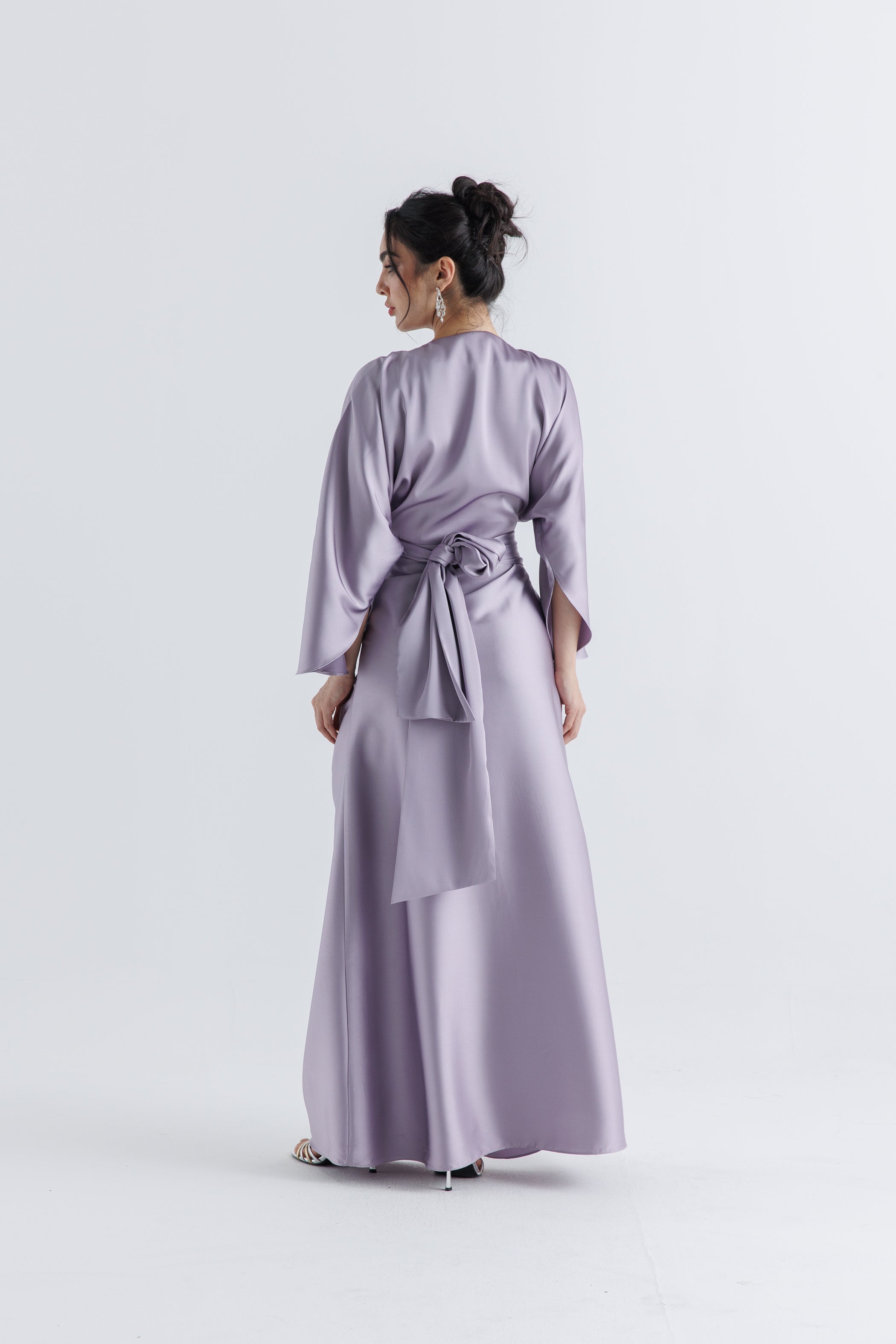 Sleek, soft, and effortlessly graceful—this wrap-effect satin maxi dress is a timeless piece for sophisticated occasions. Designed with a V-neckline and wide kimono-style sleeves, the dress features a beautifully gathered waist that ties into an elegant bow at the back. The fluid drape and subtle sheen of the satin fabric create a flattering silhouette that moves with elegance.