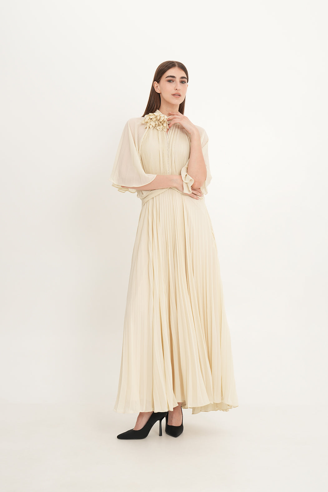 Elevate your elegance with this flowy chiffon maxi dress featuring delicate pleats and soft cape-style sleeves. The dress showcases a refined high neckline adorned with a removable flower detail that adds a romantic and customizable touch. A sculpted waistband cinches the waist for a flattering silhouette, while the full-length pleated skirt offers graceful movement with every step. The back features a subtle keyhole closure for ease and style. Fully lined for comfort, this dress is a perfect choice for weddings, formal dinners, or any elegant evening occasion.