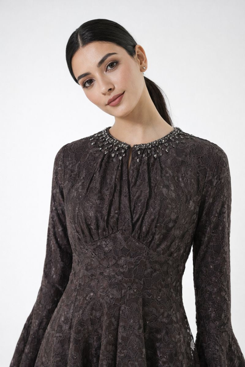 This elegant lace maxi dress from our Winter Collection is designed to deliver timeless sophistication with a refined, feminine silhouette. Crafted from delicate lace fabric and finished with a smooth inner lining for comfortable coverage, it features a fitted bodice that flows into a graceful full-length skirt—perfect for winter occasions and evening events.