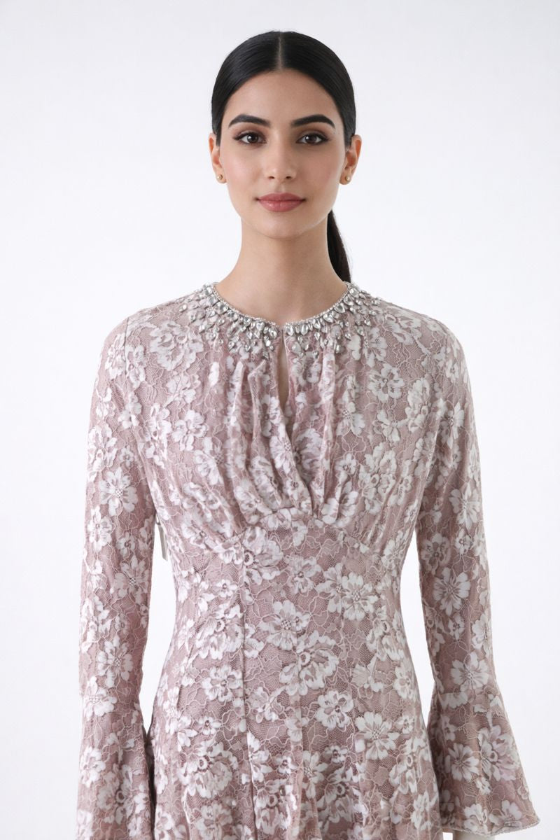 Embellished Lace Maxi Dress with Bell Cuffs