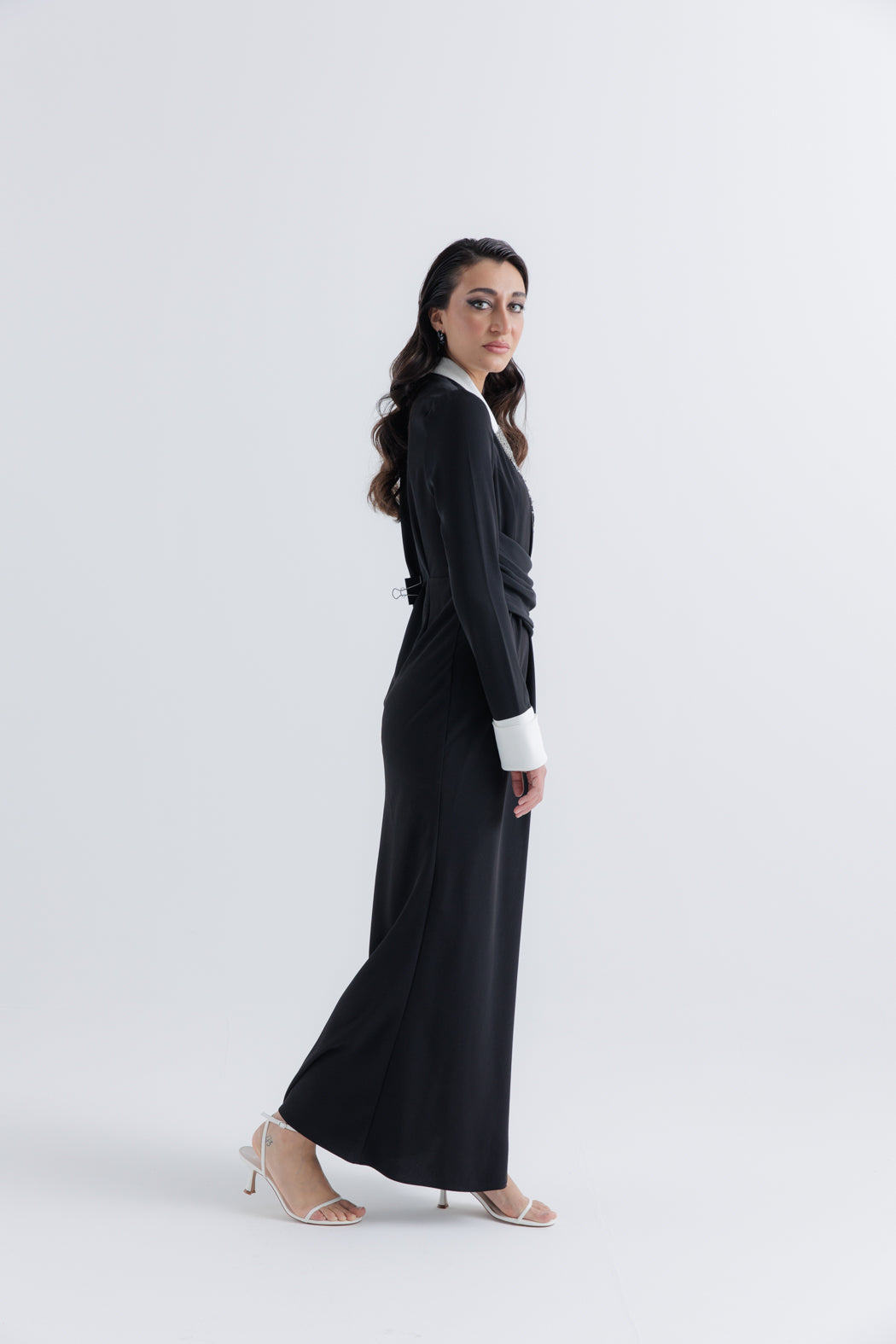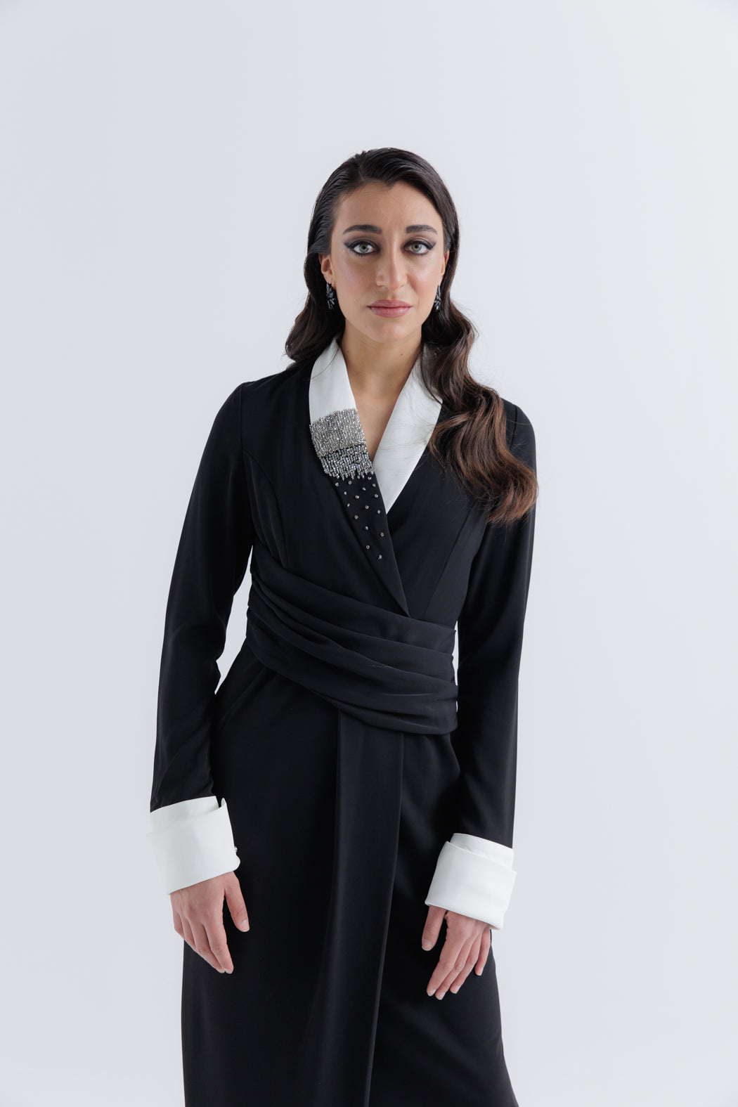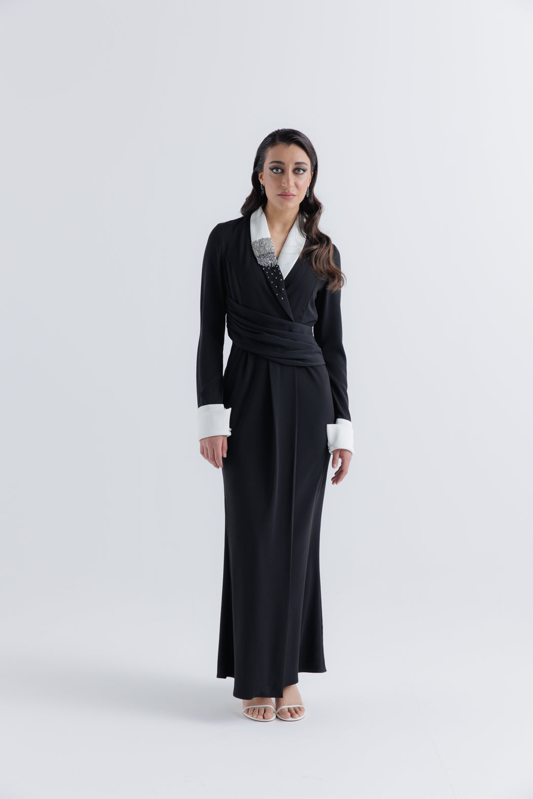 Make an unforgettable entrance with this exquisite black and white contrast gown, exuding sophistication and modern elegance. The artfully draped waistline enhances your silhouette, while the statement white lapel and cuffs add a touch of bold refinement. The intricately embellished lapel, adorned with shimmering beadwork, elevates this masterpiece—perfect for Eid celebrations and glamorous soirées.