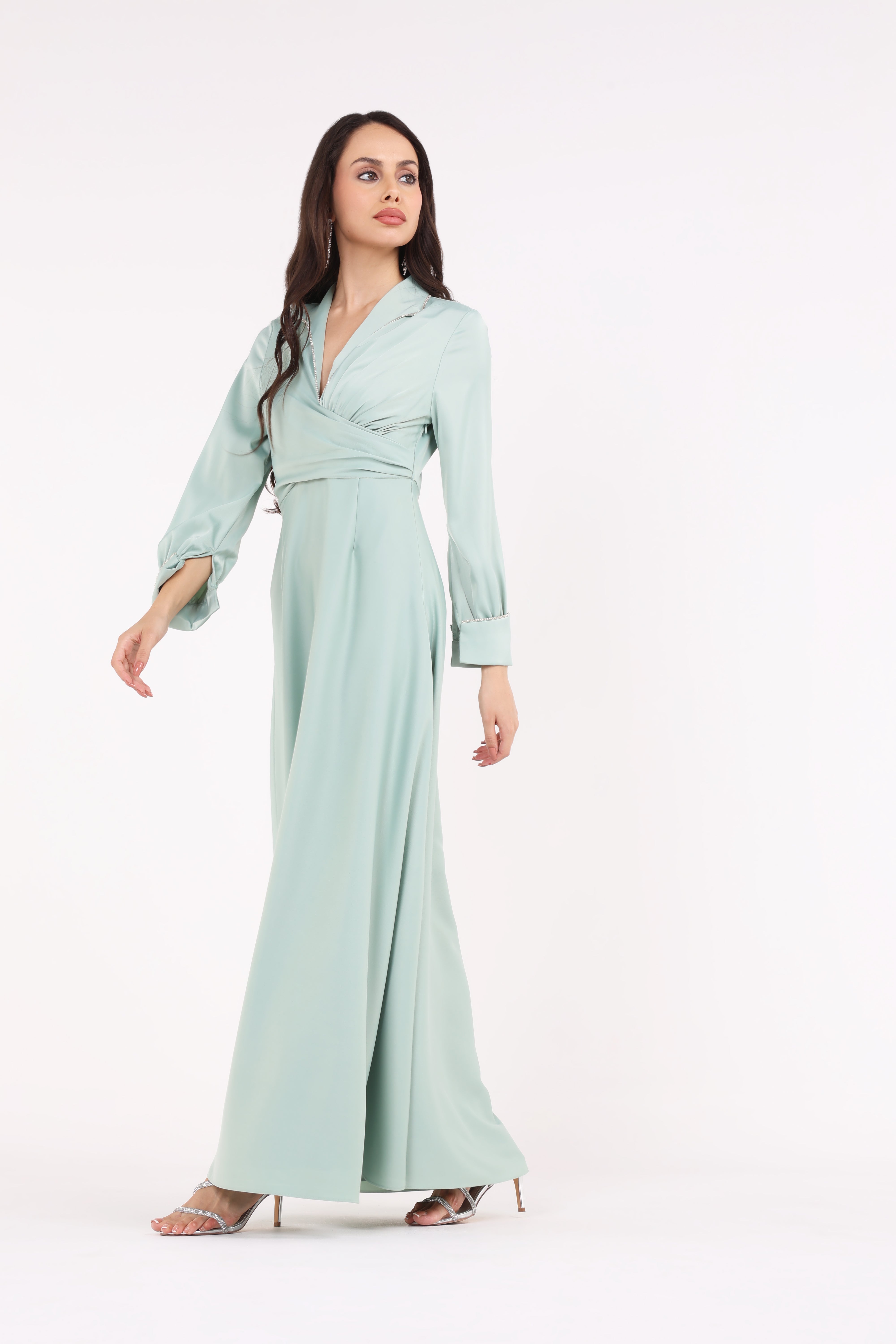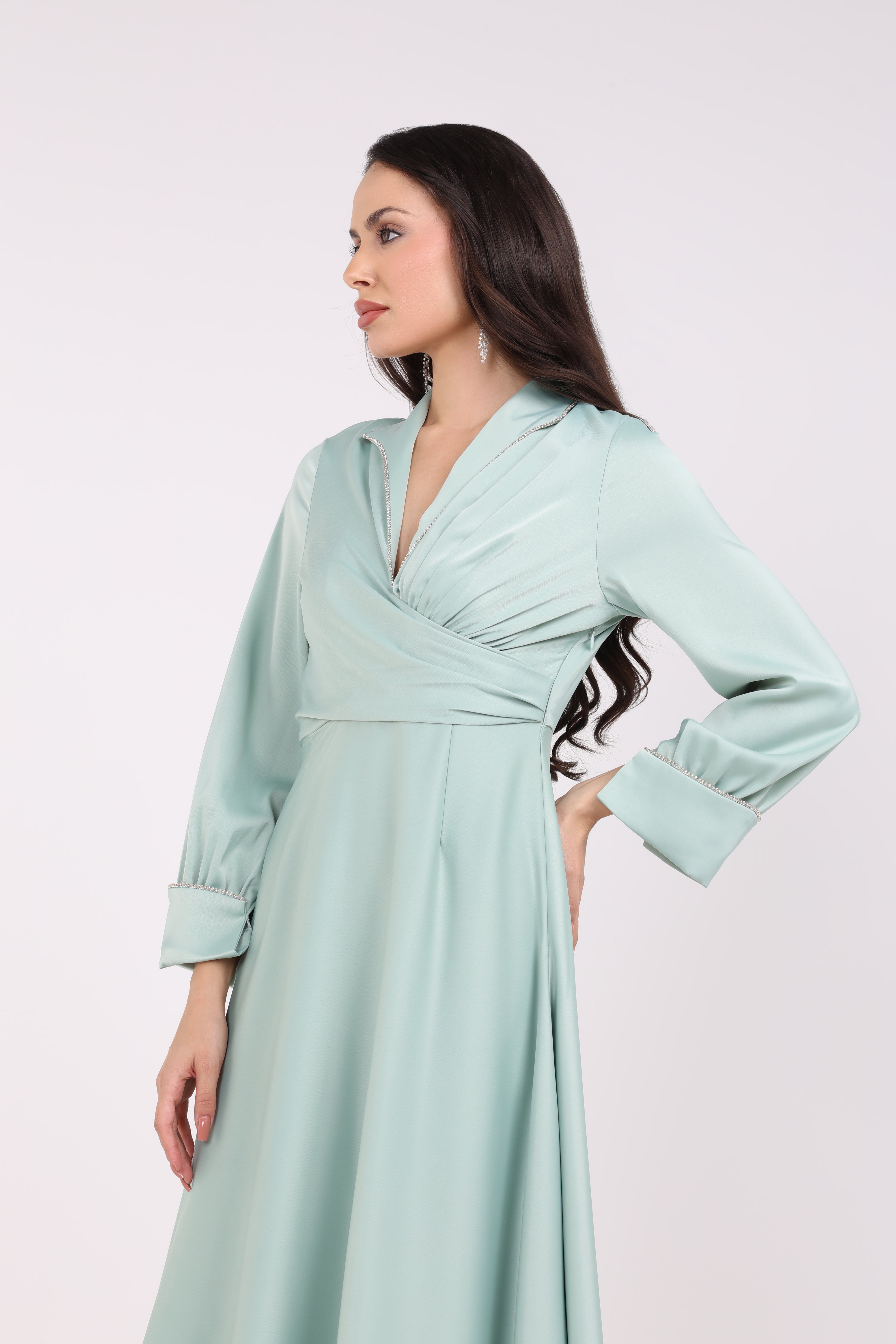 Step into sophistication with this flowy V-neck maxi dress, designed to blend elegance with comfort. Featuring a gracefully pleated collar, shimmering crystal accents, and a flattering A-line silhouette, this dress is perfect for formal occasions and evening gatherings. Its lightweight fabric and full lining ensure a smooth, luxurious drape that moves with you.