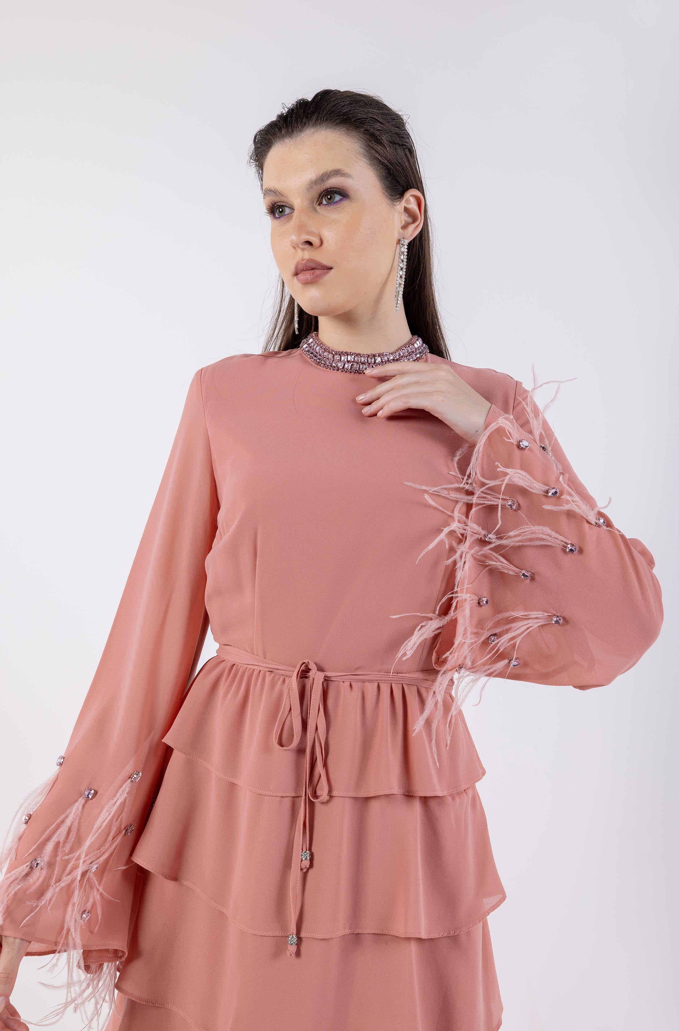 ruffles cascade gracefully, enhancing the feminine appeal, while the feather