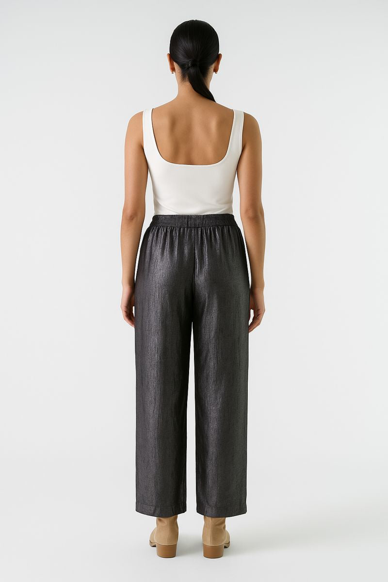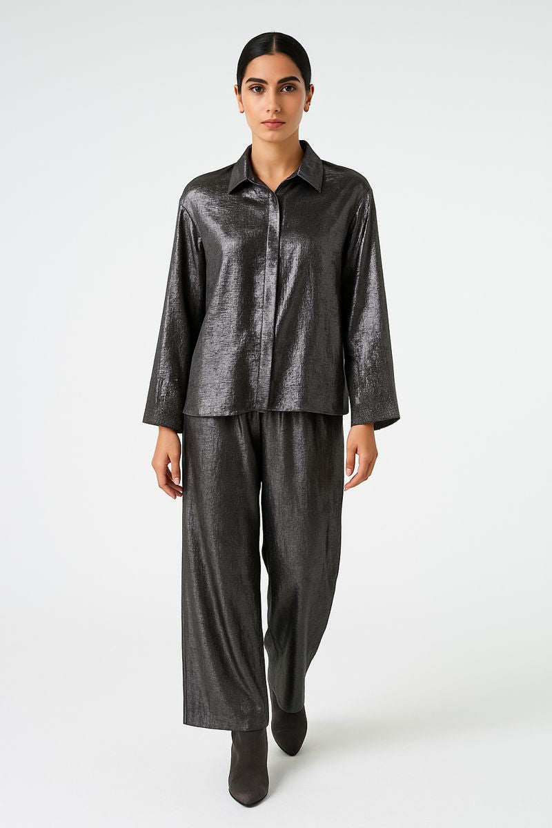 Designed for effortless elegance during Ramadan gatherings and Eid celebrations, this Metallic Finish Wide-Leg Pant combines comfort with refined luxury. Featuring a fluid drape and subtle metallic sheen, it offers a sophisticated look that transitions seamlessly from day to evening. The relaxed silhouette enhances movement while maintaining a polished, modest aesthetic suitable for festive occasions.