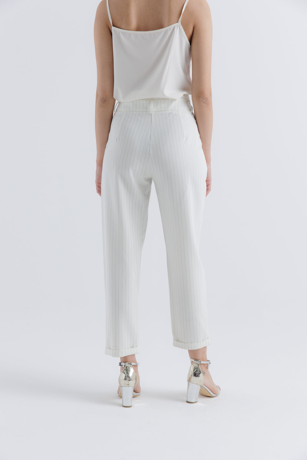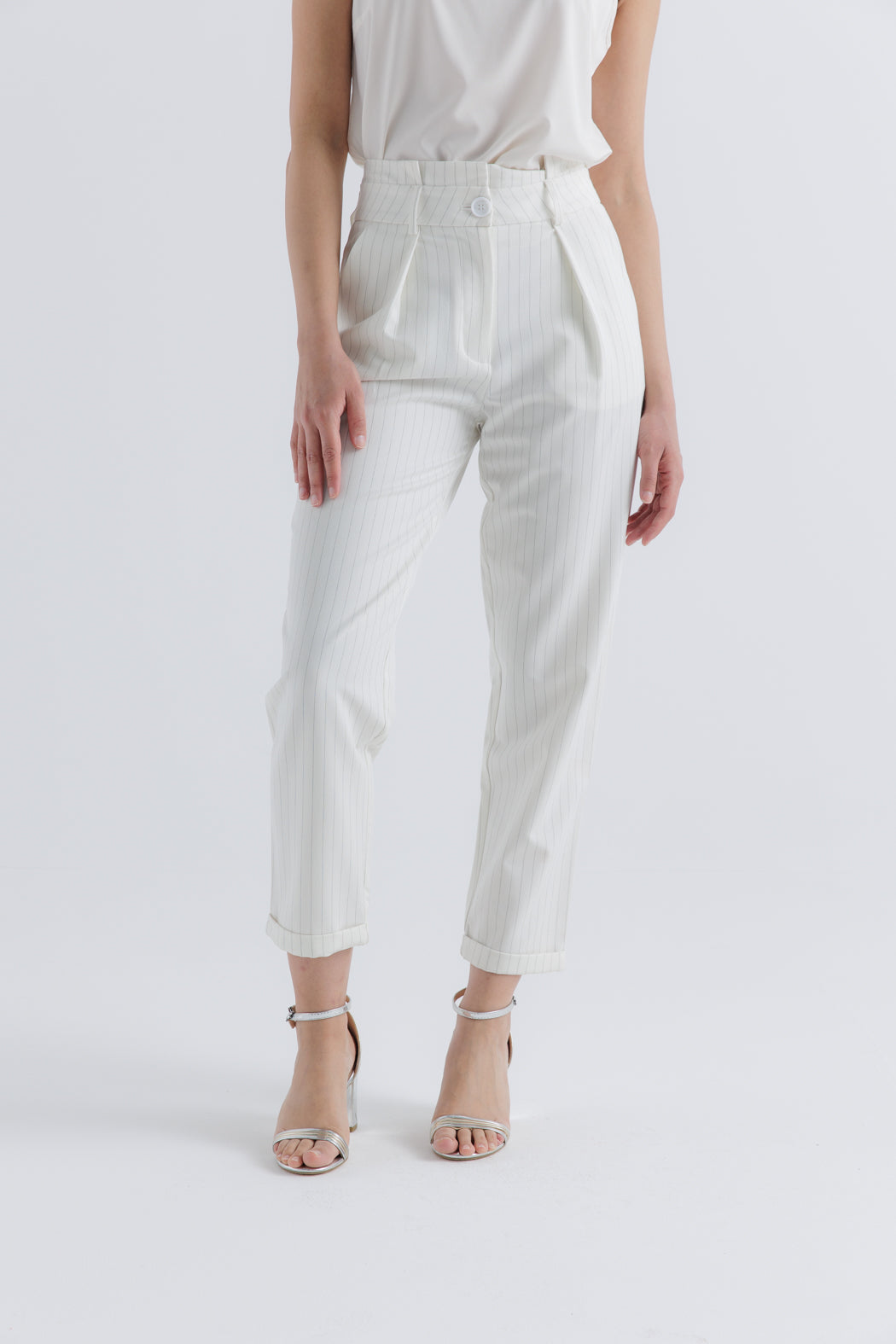 Refine your wardrobe with these sophisticated high-waisted pinstripe tapered pants, designed for an elegant and structured look. Crafted from premium-quality fabric, these pants offer a flattering tailored fit, making them perfect for both formal and smart-casual occasions. The high-waisted silhouette enhances the figure, while the pinstripe detailing adds a refined touch.